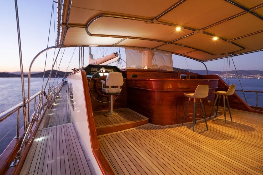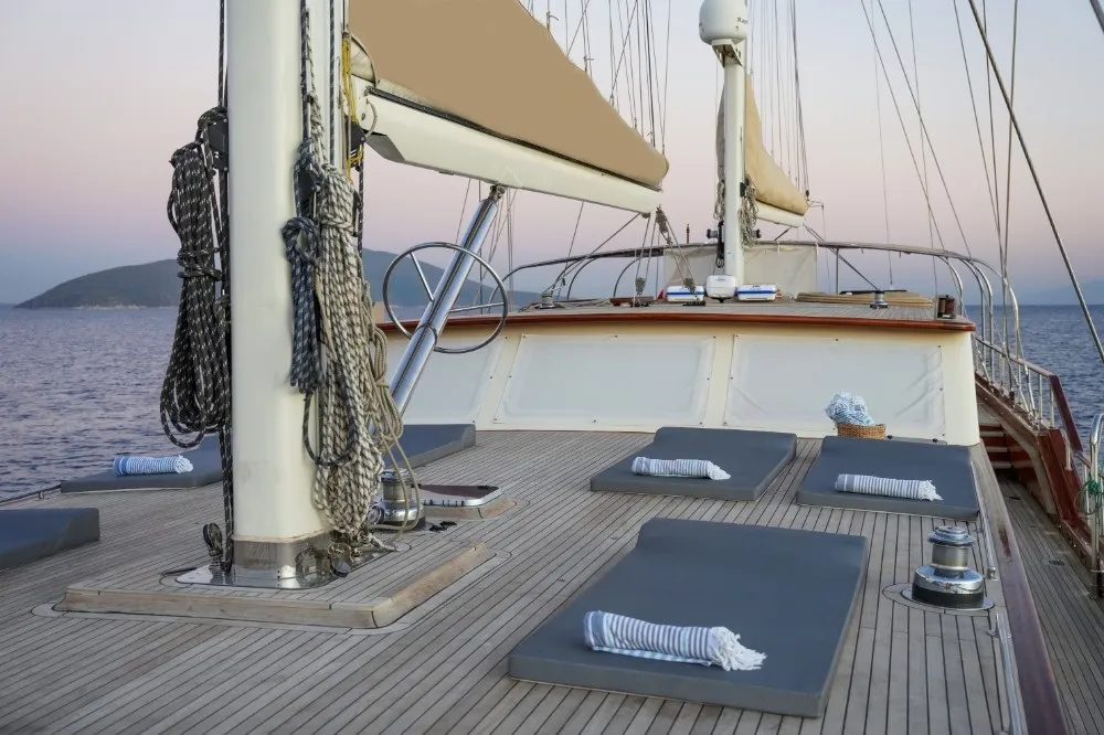 Teknemizin güvertesinde birinci sınıf tik ağacı kullanılmış olup, özel tasarım oturma alanları ve açılır tente ile ön güvertesi, güneşlenmek ve rahatlamak için mükemmel bir alandır. Arka güverte, yemek masası ve servis barı ile misafirlerin sosyal alan ihtiyacını karşılar. Yelken tutkunları için yelken donanımı da mükemmel seviyededir.