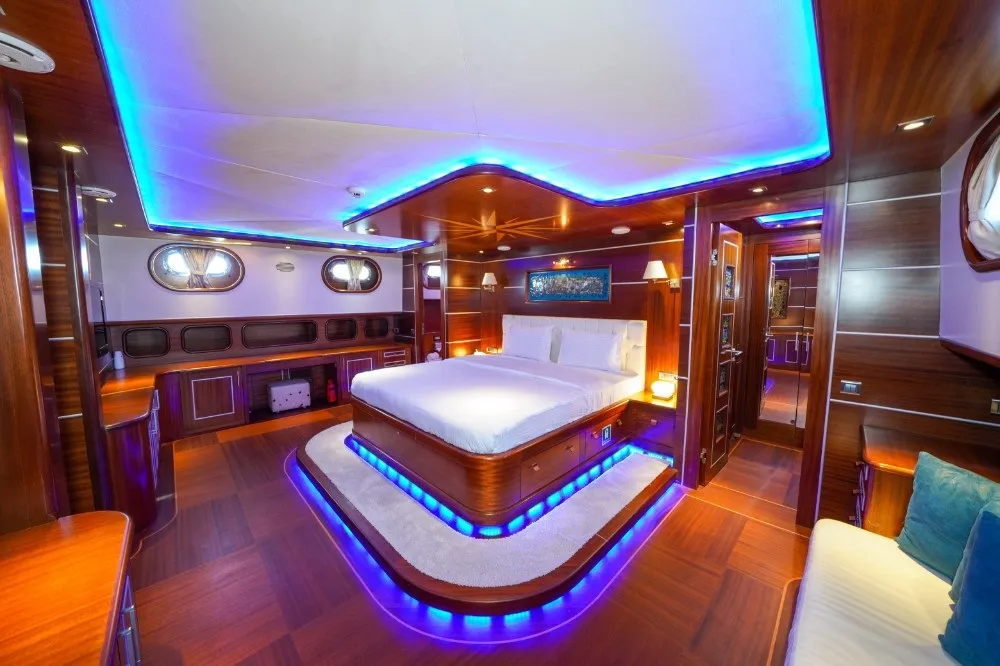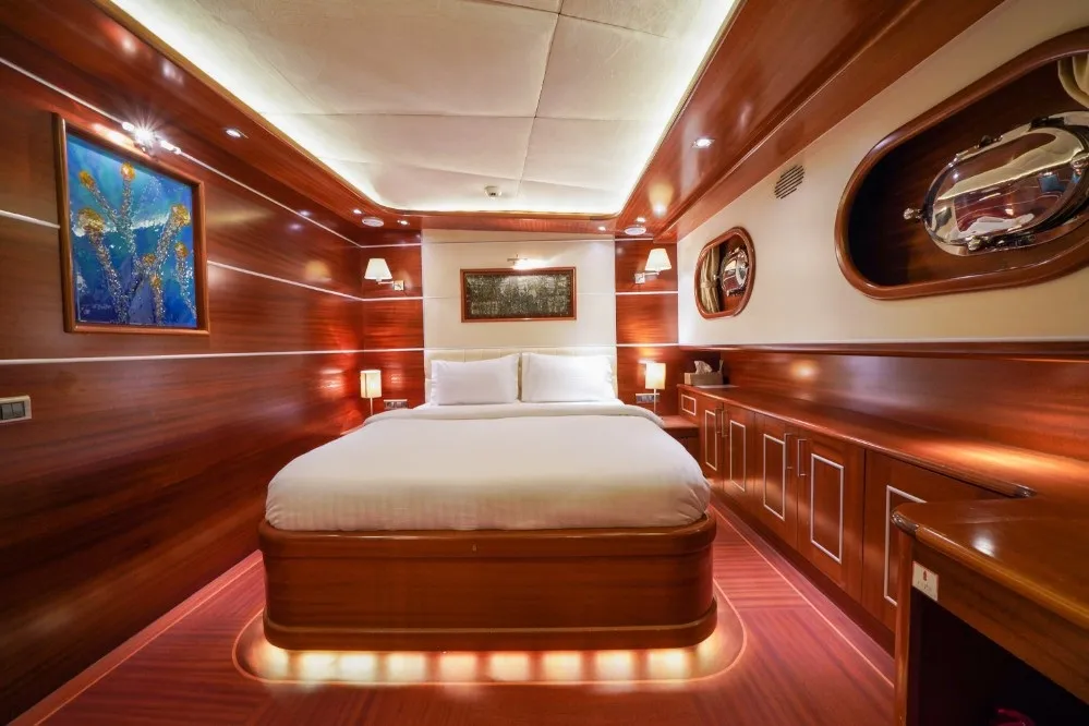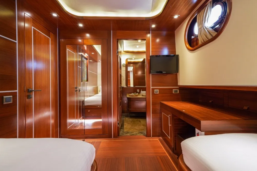 La Bella Vita Teknesi, her biri vitray, özel tasarlanmış aydınlatma, TV, müzik sistemi, kasa, minibar, internet, duşakabin, saç kurutma makinesi, buklet seti ve WC ile donatılmış lüks kabinleriyle konforu bir adım öteye taşır. Geniş salonumuzda şık bir yemek masası ve oturma grubu ile rüzgarlı havalarda keyifli zaman geçirebilirsiniz. Ayrıca, sauna imkanı ve serin sulara atlama şansı, tatilinize ekstra bir rahatlık katar.