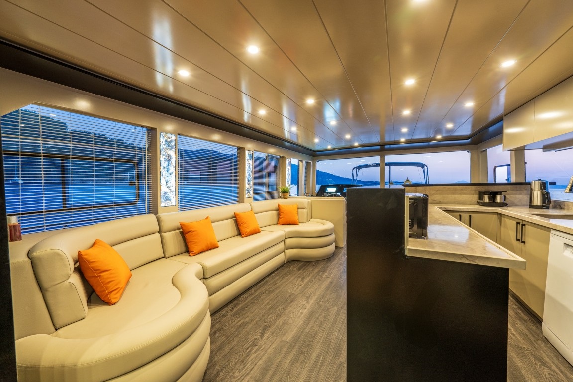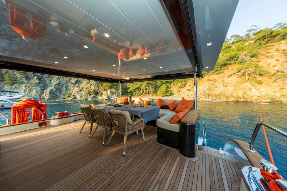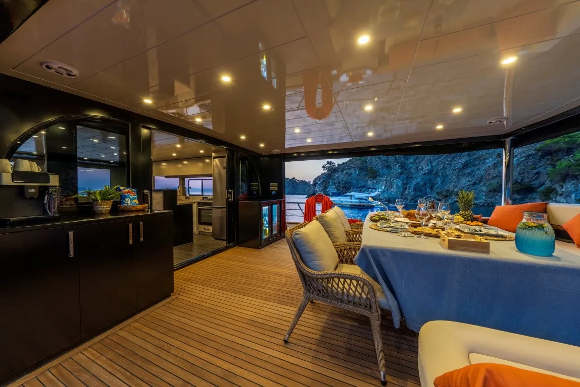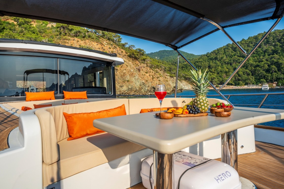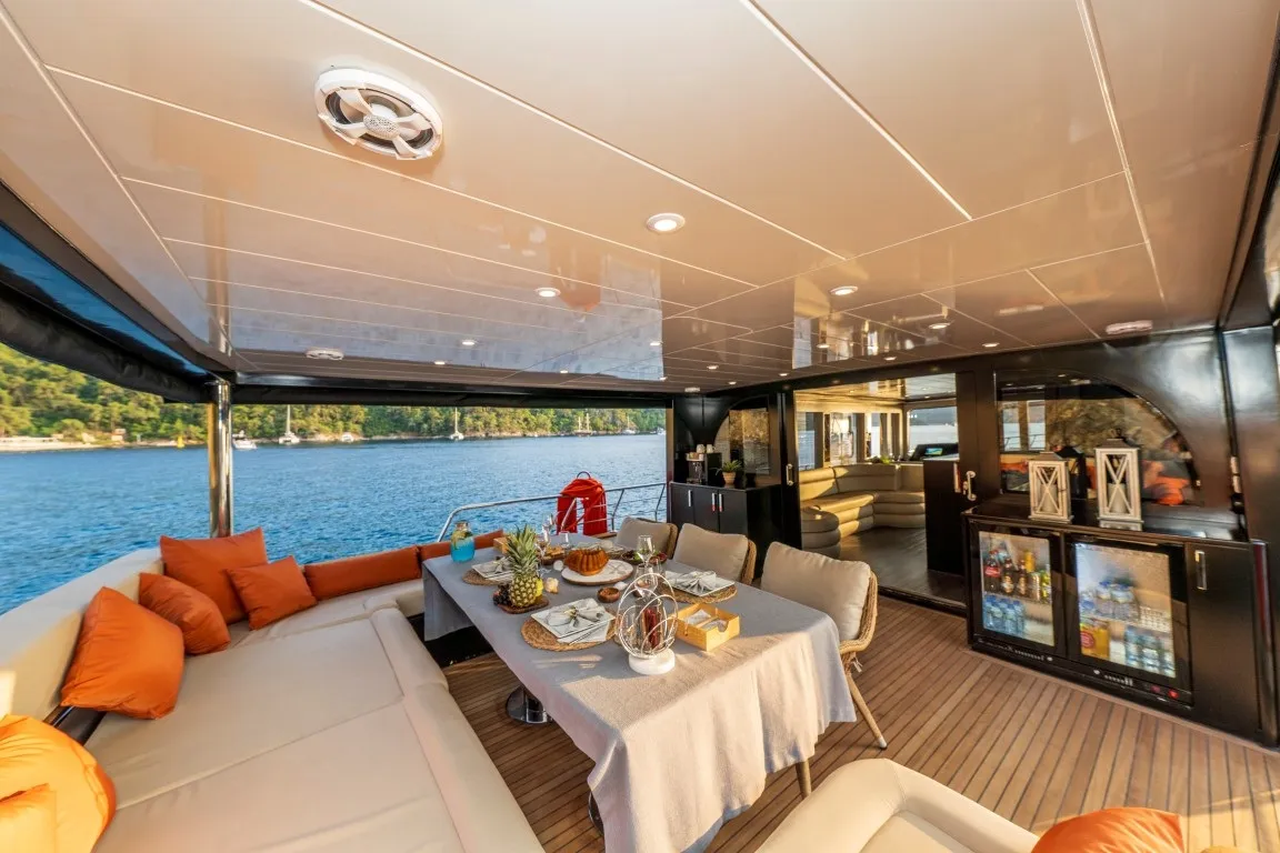 Arka güvertede geniş oturma alanı ve şık yemek masası, ön güvertede ise güneşlenme minderleri ile denizin tadını çıkarabileceğiniz alanlar sunulmaktadır. Ferah salon bölümü, oturma alanı ve dümenle bir araya gelerek rahat bir yaşam alanı oluştururken, mutfağı modern ve tam donanımlı ekipmanlarla hazırlanmıştır.