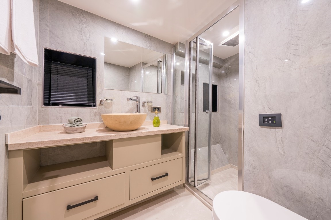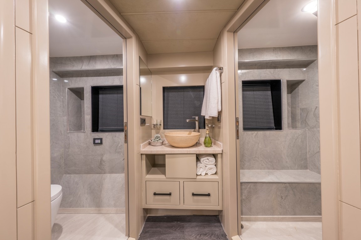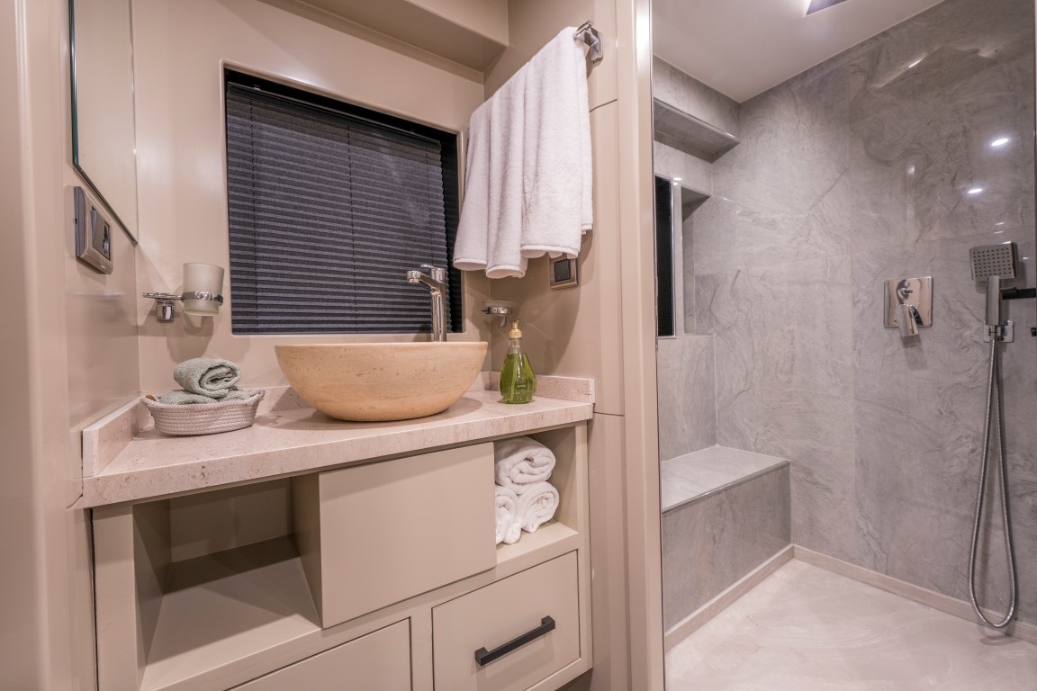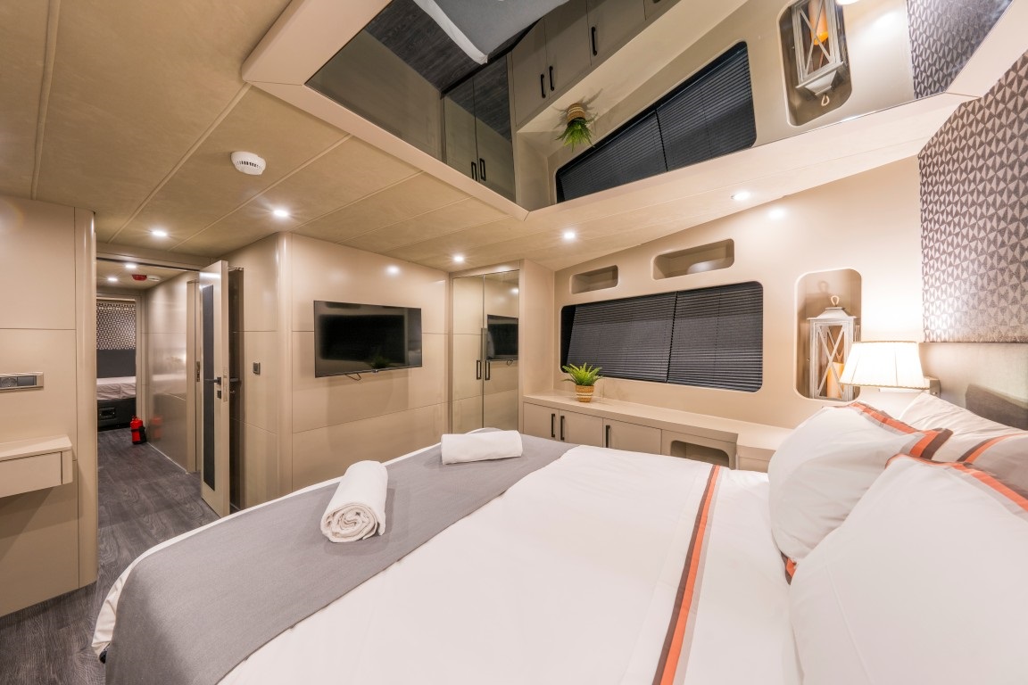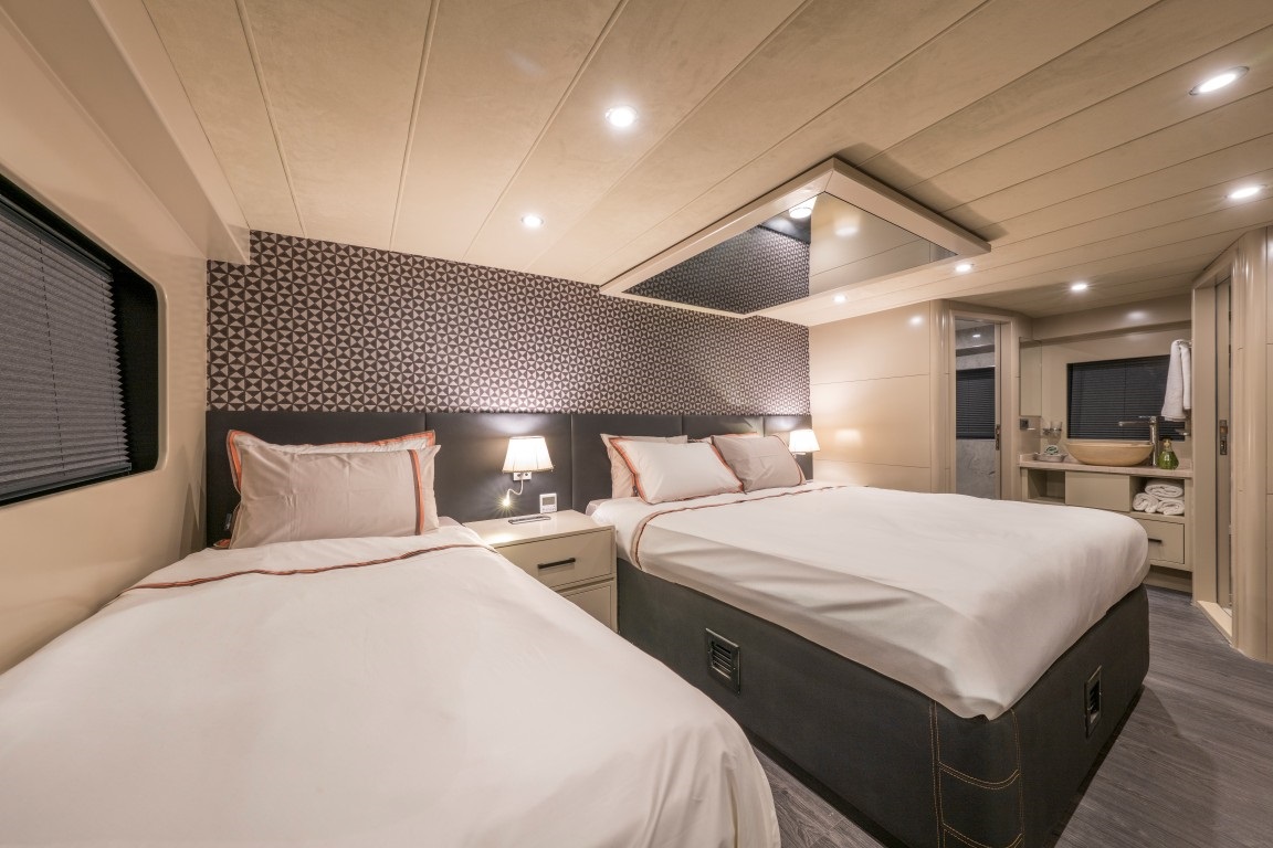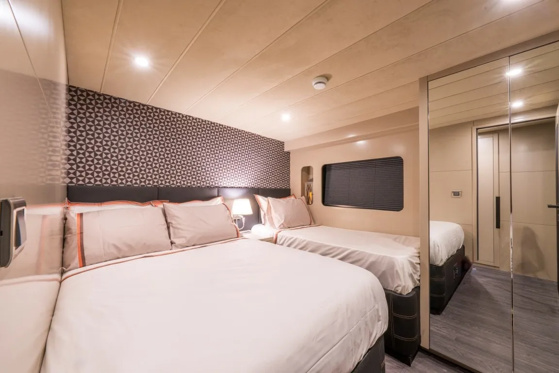 1 master ve 2 triple kabinden oluşan konforlu yapısıyla toplamda 8 kişilik kapasite sunan Jr Simay trawler, her kabinde klima, özel banyo ve özenle düşünülmüş lüks detaylarla konaklama imkânı sağlamaktadır.