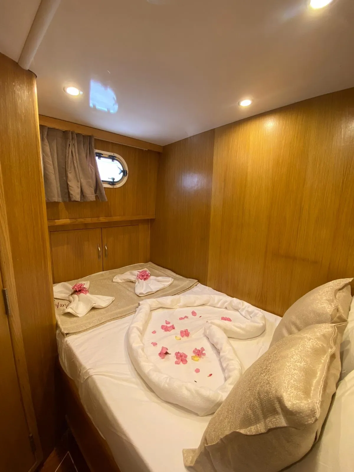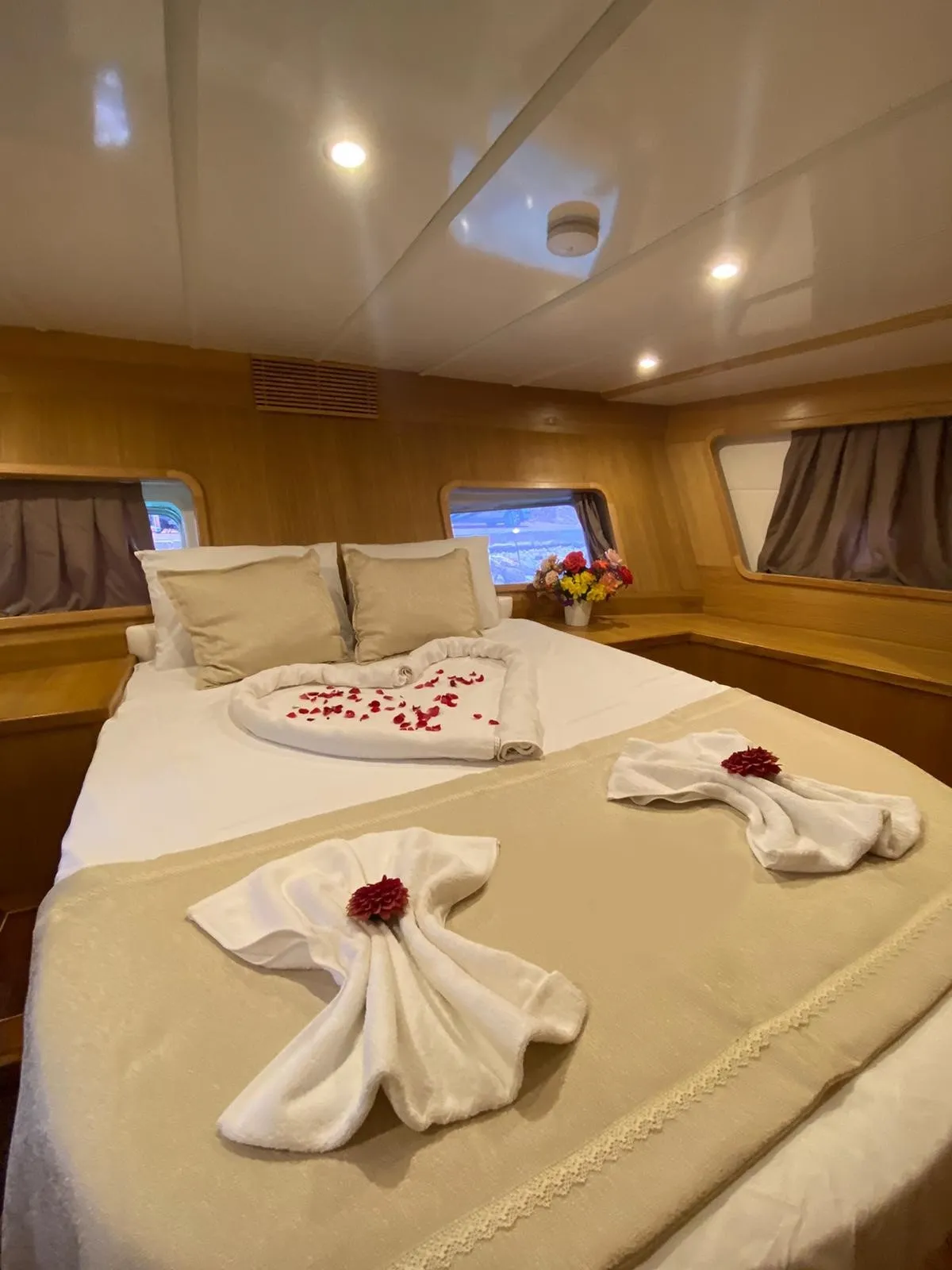 Teknemiz, 2 master ve 1 double olmak üzere toplam 3 geniş kabine sahiptir. Her kabin özel duş, tuvalet ve dolap alanı ile donatılmıştır. Ahşabın sıcak tonlarıyla bezenmiş kabinlerde, ev rahatlığında bir tatil sizi bekliyor.