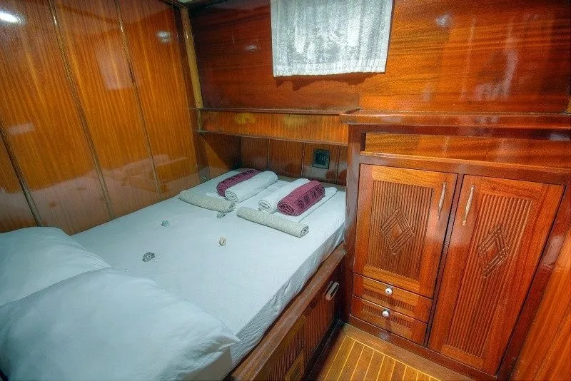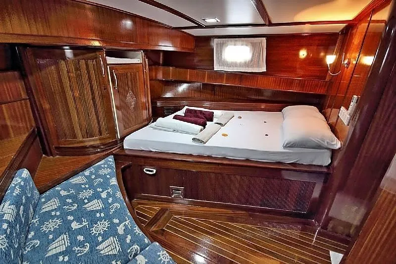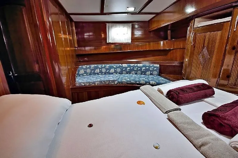 Guletimiz 1 ana kamara ve 2 double kamara olmak üzere toplam 3 kabinli tekne olarak 6 kişilik kapasiteye sahiptir. Baş kamaradaki oturma grubu yatağa dönüştürülerek kapasite 7 kişiye kadar çıkarılabilir. Tüm kamaralarda duş, tuvalet ve klima mevcuttur.