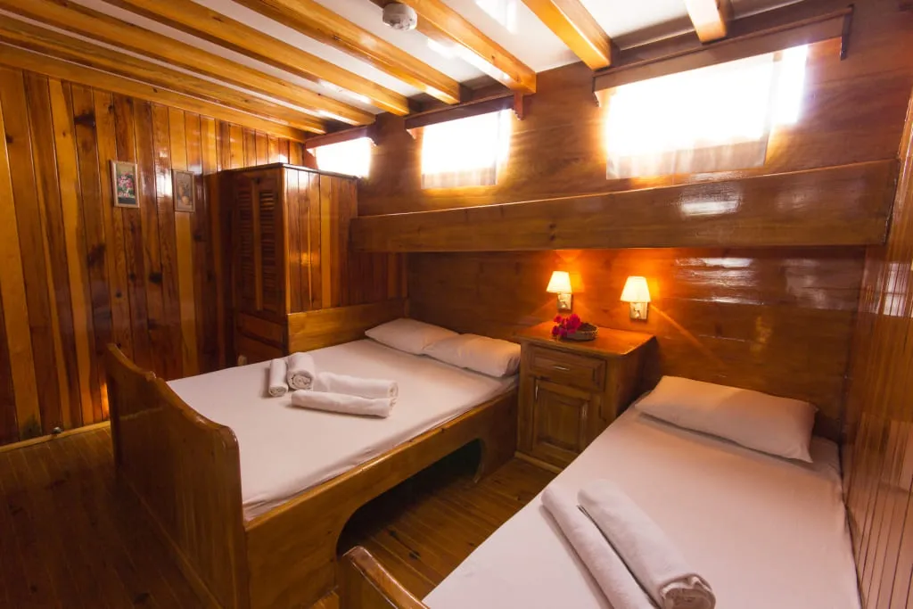Kabinlerin tamamında özel banyo ve WC bulunmakta olup klima mevcuttur. Kabin yerleşimleri teknenin planına göre yapılmakta, iki ayrı yatak garantisi verilememektedir. Kısa kabin kiralama anlayışıyla sunulan bu yaşam alanları, gün boyu deniz keyfinin ardından rahat bir dinlenme ortamı sağlar.