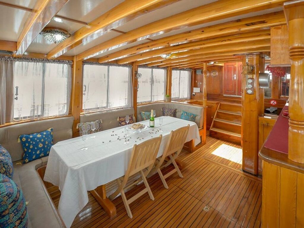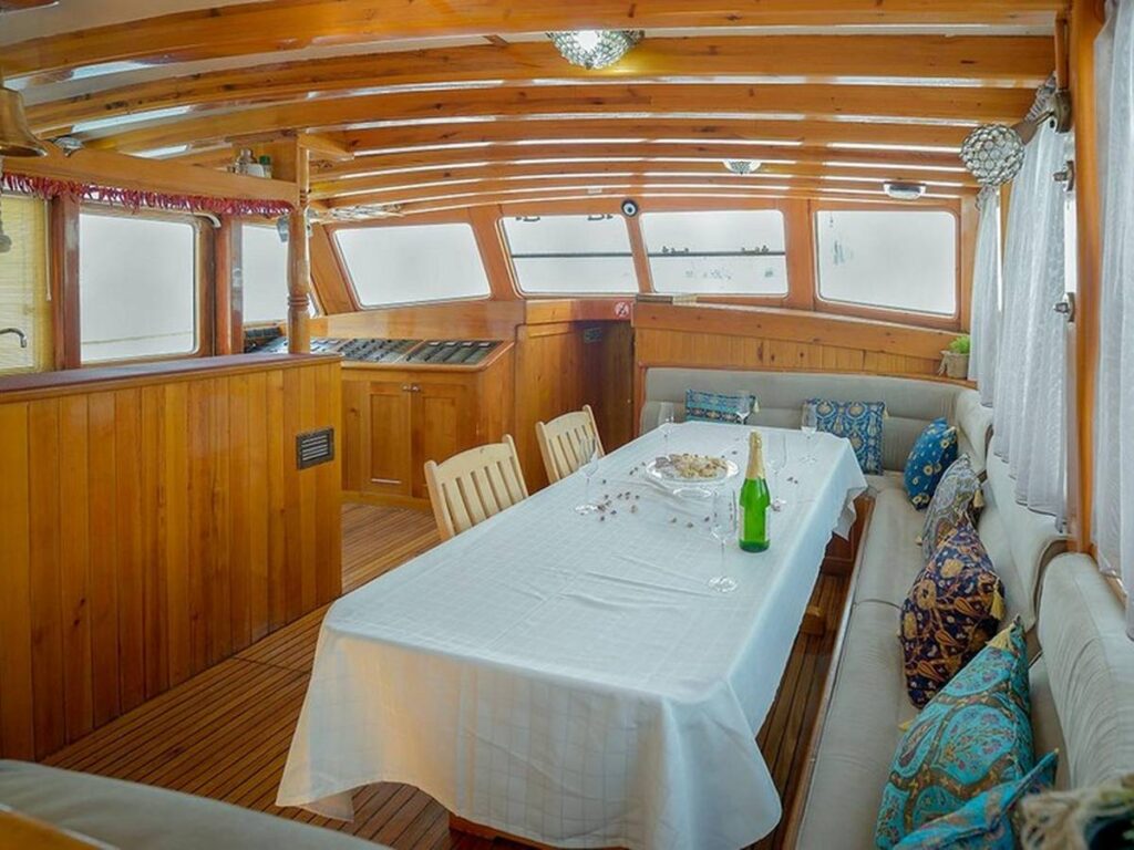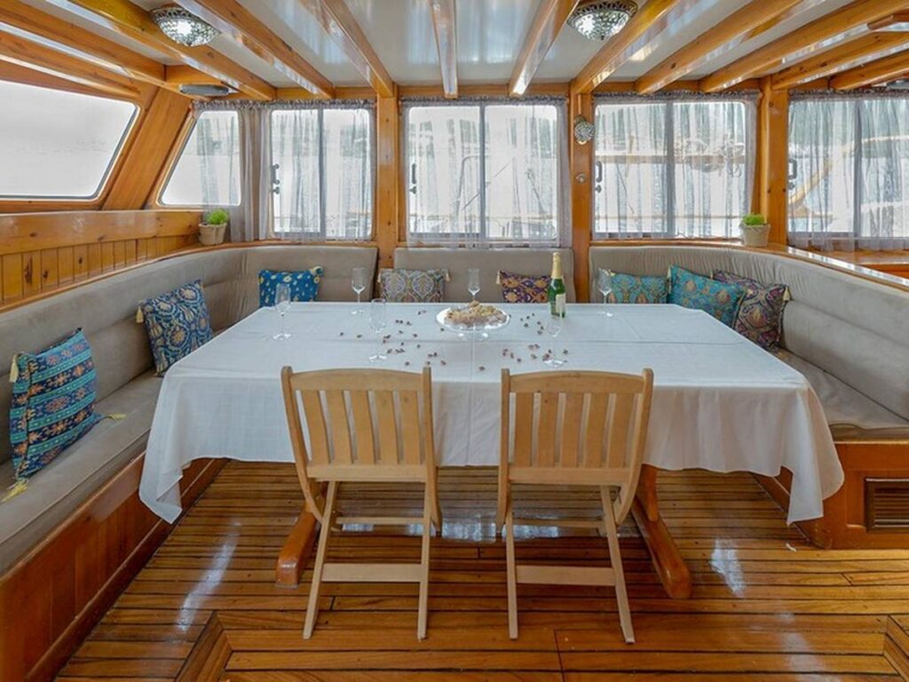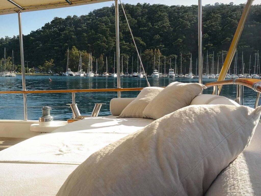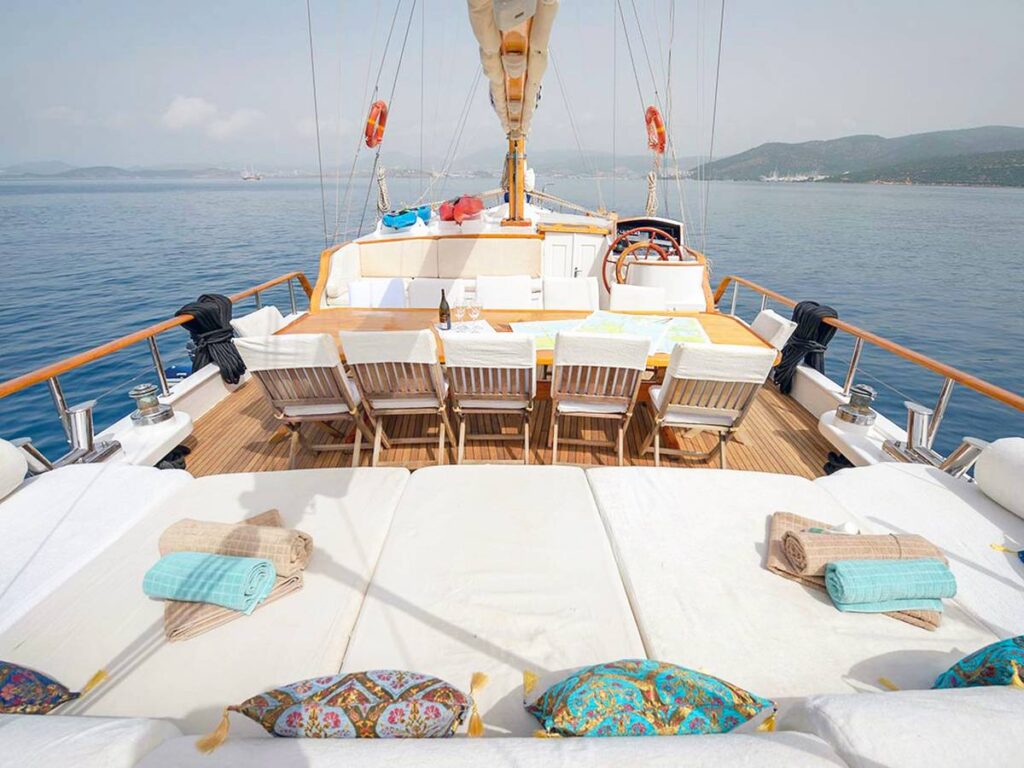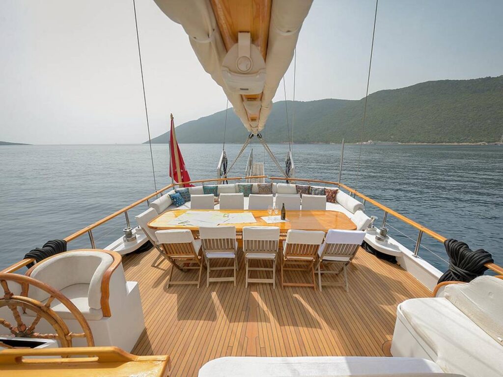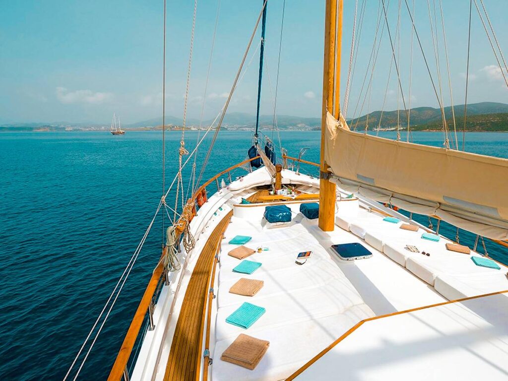 La Reine’in geniş güverte alanları, Yunanistan’da lüks gulet kiralama deneyimini tam anlamıyla yaşamak isteyen misafirler için tasarlanmıştır. Ön güvertede geniş güneşlenme minderleri ve dinlenme alanları bulunurken, kıç tarafta açık hava yemek masası ve konforlu oturma grubu yer alır. Gün batımında Zakynthos koylarında demirleyip denize karşı akşam yemeği yemek, bu teknenin sunduğu en özel anlardan biridir. Deniz ve hava şartlarına bağlı olarak günlük yelken seyri de yapılabilmektedir.