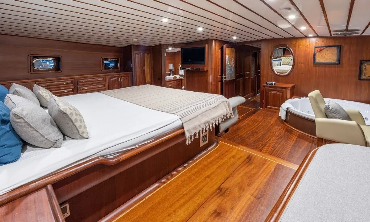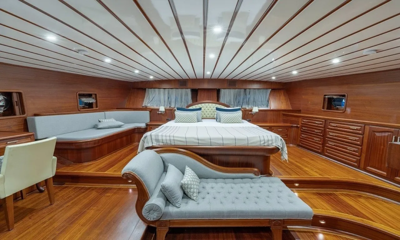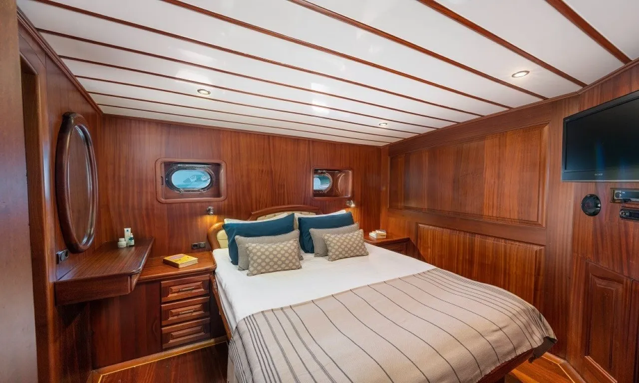 Teknemiz, 2 master ve 3 double kabin olmak üzere toplam 5 kabinde 10 misafire kadar konaklama imkanı sunar. Tüm kabinlerde özel duş, wc ve 24 saat hizmet veren klima sistemi bulunmaktadır. Geniş salon ve güverte alanları, mavi yolculuk boyunca hem dinlenmek hem de sosyalleşmek isteyen konuklar için ideal olarak tasarlanmıştır.