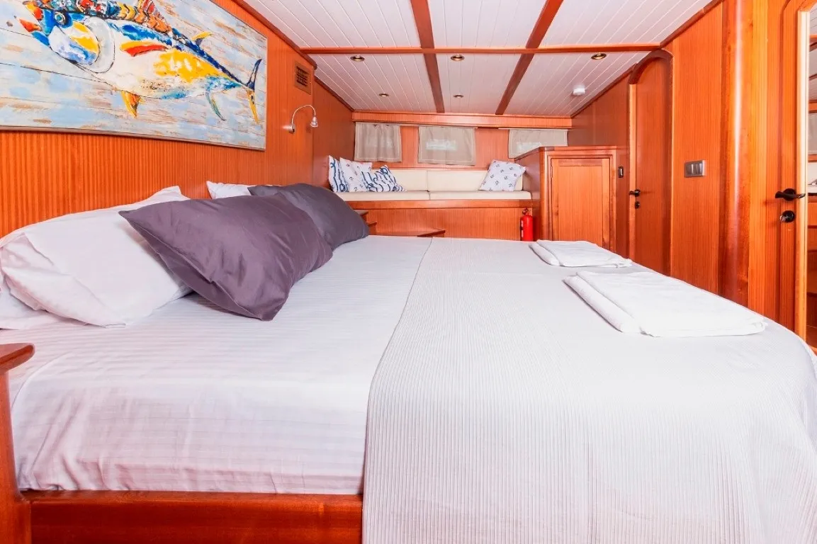 27 metre uzunluğundaki Bodrum Queen Gulet, şık ve konforlu 2 master ve 4 double kabiniyle toplamda 12 kişiye kadar olan grupları ağırlayabilmektedir. Her biri alanında profesyonel olan 4 kişilik mürettebatımız, mavi yolculuğunuz boyunca sizlere eşsiz bir hizmet sunacaktır.