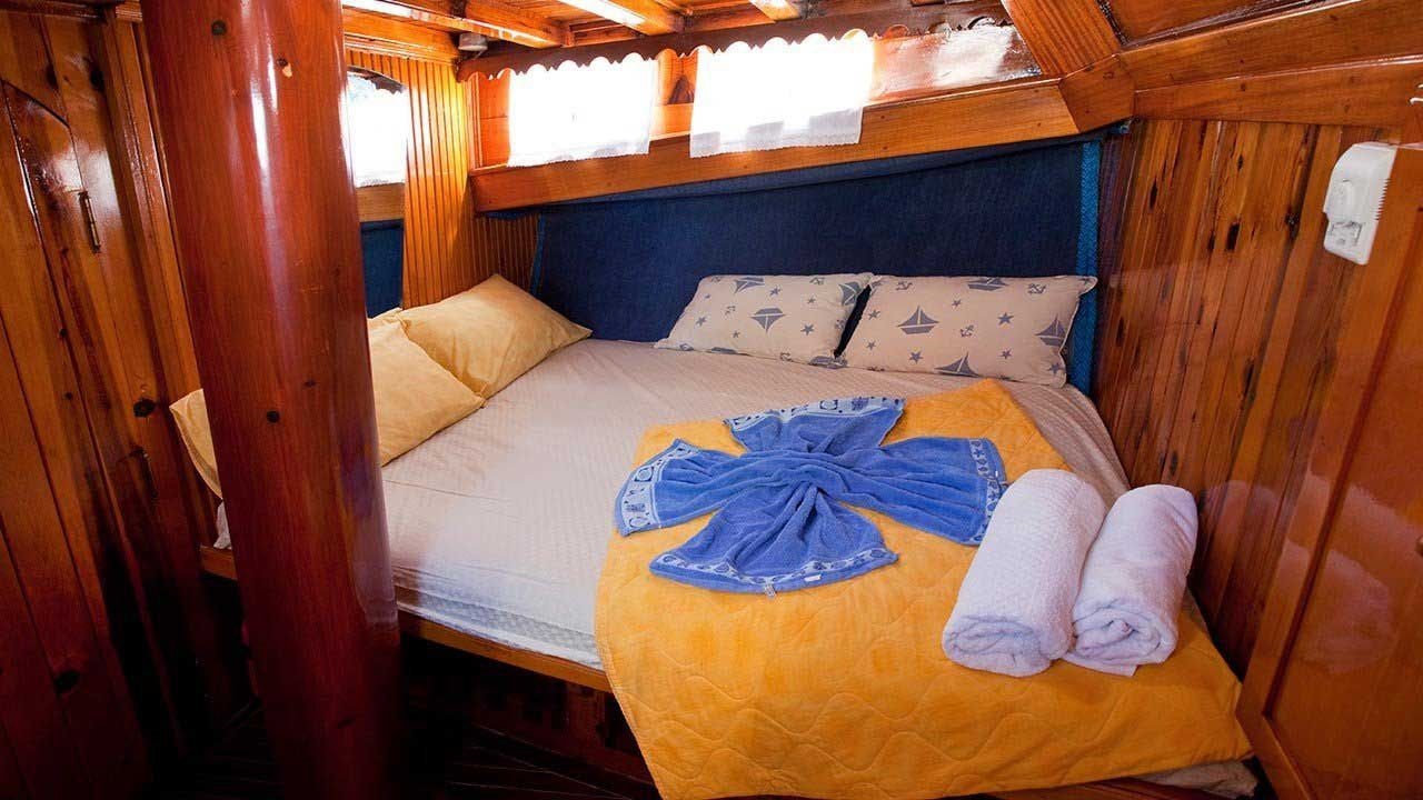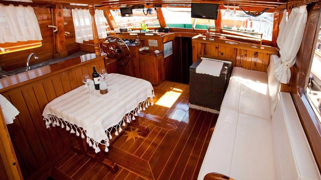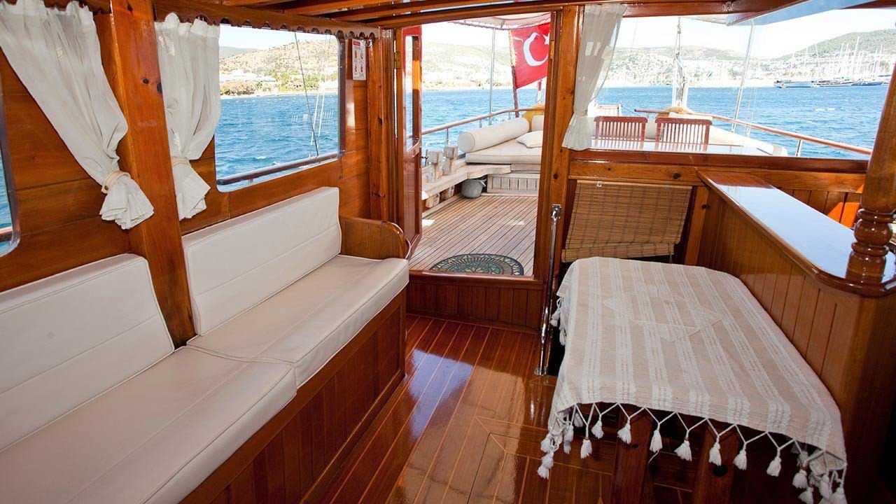 Her kabinde duş ve wc bulunan teknemiz, arka güvertesinde geniş bir yemek alanı ve oturma grubu, ön güvertede ise güneşlenme minderleri ve dinlenme köşesiyle misafirlerine huzurlu bir atmosfer sağlar. Günlük 4 saat klima kullanımı sayesinde yaz sıcaklarında serinlik sağlanır.