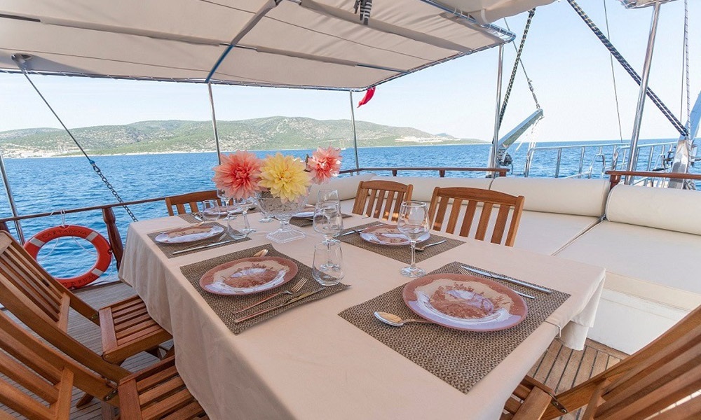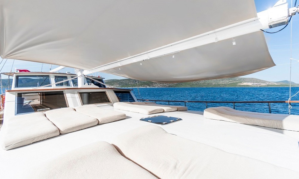 Teknemizin ön güvertesinde geniş bir oturma alanı ve güneşlenme minderleri yer alırken, arka güvertede açık yemek masası ve rahat bir oturma grubu mevcuttur. Profesyonel 3 kişilik mürettebatı — 1 kaptan, 1 aşçı ve 1 gemici — misafirlerimize kaliteli ve keyifli bir mavi yolculuk hizmeti sunmaktadır. Günlük 4-6 saat klima hizmeti bulunan Cartagena guleti ile Bodrum çıkışlı unutulmaz bir tatil planlayabilirsiniz.