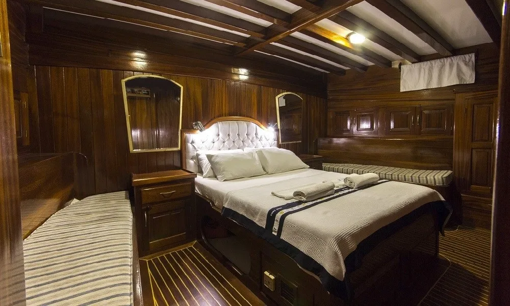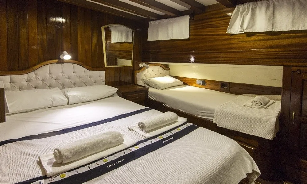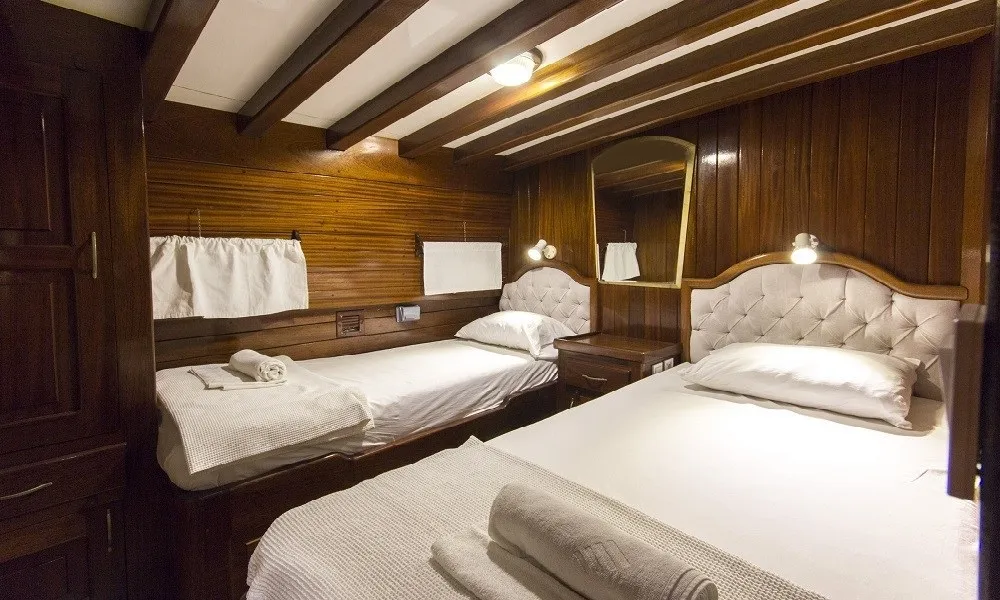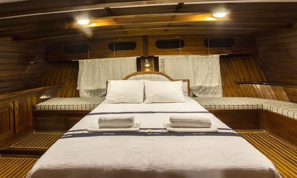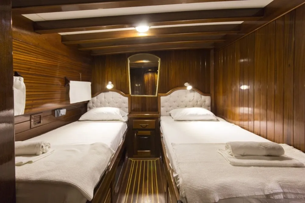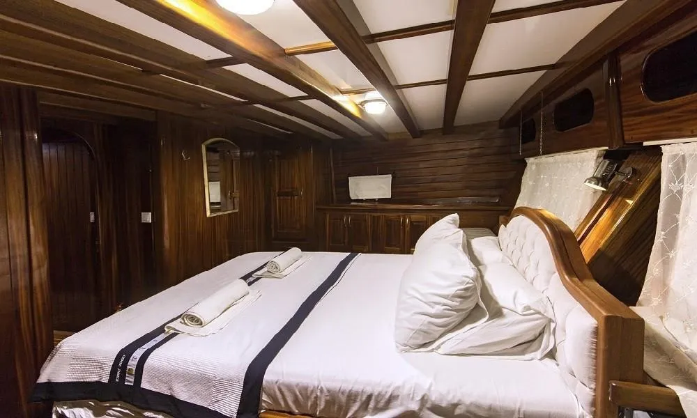 Tüm kabinlerde duş, tuvalet ve klima bulunmaktadır. Ferah salonu ve geniş güverte alanlarıyla konforlu bir tatil sunan teknemizde, deneyimli 4 kişilik mürettebat yolculuğunuz boyunca hizmet vermektedir.