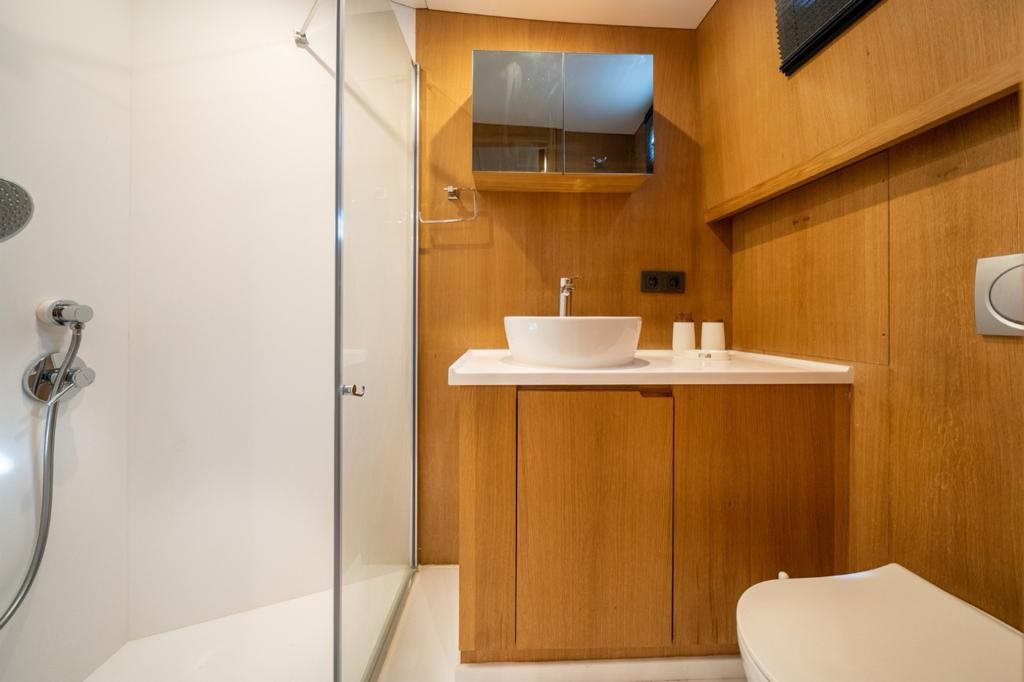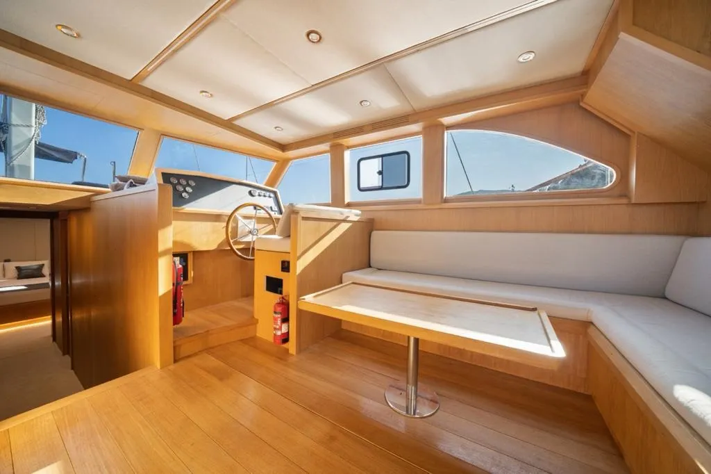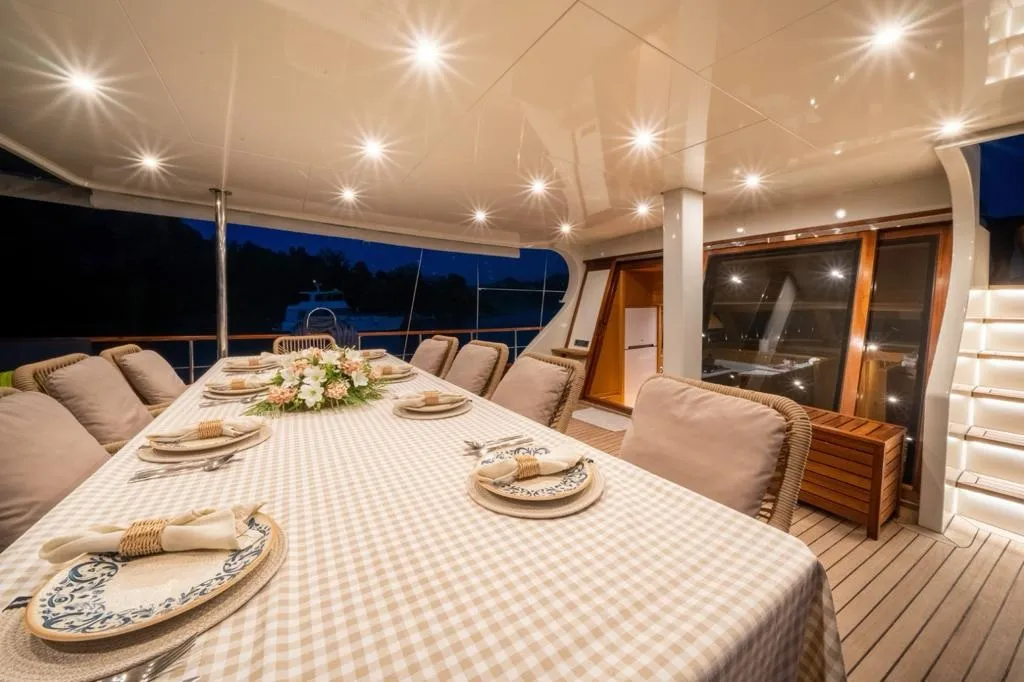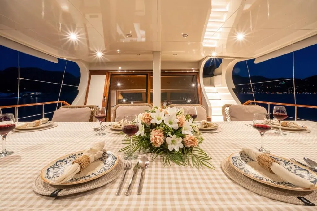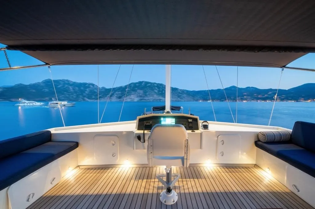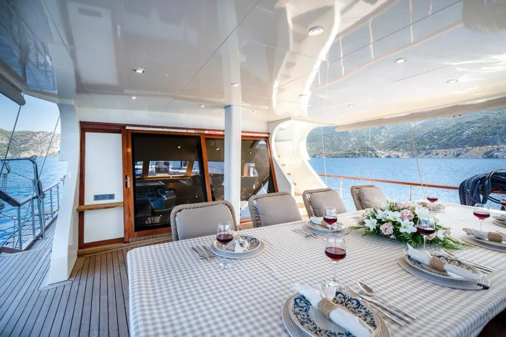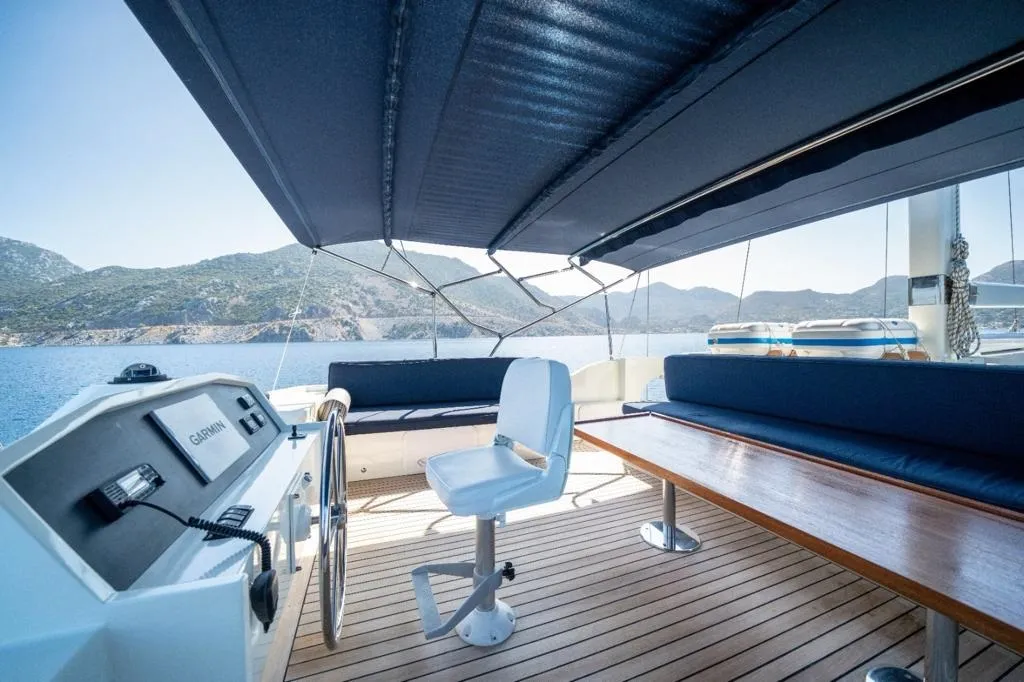 Mavi ve beyazın zarif uyumuyla tasarlanan teknemizin arka güvertesinde geniş bir oturma grubu ve tüm misafirlerin bir arada yemek yiyebileceği büyük bir masa yer alır. Üst güvertede (flybridge) ise denizin ve manzaranın keyfini çıkarabileceğiniz ek bir oturma alanı ve küçük bir masa bulunur. Ön güvertede ise her misafir için yeterli sayıda güneşlenme minderi, konforlu oturma alanı ve masa yer almaktadır.