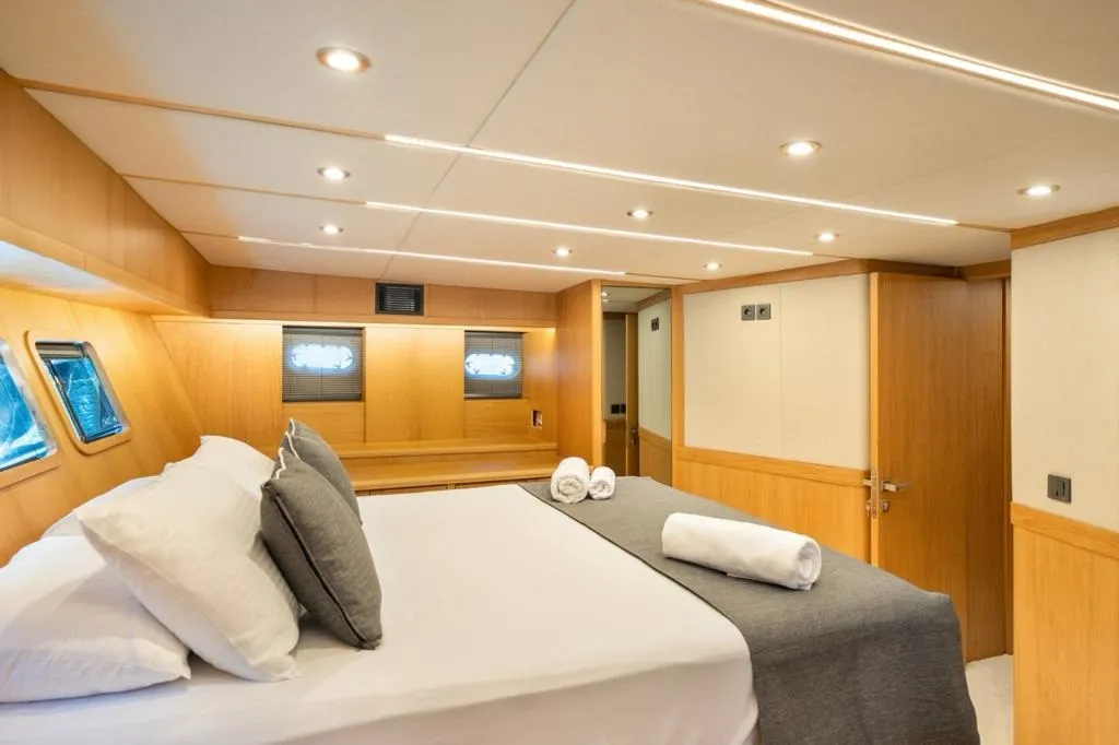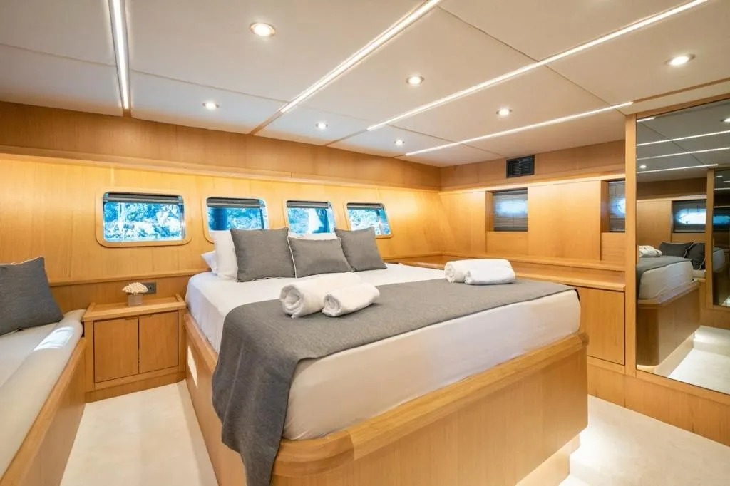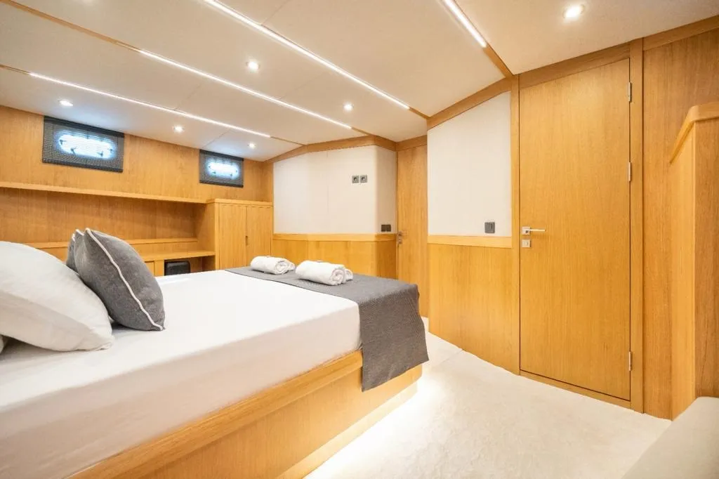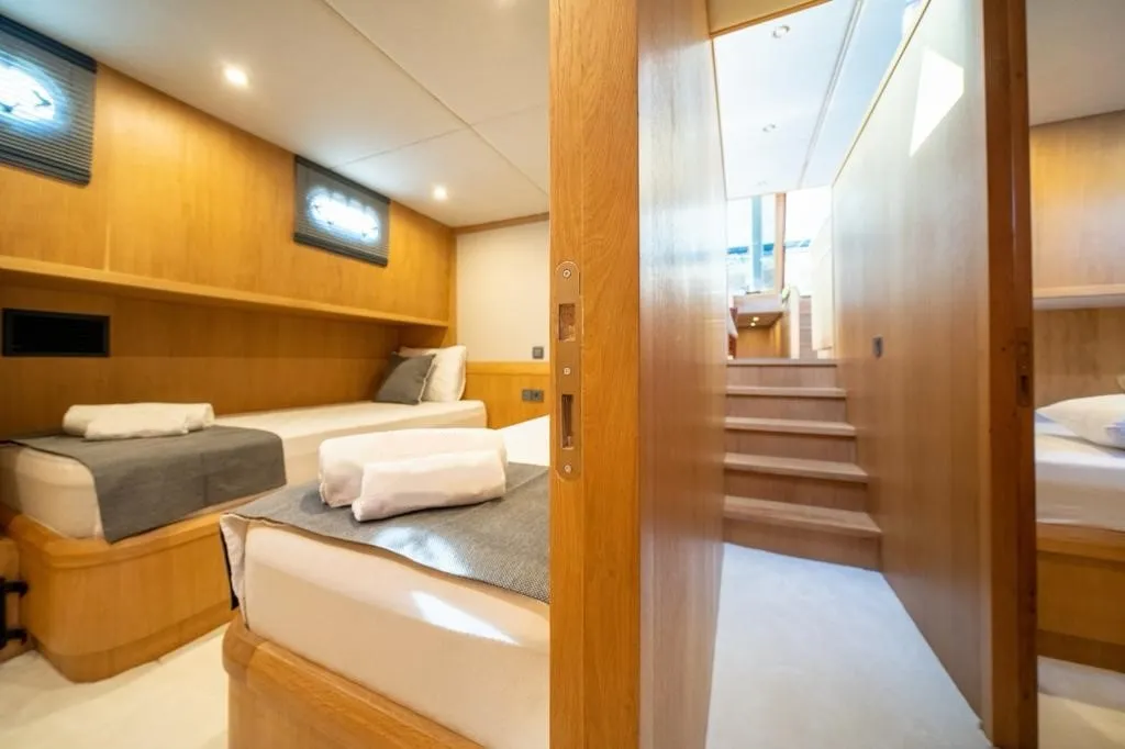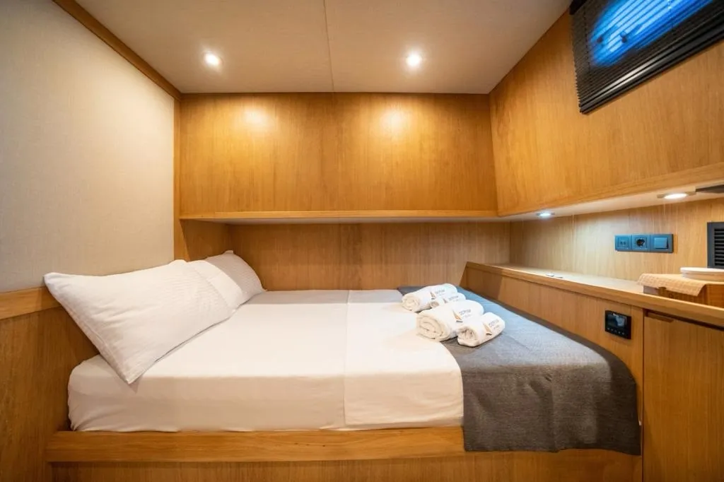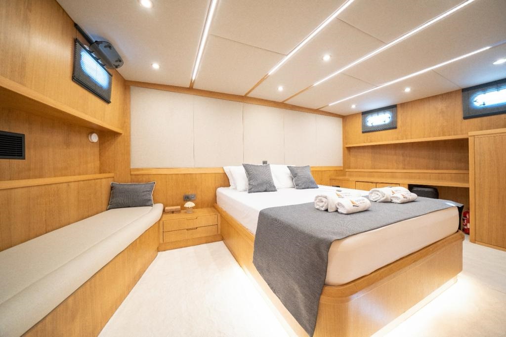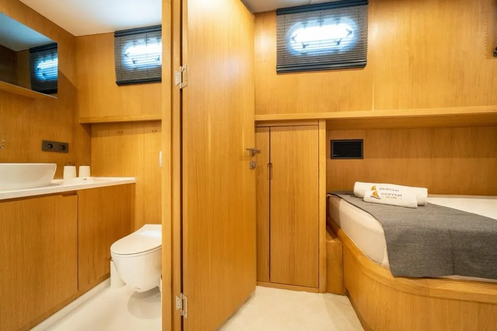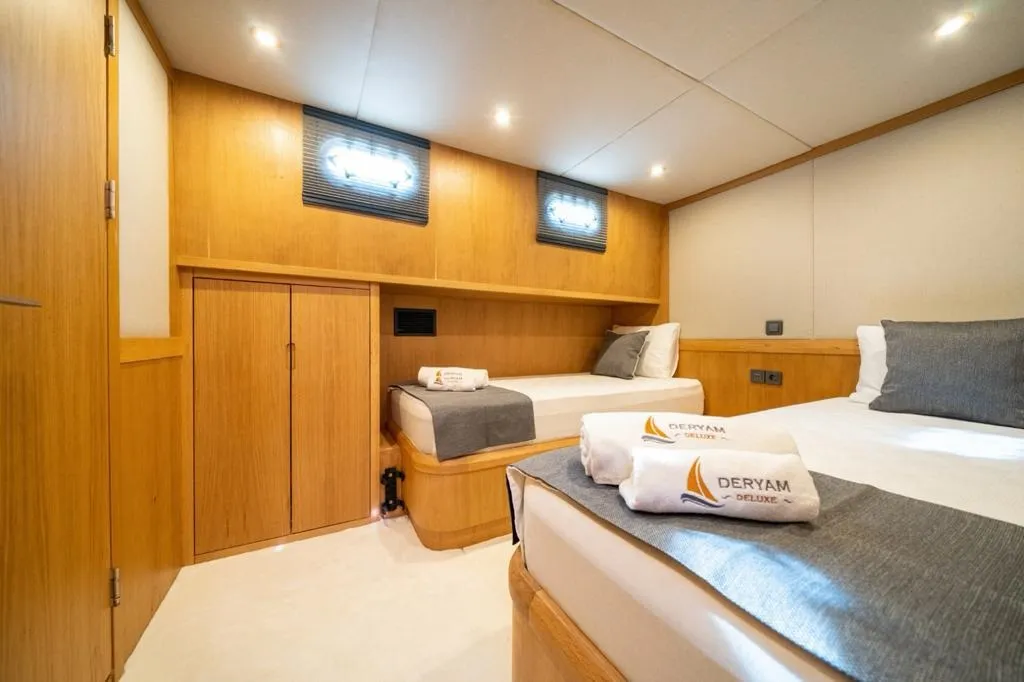 Bodrum gulet kiralama kategorisinde yer alan ve yüksek misafir memnuniyetiyle öne çıkan Deryam De Lüxe, 24 metre uzunluğa ve 6,5 metre genişliğe sahip, modern çizgilere sahip yepyeni bir gulettir. 2023 yapımı olan teknemiz, 2 master, 1 double ve 2 twin olmak üzere toplam 5 şık kabiniyle 10 kişilik özel gruplara konforlu bir mavi yolculuk deneyimi sunar. Tüm kabinlerde duş, wc ve klima standart olarak bulunmaktadır.