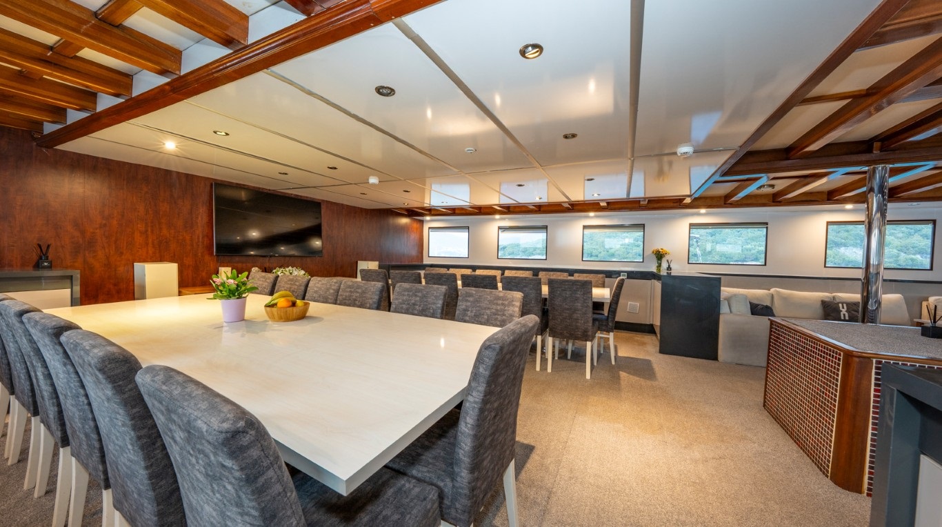 Arka güvertede geniş bir oturma grubu ve yemek masası, ön güvertede ise keyifli bir oturma alanı yer almaktadır. Üst güvertede jakuzi, bar, yemek masası ve güneşlenme minderleri ile donatılmış alanlar, hem dinlenmek hem de eğlenmek için idealdir. Teknede 24 saat kesintisiz klima ve Türk sularında limitsiz internet erişimi bulunmaktadır.