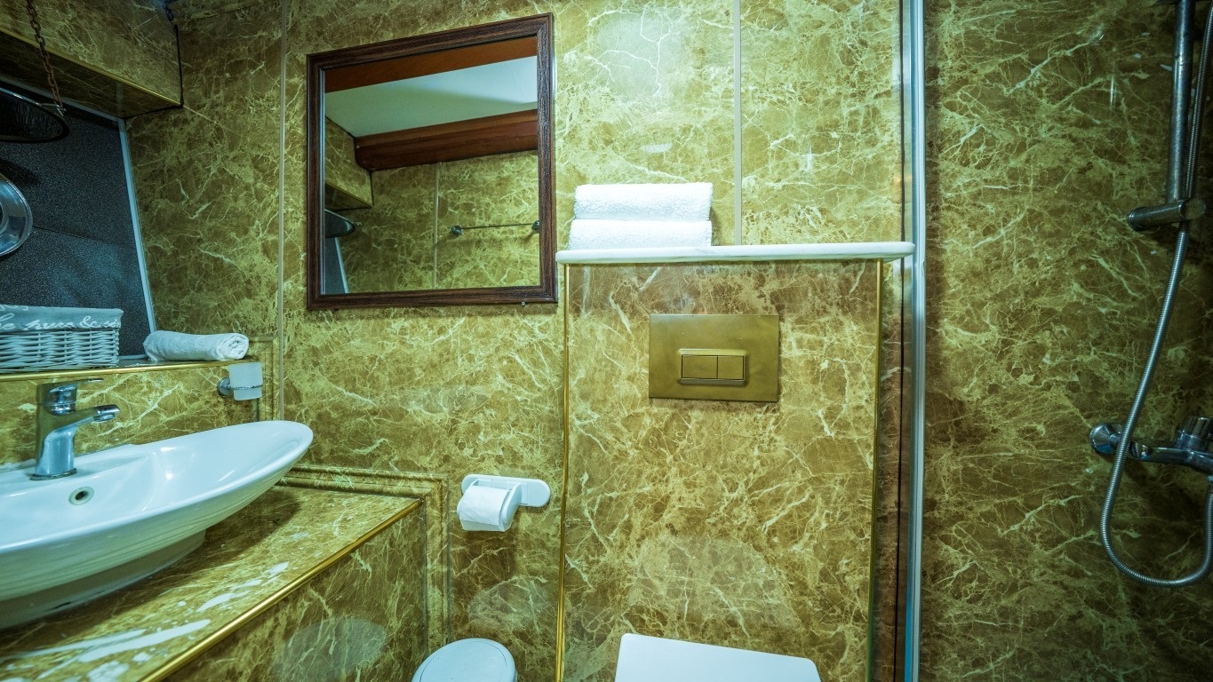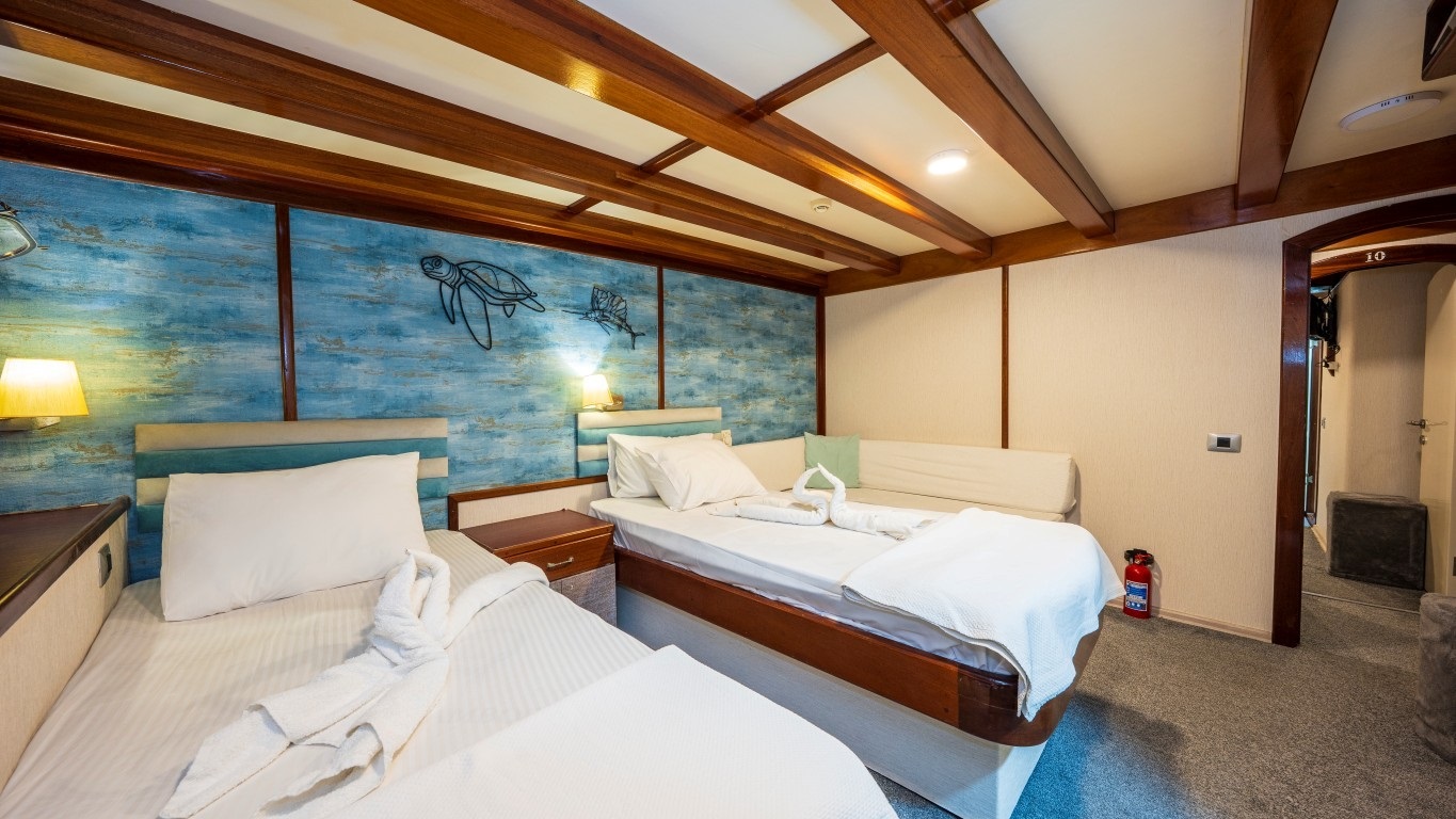 6 double, 6 twinden oluşan 12 kabini ile 24 kişiye kadar konaklama imkanı sağlayan teknede, 7 kişilik deneyimli mürettebat bulunmaktadır. Mürettebat, kaptan, aşçı, makineci, gemiciler ve servis personelinden oluşarak misafirlerin her ihtiyacına profesyonel bir şekilde yanıt vermektedir.