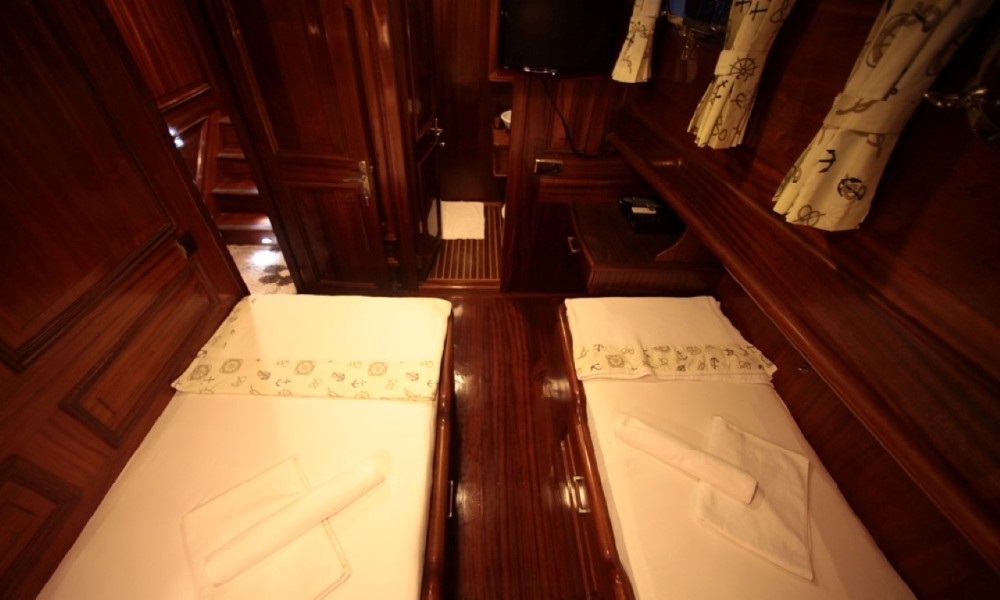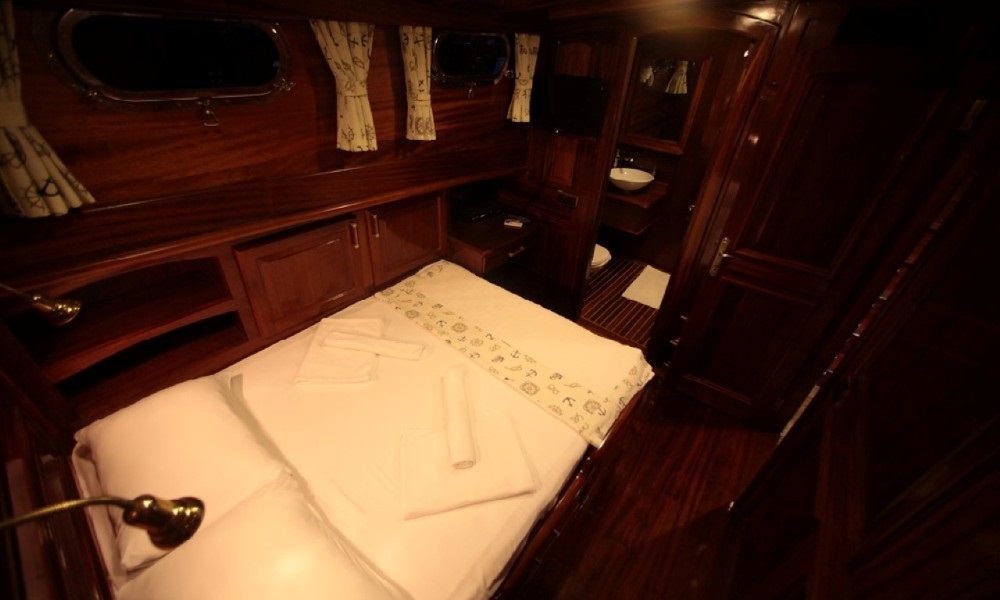 Furkan Teknesi, 2 master, 1 double ve 1 triple kabiniyle 8 kişiye kadar olan aile ve arkadaş gruplarınıza rahat ve şık bir konaklama imkanı sağlar. Tüm kabinlerde klima ve özel banyolar bulunmakta olup, her detay misafirlerin maksimum konforu için titizlikle tasarlanmıştır.