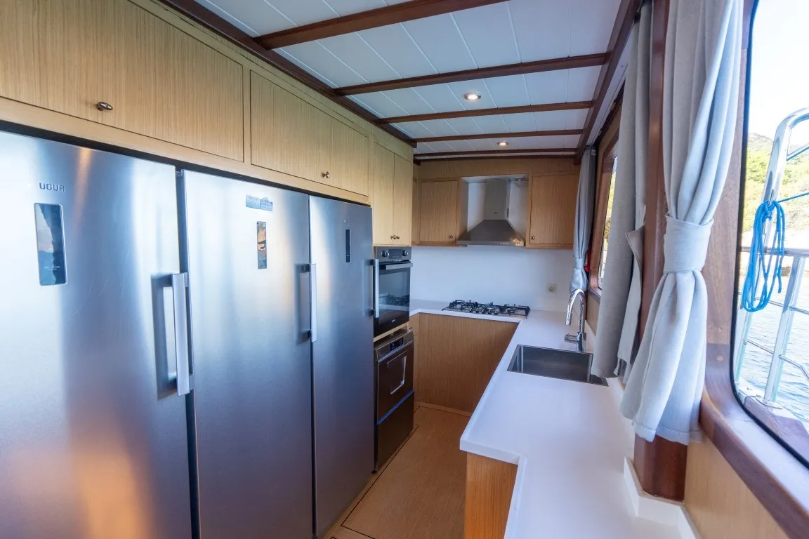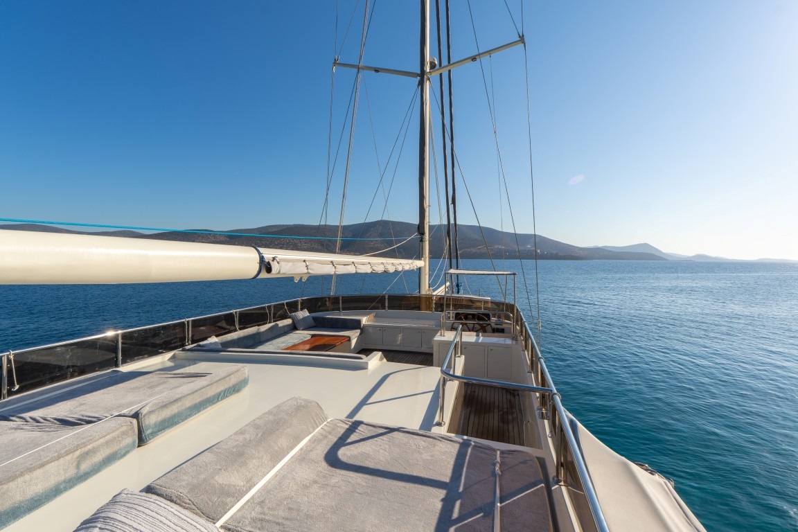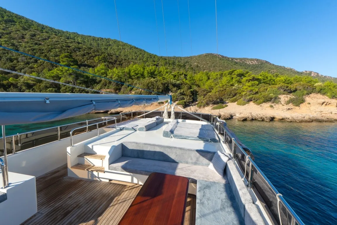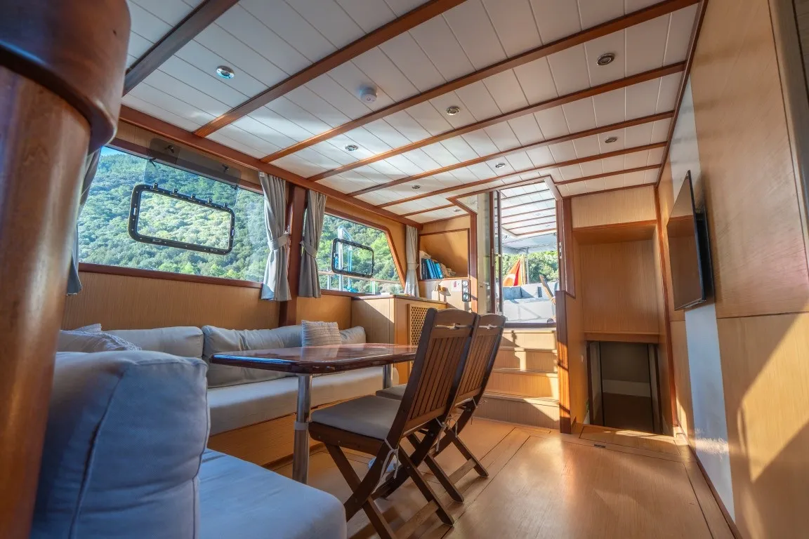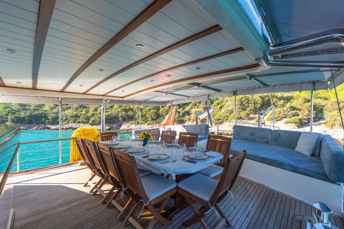 Teknenin arka güvertesinde, tüm misafirlerin oturup rahatça yemek yiyebileceği büyük bir yemek masası, sandalyeler, geniş bir oturma grubu ve bar bulunmaktadır. Ön güvertede ise içeceklerinizi keyifle yudumlayarak güneşin doğuşunu ve batışını izleyebileceğiniz bir oturma grubu, büyük bir sehpa ve güneşlenme minderleri yer almaktadır.