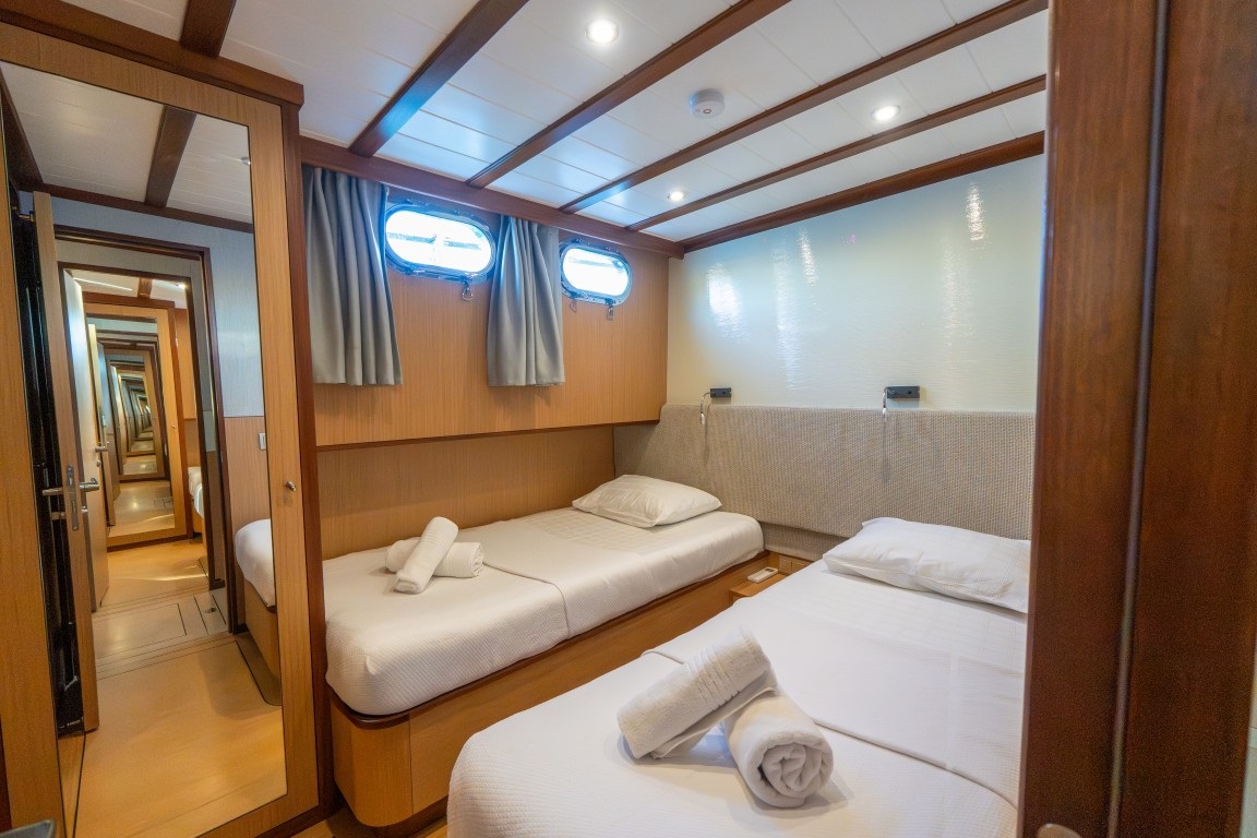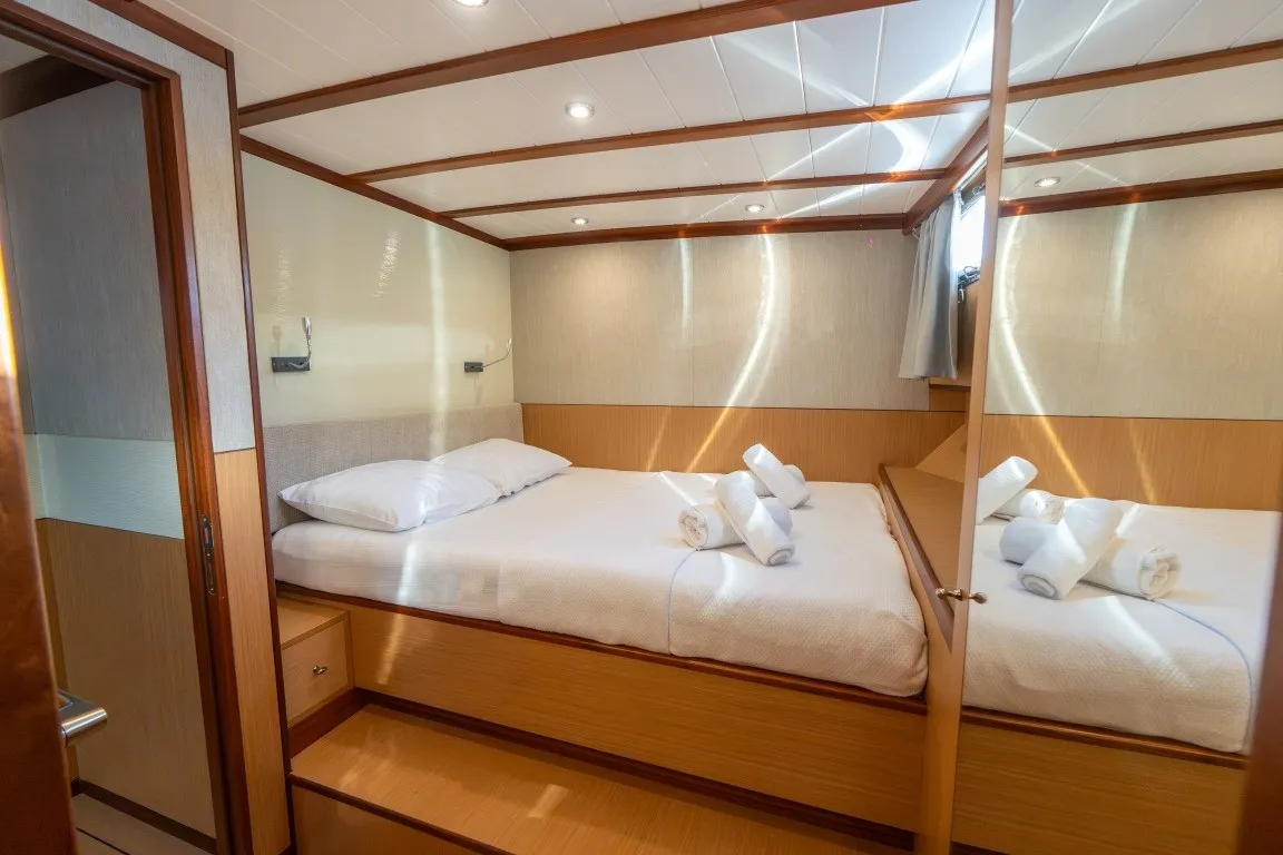 Modern ve geniş kabinleri, salonu ve güvertesi mavi yolculuk tutkunlarının rahatlığı için özel olarak dizayn edilmiştir. 4 double ve 2 twin (isteğe göre birleştirilebilen) kabinleri bulunan Guilia teknesi, her kabinde duşakabinli banyo, wc ve gece gündüz 8 – 12 saat hizmet verebilen klima sistemi ile donatılmıştır.
