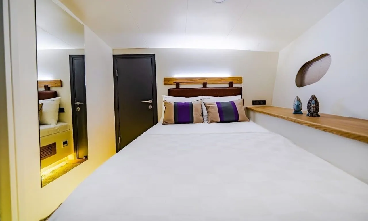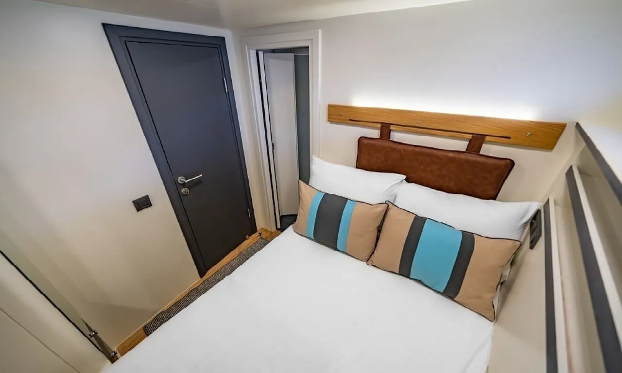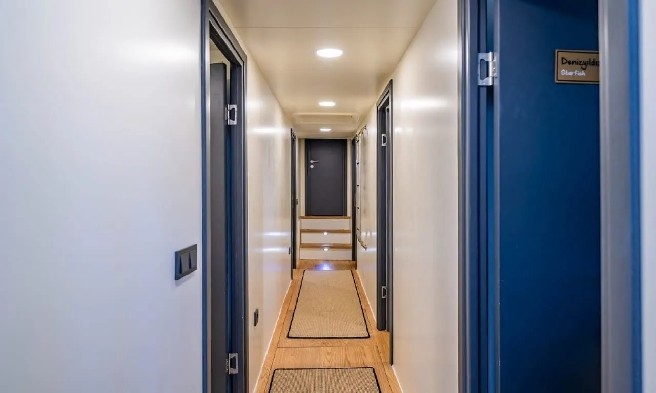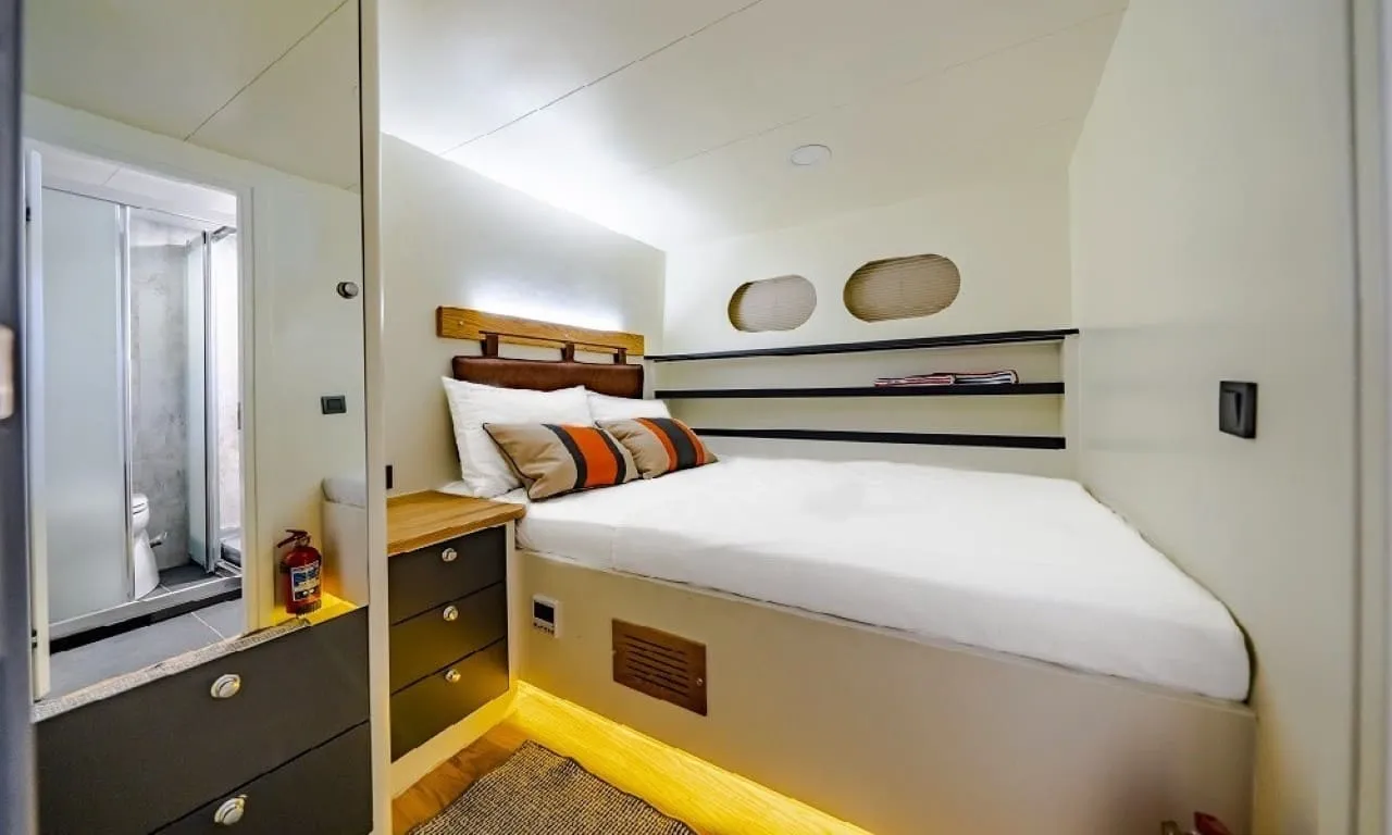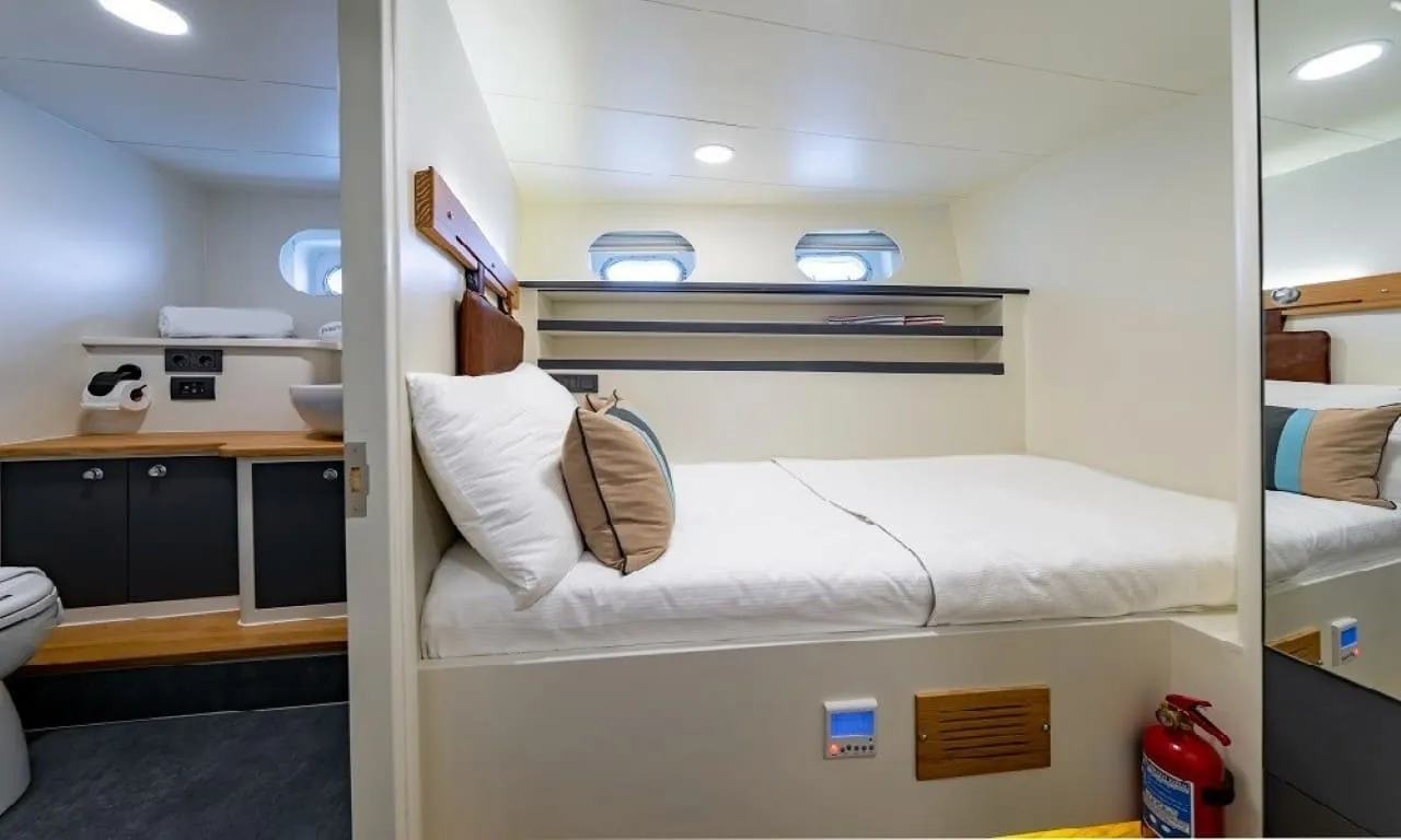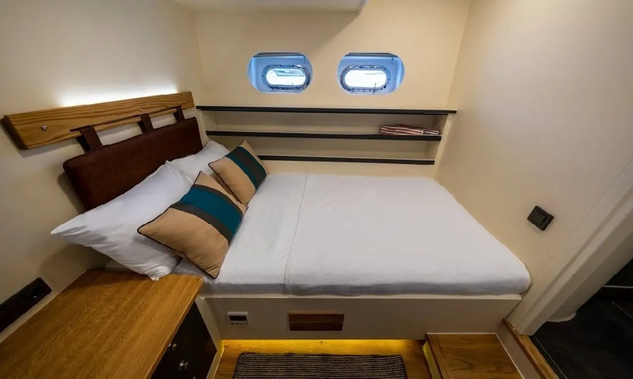 Misafirlerimizin konforu ön planda tutularak tasarlanan teknemizde 6 double kabin bulunmakta olup, toplamda 12 kişilik konaklama kapasitesine sahiptir. Her kabinde özel duş ve wc imkânı sunulmaktadır. Sıcak yaz günlerinde konforlu bir konaklama için kabinlerde klima bulunmakta olup, günlük 8 saat kullanım ile sınırlıdır.