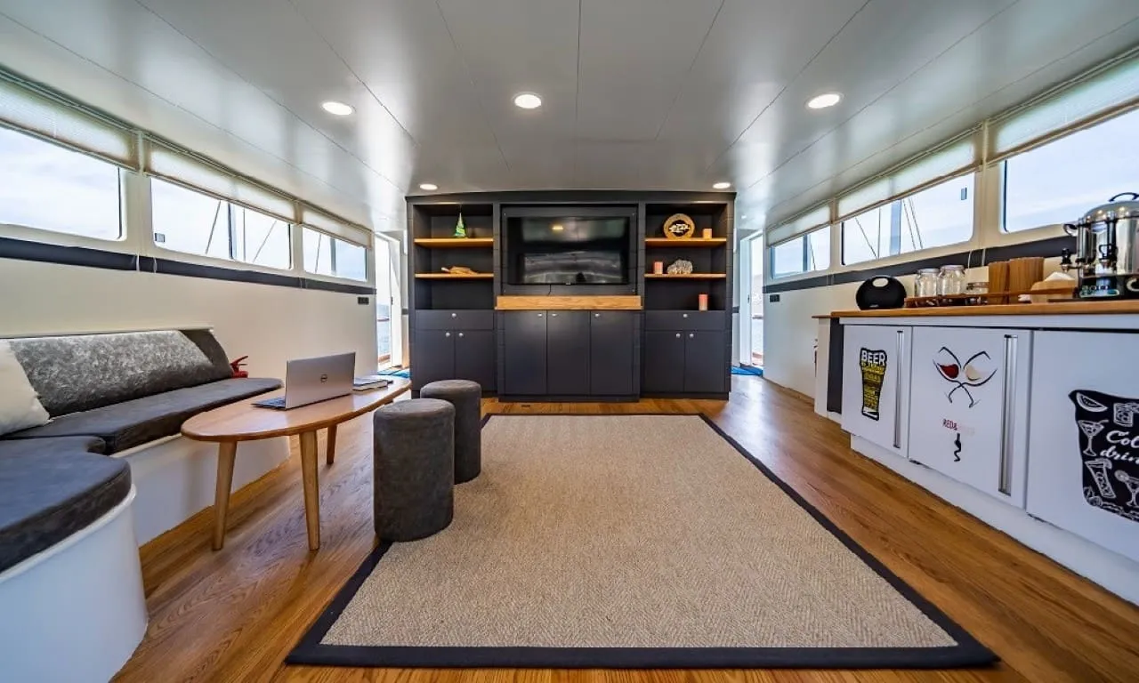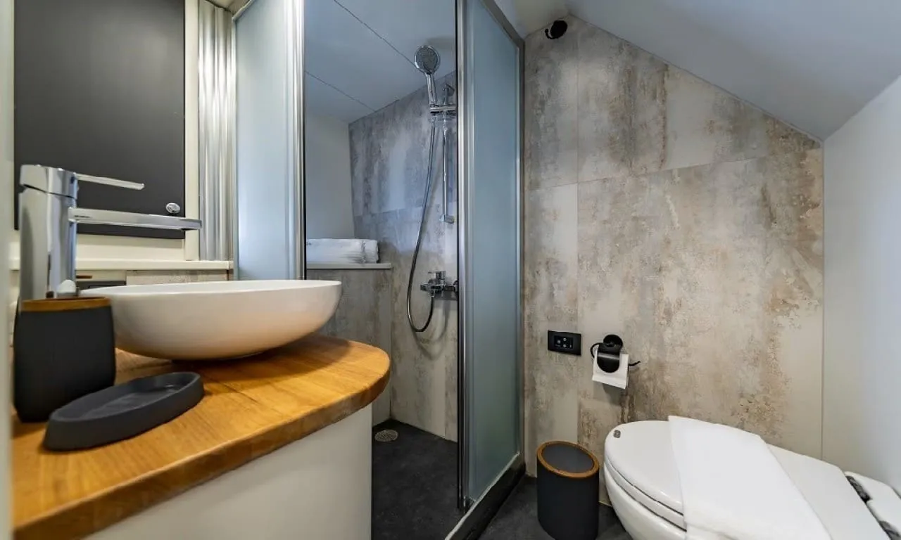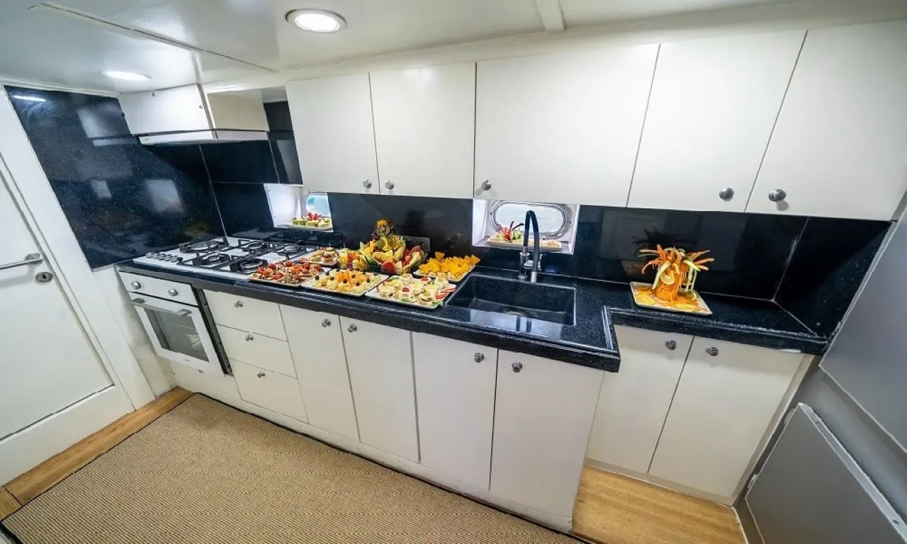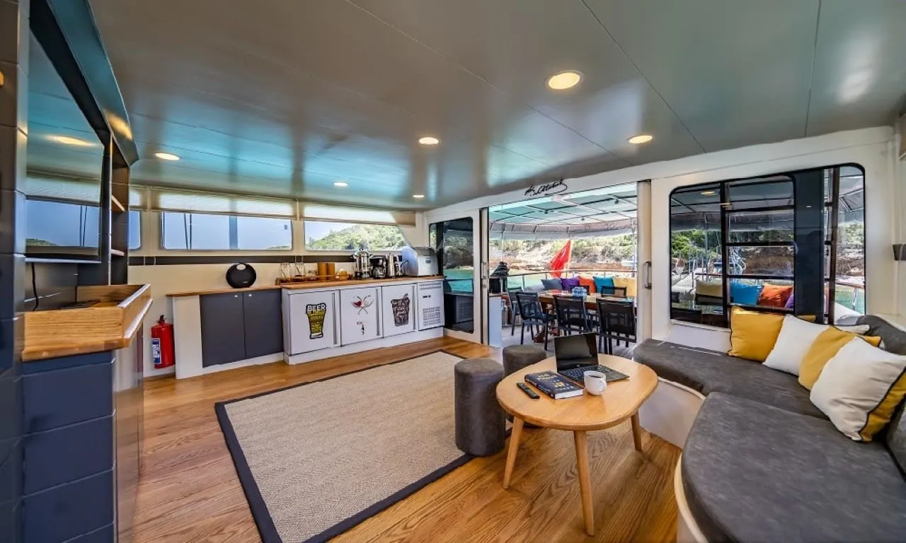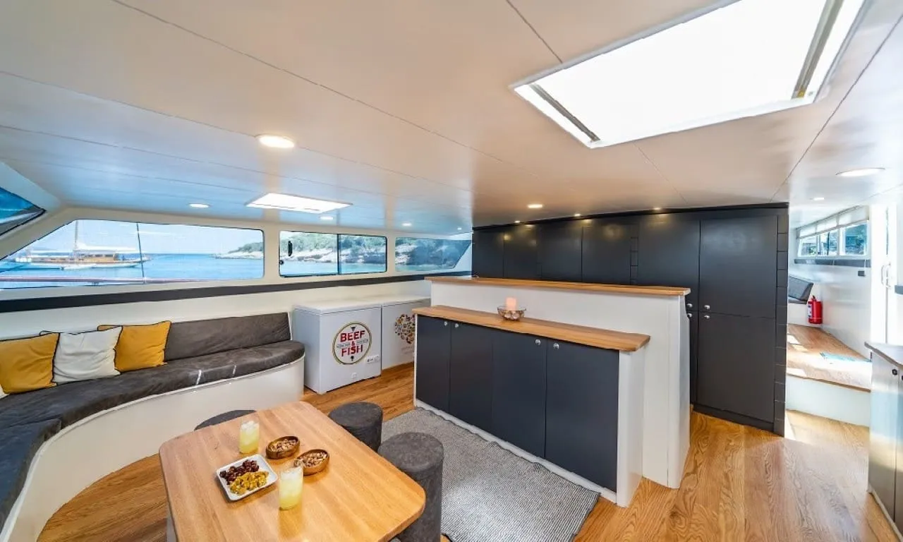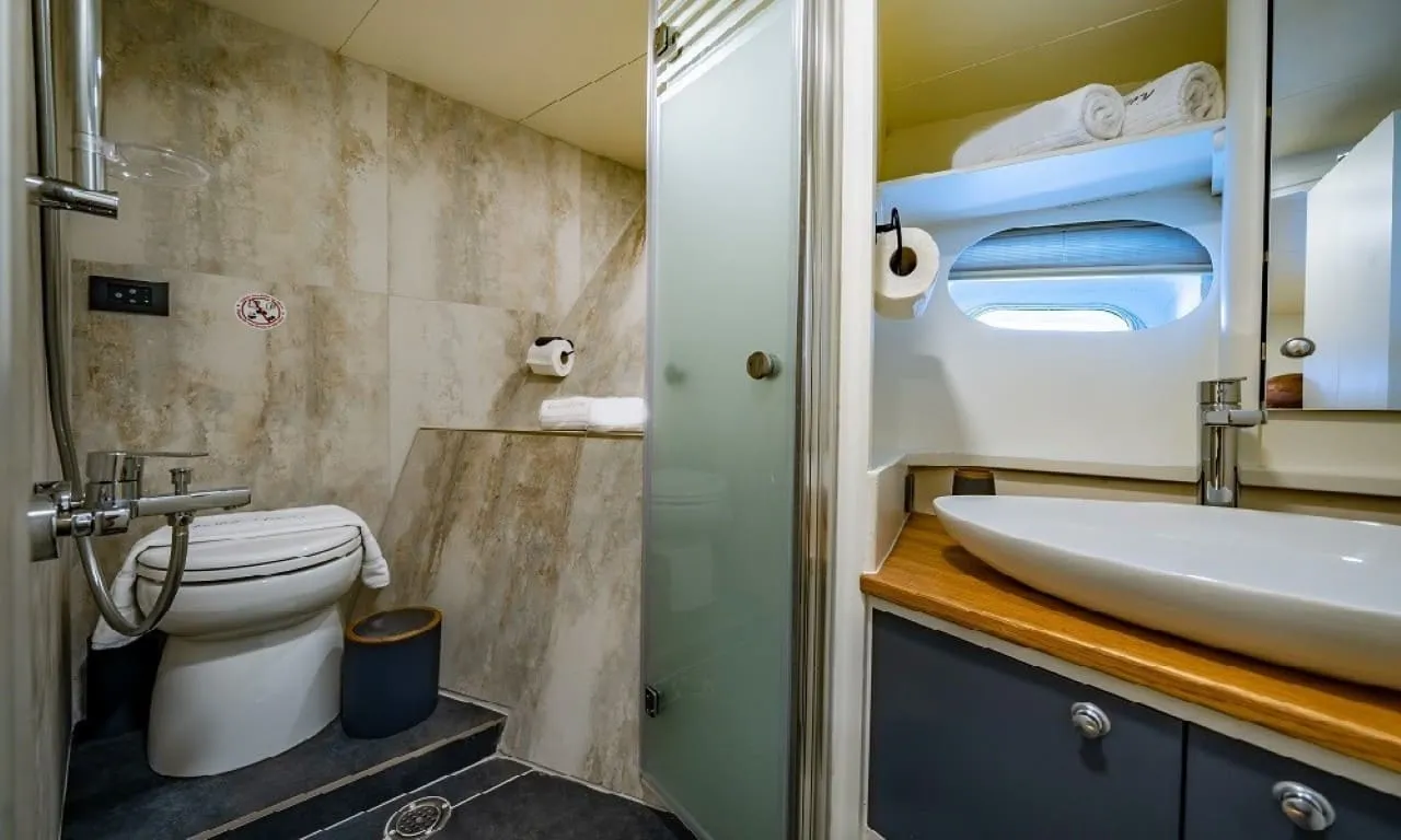 Misafirlerimizin konforu ön planda tutularak tasarlanan teknemizde 6 double kabin bulunmakta olup, toplamda 12 kişilik konaklama kapasitesine sahiptir. Her kabinde özel duş ve wc imkânı sunulmaktadır. Sıcak yaz günlerinde konforlu bir konaklama için kabinlerde klima bulunmakta olup, günlük 8 saat kullanım ile sınırlıdır.