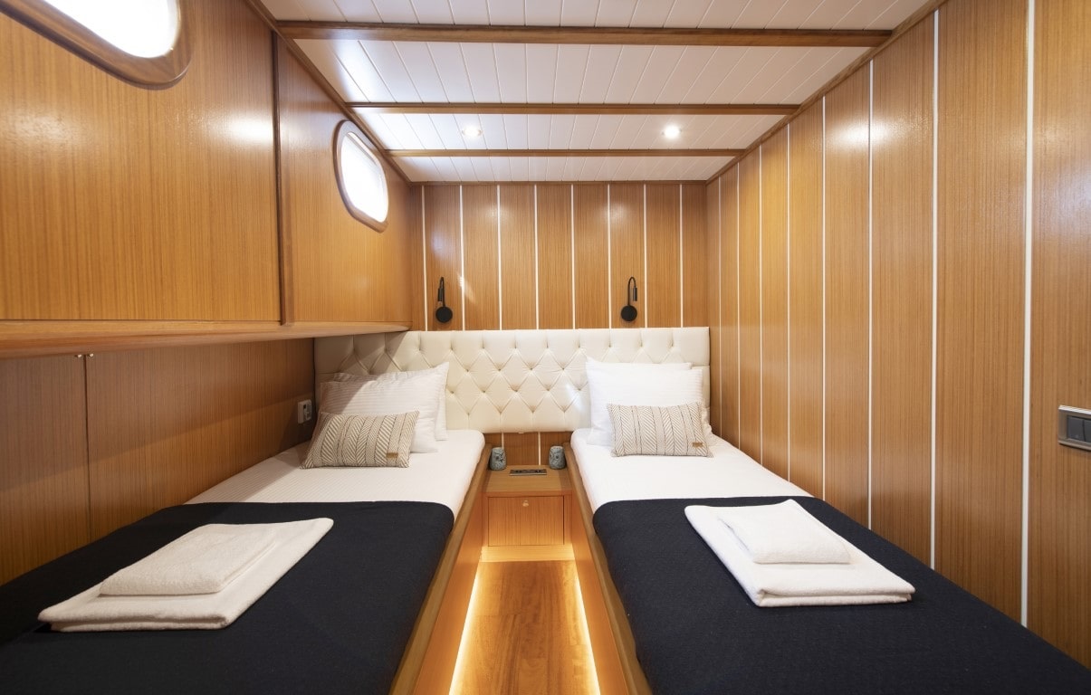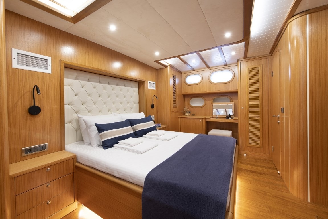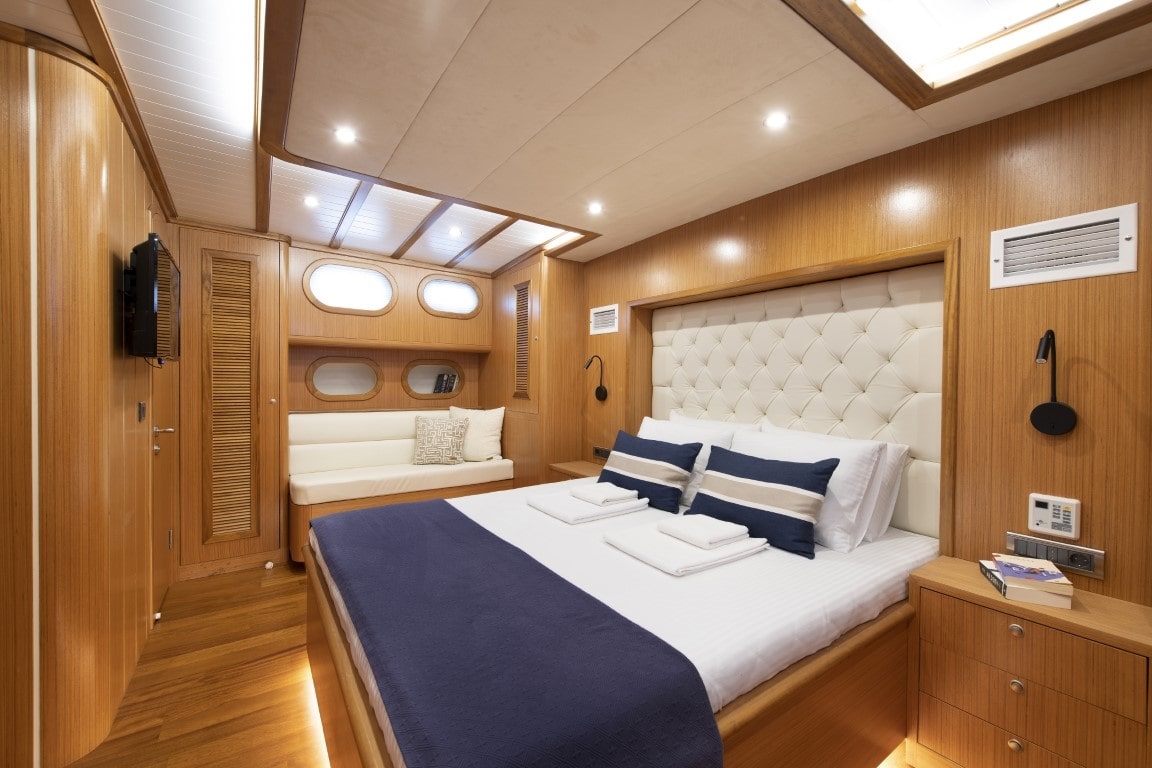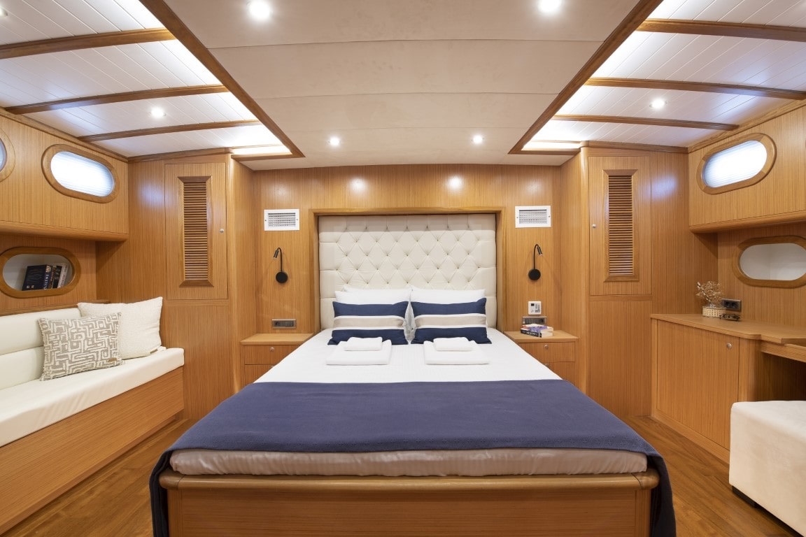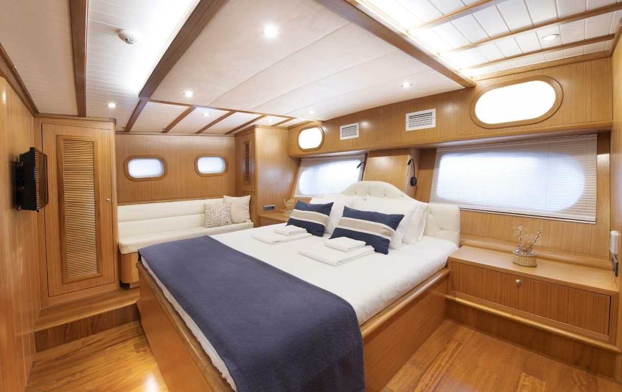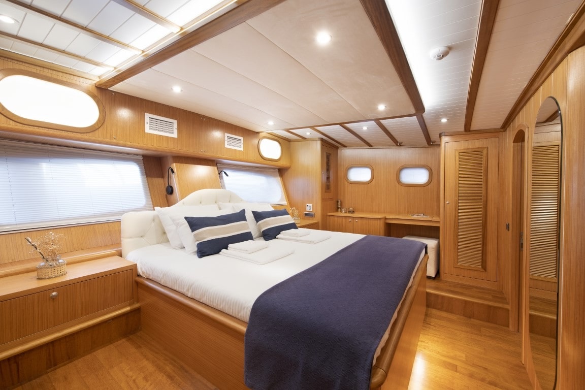 8 kişiye kadar olan gruplar için ideal olan bu seçkin yat, 2 Master ve 2 Double/Twin kabin olmak üzere toplam 4 adet geniş ve zarif şekilde tasarlanmış kabiniyle dikkat çeker. Double yatakların Twin'e dönüştürülebilmesi sayesinde farklı konaklama tercihlerinize esneklik sunar. Her kabinde özel banyo ve sınırsız klima hizmeti ile konfor her zaman ön plandadır. Ayrıca Master kabinlerde ve salonda yer alan televizyonlar ile dinlenme saatlerinizi daha keyifli hale getirebilirsiniz. Türk karasularında geçerli sınırsız internet hizmeti sayesinde de denizle iç içe tatilinizi, dijital dünyadan kopmadan sürdürebilirsiniz.