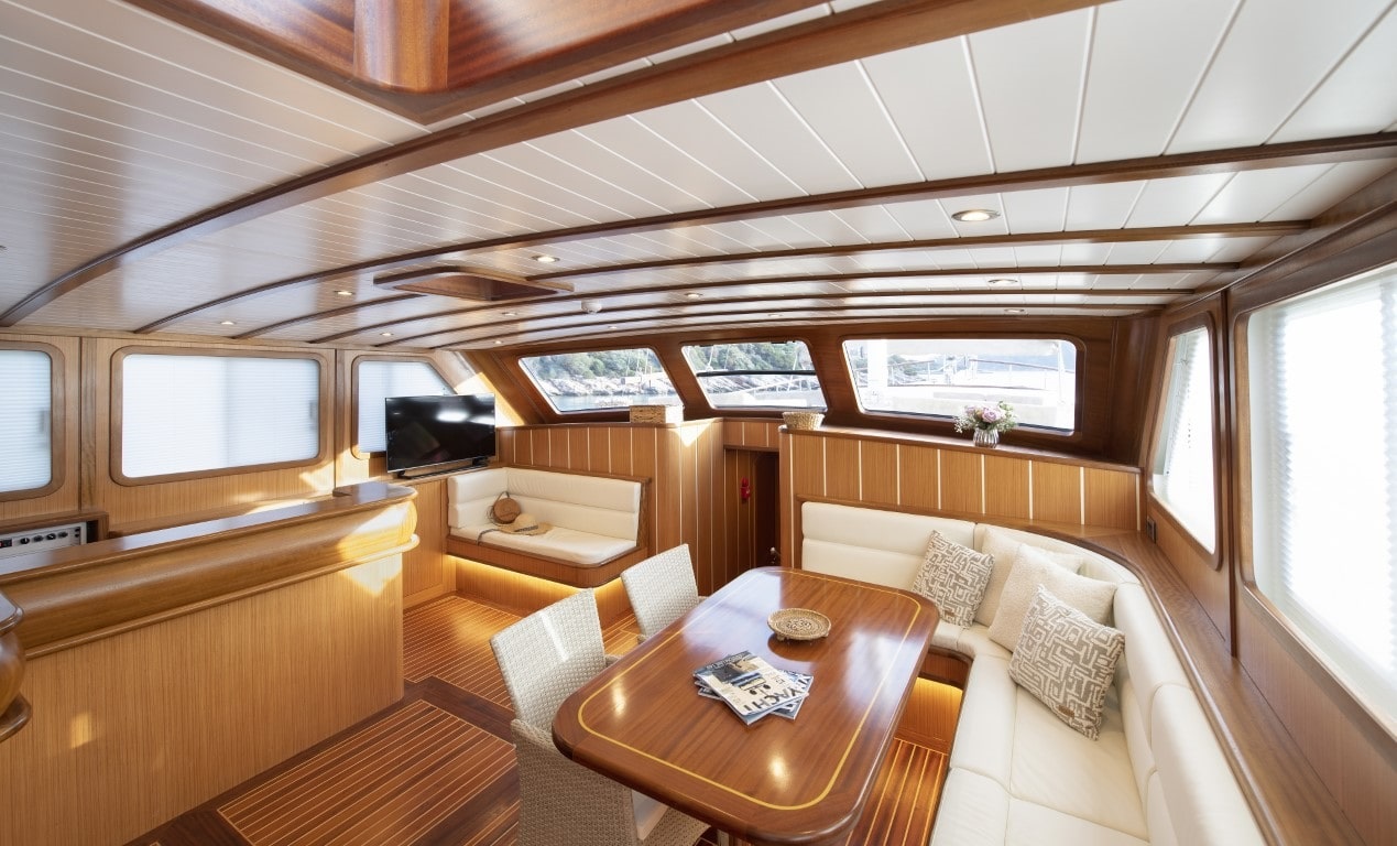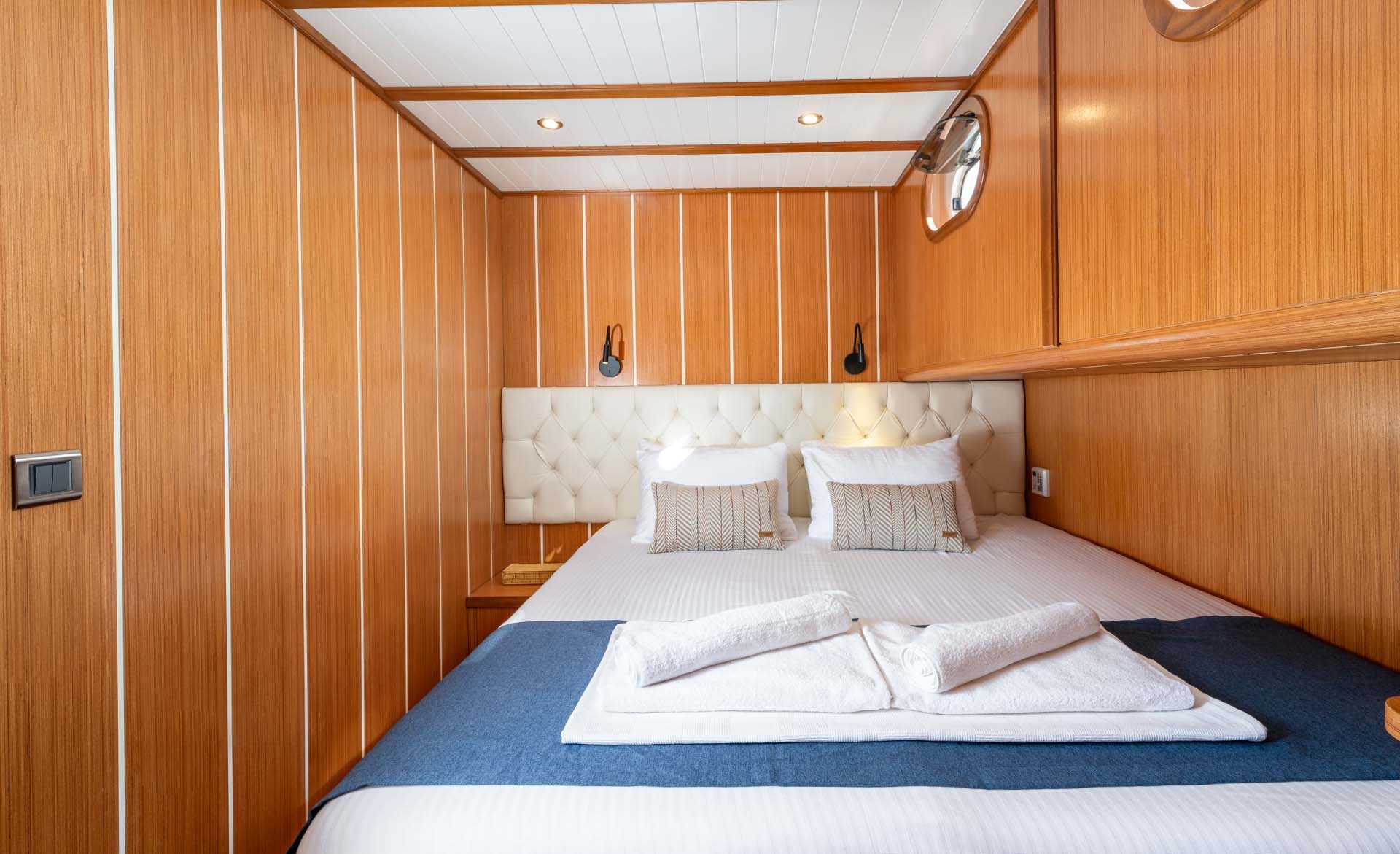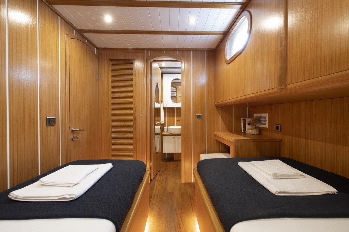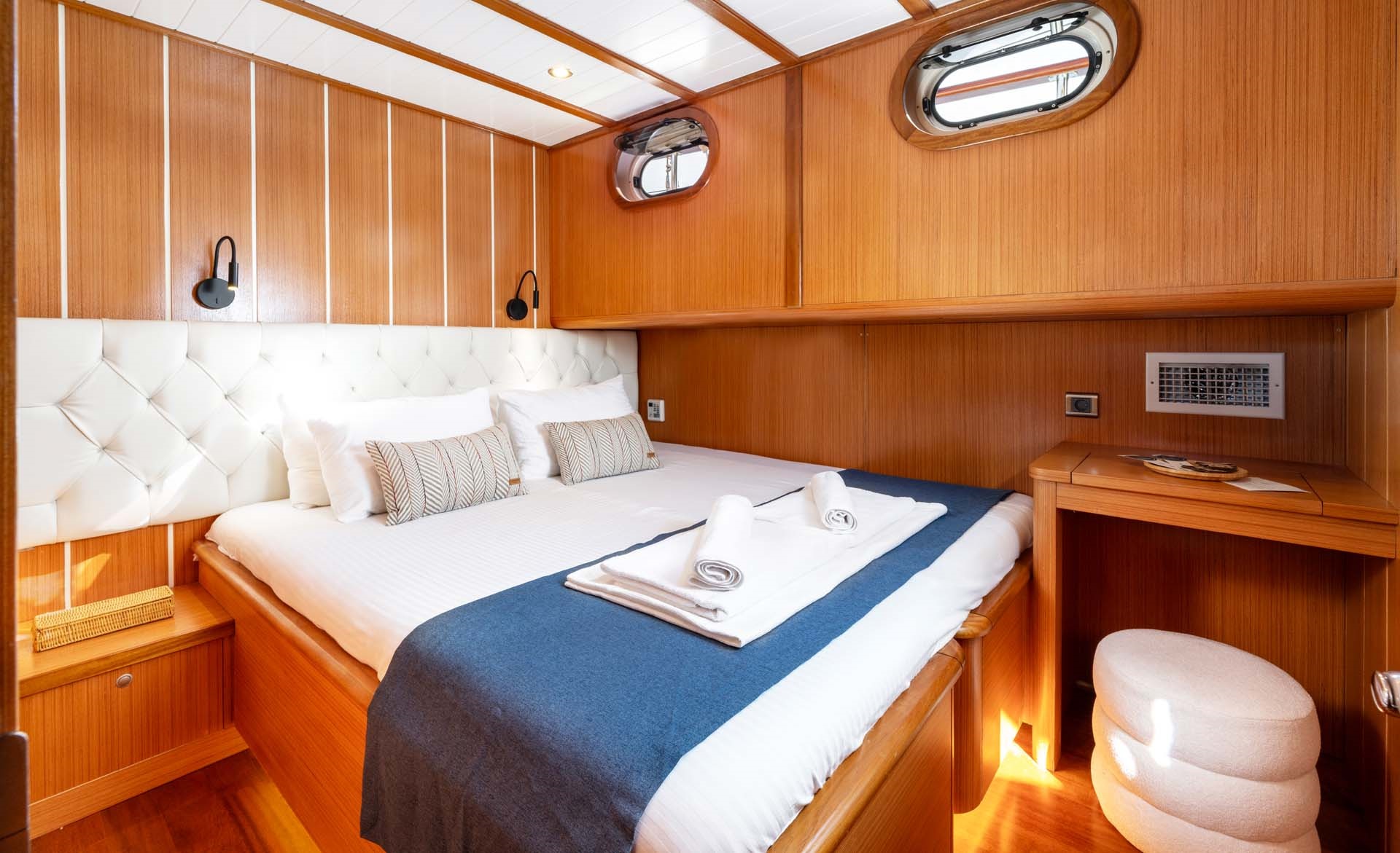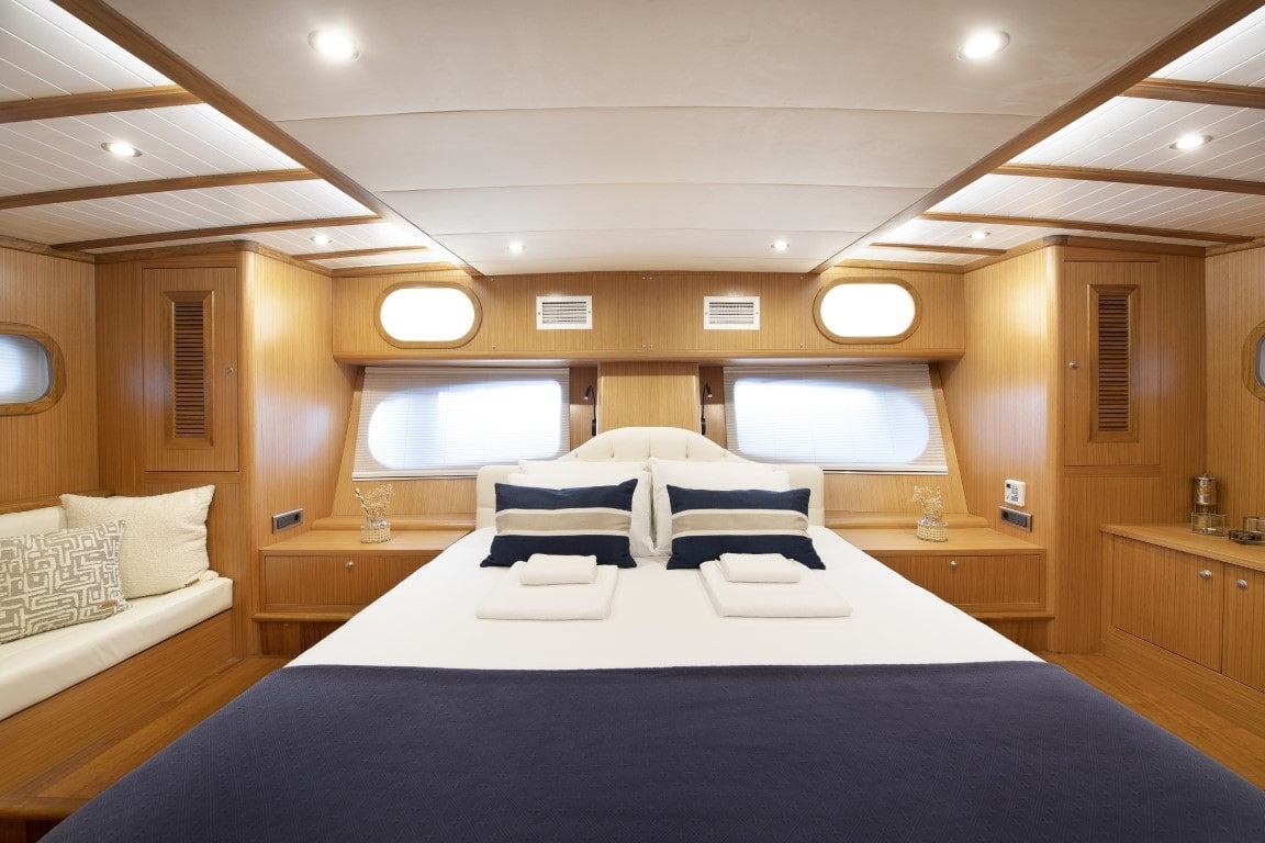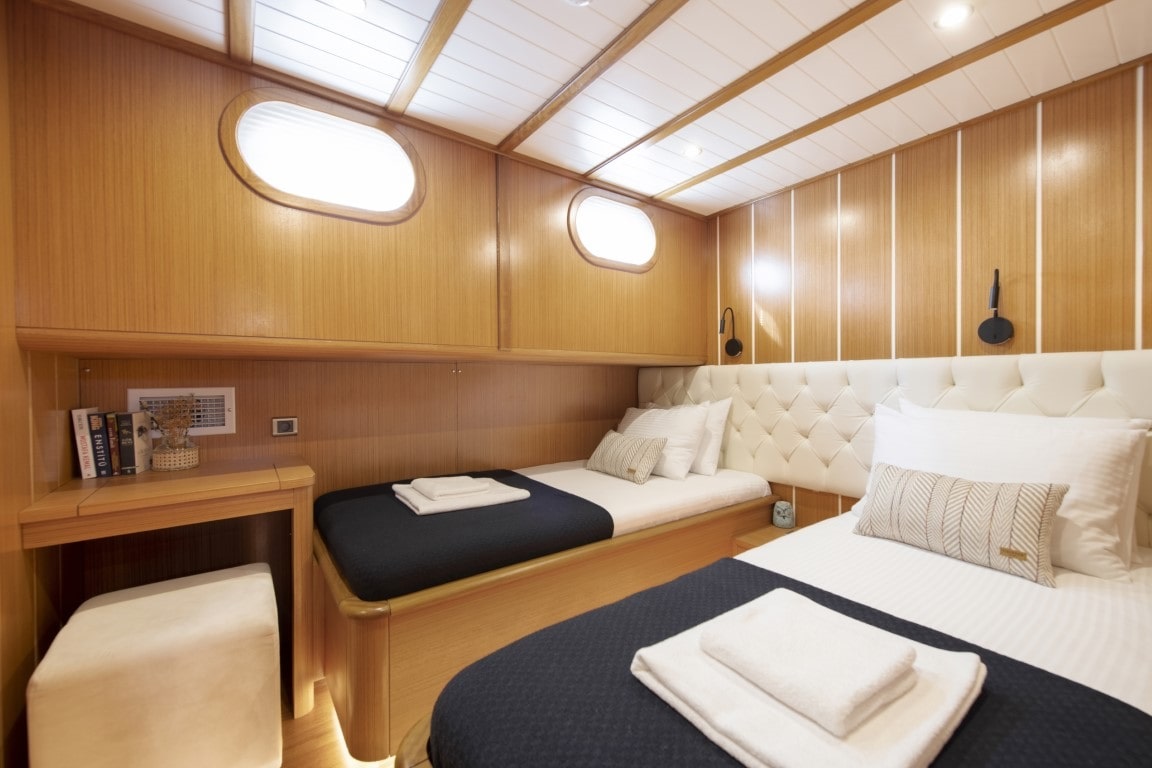 8 kişiye kadar olan gruplar için ideal olan bu seçkin yat, 2 Master ve 2 Double/Twin kabin olmak üzere toplam 4 adet geniş ve zarif şekilde tasarlanmış kabiniyle dikkat çeker. Double yatakların Twin'e dönüştürülebilmesi sayesinde farklı konaklama tercihlerinize esneklik sunar. Her kabinde özel banyo ve sınırsız klima hizmeti ile konfor her zaman ön plandadır. Ayrıca Master kabinlerde ve salonda yer alan televizyonlar ile dinlenme saatlerinizi daha keyifli hale getirebilirsiniz. Türk karasularında geçerli sınırsız internet hizmeti sayesinde de denizle iç içe tatilinizi, dijital dünyadan kopmadan sürdürebilirsiniz.