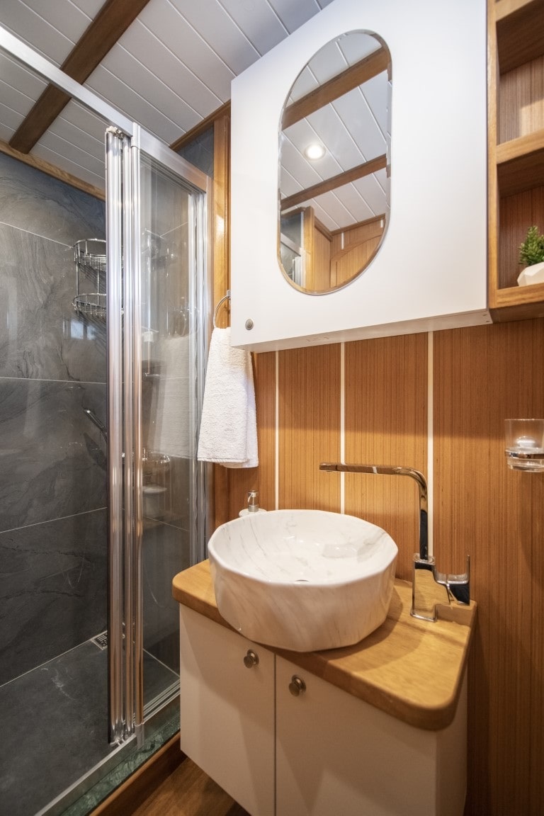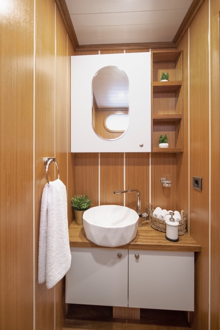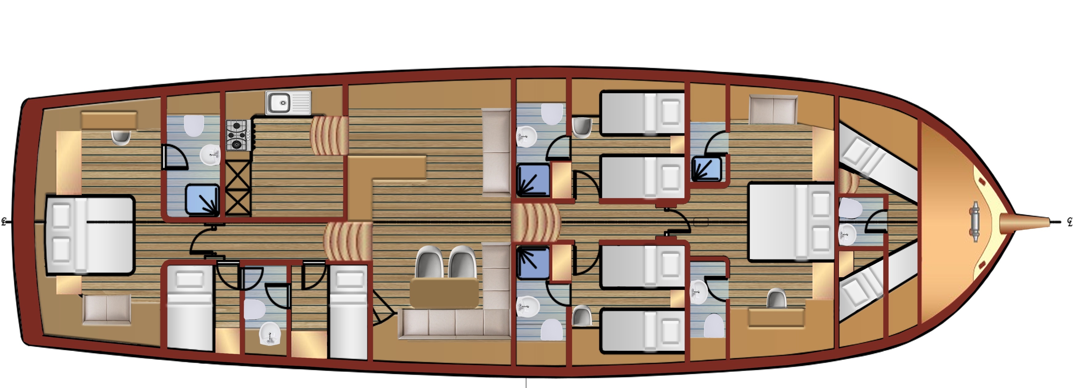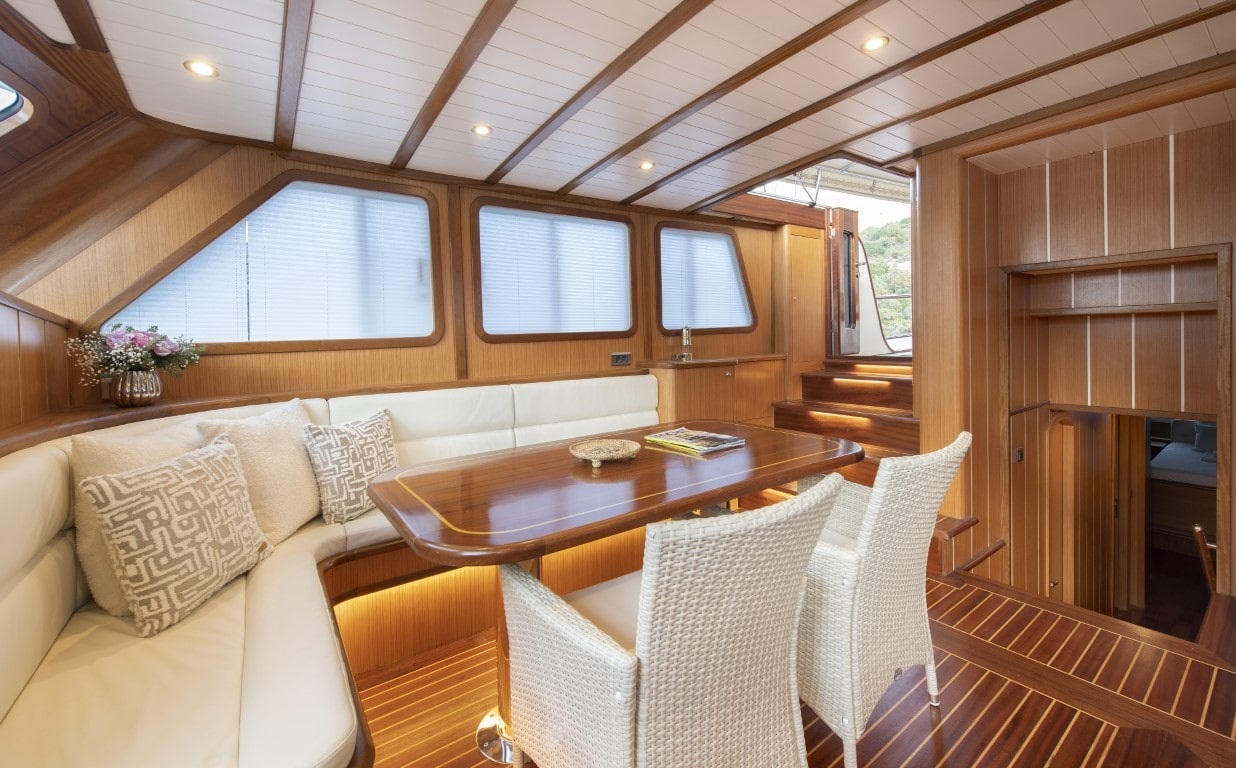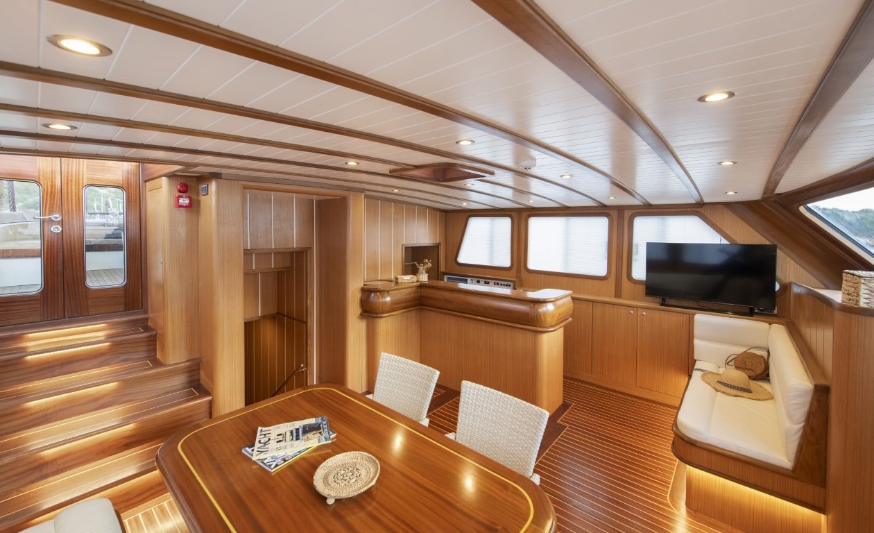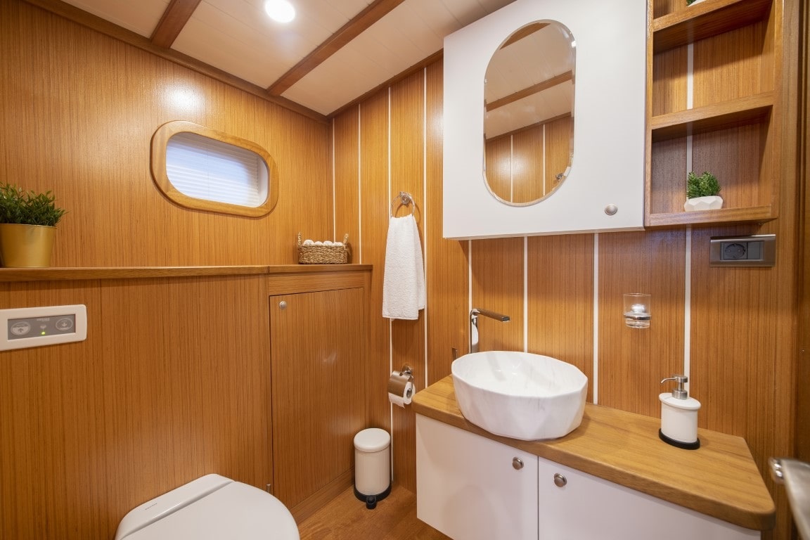 8 kişiye kadar olan gruplar için ideal olan bu seçkin yat, 2 Master ve 2 Double/Twin kabin olmak üzere toplam 4 adet geniş ve zarif şekilde tasarlanmış kabiniyle dikkat çeker. Double yatakların Twin'e dönüştürülebilmesi sayesinde farklı konaklama tercihlerinize esneklik sunar. Her kabinde özel banyo ve sınırsız klima hizmeti ile konfor her zaman ön plandadır. Ayrıca Master kabinlerde ve salonda yer alan televizyonlar ile dinlenme saatlerinizi daha keyifli hale getirebilirsiniz. Türk karasularında geçerli sınırsız internet hizmeti sayesinde de denizle iç içe tatilinizi, dijital dünyadan kopmadan sürdürebilirsiniz.
