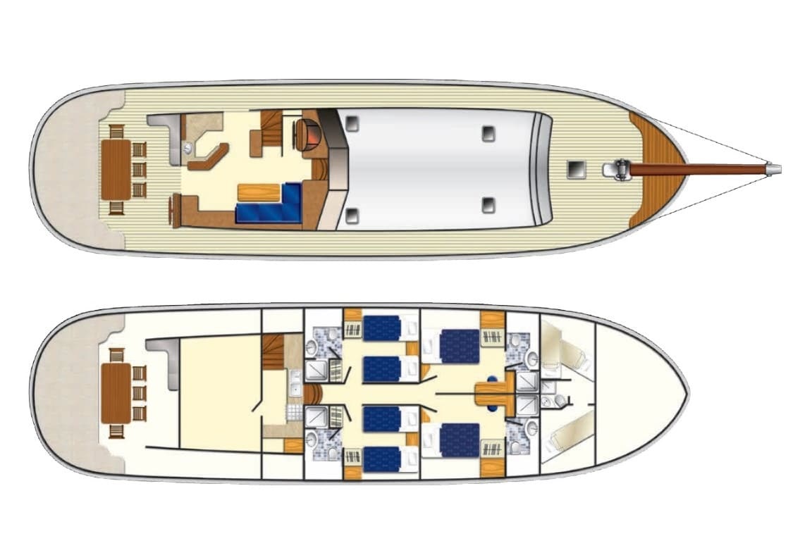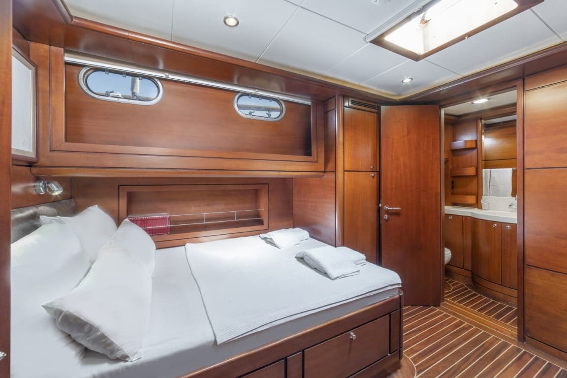 Hızır 1 guletimizde klimalı 2 double ve 2 twin kabin yer almakta olup toplamda 8 kişilik misafir gruplarını ağırlayabilmektedir. Her kamarada duş ünitesi ve ev tipi tuvalet bulunmaktadır. Misafirlerin konforu düşünülerek tasarlanan teknemizde, arka güvertede geniş minderli oturma alanı, yemek masası, sandalyeler ve dümen mevcuttur. Salonda ayrıca yemek masası, tam donanımlı mutfak, TV ve müzik sistemi bulunmaktadır. Ön güvertede ise tüm misafirlere yetecek kadar güneşlenme minderleri ve oturma alanı yer almaktadır.