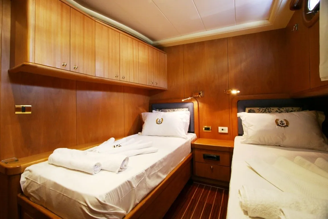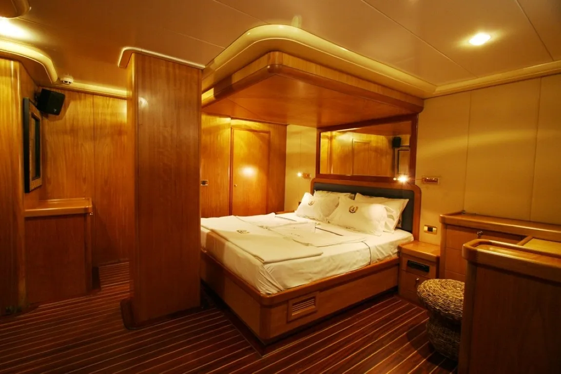 Bodrum Limanı çıkışlı olmakla birlikte, Türkiye’nin farklı kıyı bölgelerinde de hizmet verebilen Mein Schatz, 2 master, 2 double ve 1 twin olmak üzere toplam 5 kabiniyle 10 kişilik seçkin grupları ağırlama kapasitesine sahiptir. Her kabinde özel banyo, 24 saat aktif klima sistemi ve master ile double kabinlerde güvenli kasa bulunmaktadır. Teknede konfor, mahremiyet ve ferahlık bir arada sunulmaktadır.