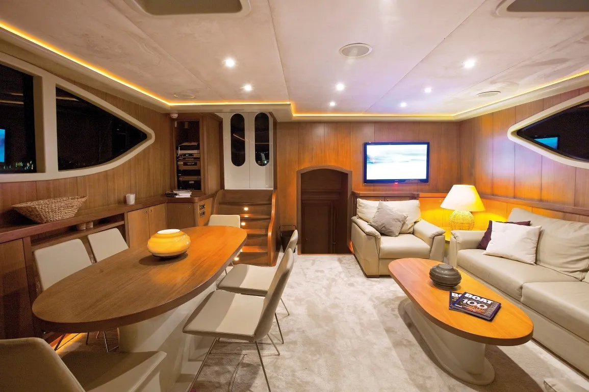 Yatın salonu ve güvertesi, zarif detaylarla dekore edilmiş olup, deniz manzarası eşliğinde yemek keyfi yapabileceğiniz geniş masalarla donatılmıştır. Gündüz güneşlenme alanlarında dinlenebilir, akşamları ise gün batımı eşliğinde huzur dolu anlar yaşayabilirsiniz. Salondaki tv ve müzik sistemiyle eğlencenizi sürdürebilir; ayrıca su sporları, balıkçılık ya da amatör dalış ekipmanlarıyla mavi yolculuğunuzda macera dolu saatler geçirebilirsiniz.