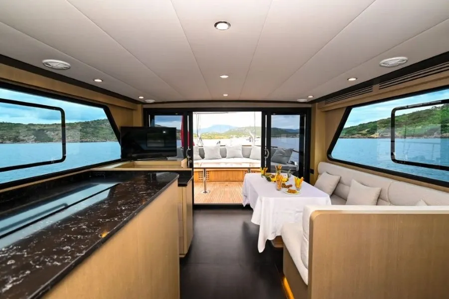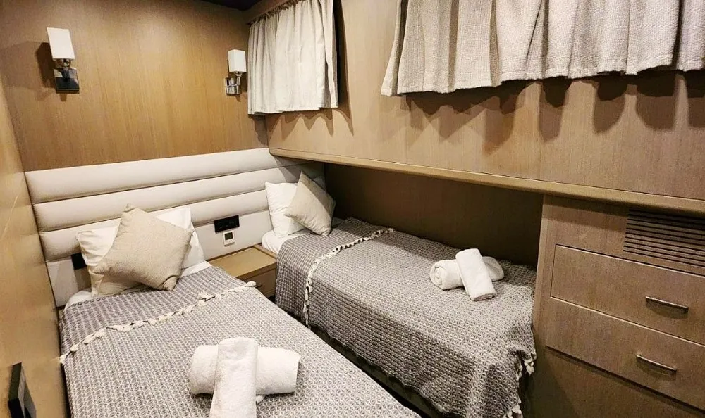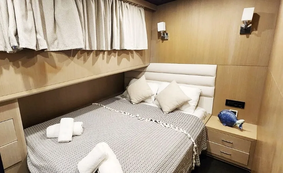 Moe 1 Guleti, 21 metre uzunluğa sahip, modern çizgileri ve zarif tasarımıyla öne çıkan özel bir Bodrum guletidir. 2021 yılında baştan sona yenilenen teknemiz, hem konfor hem de güvenlik açısından günümüz lüks gulet kiralama standartlarına tam uyum sağlamaktadır. Küçük gruplar için ideal olan Moe 1 Guleti, sakin, huzurlu ve ayrıcalıklı bir butik mavi tur deneyimi sunar. Toplam 6 kişilik konaklama kapasitesine sahip olan teknemizde 1 master, 1 double ve 1 twin kabin bulunmaktadır. Tüm kabinler ferah şekilde tasarlanmış olup her kabinde özel banyo, duş ve klima mevcuttur. Bu özellikleriyle Moe 1 Guleti, özellikle aileler ve arkadaş grupları için konforlu bir mavi yolculuk imkânı sağlar. Guletimizin arka güvertesinde geniş bir oturma alanı ve yemek masası yer almakta, ön güvertede ise güneşlenme minderleri ve denizin tadını çıkarabileceğiniz keyif alanları bulunmaktadır. Gün boyu Ege ve Akdeniz’in eşsiz koylarında yüzme, güneşlenme ve dinlenme fırsatı sunan Moe 1 Guleti, klasik gulet tatillerinden farklı olarak özel ve samimi bir atmosfer yaratır. 1 kaptan, 1 aşçı ve 1 gemiciden oluşan deneyimli ve güler yüzlü mürettebatımız, tatiliniz boyunca tüm ihtiyaçlarınızla yakından ilgilenir. Lezzetli yemekler, profesyonel hizmet ve kusursuz rota planlamasıyla Moe 1 Guleti, Bodrum çıkışlı kiralık gulet arayan misafirler için ideal bir tercihtir. Lüks, konfor ve huzuru bir arada yaşamak isteyenler için Moe 1 Guleti ile mavi tur hayalinizi gerçeğe dönüştürebilirsiniz.