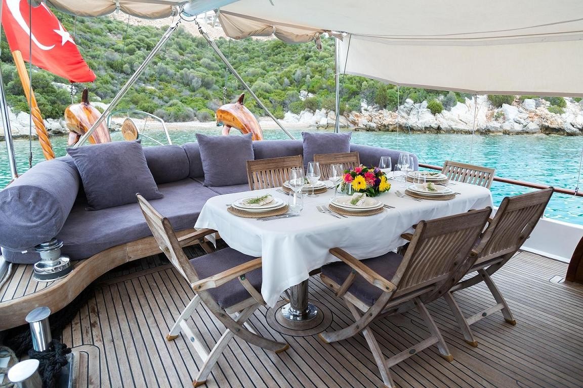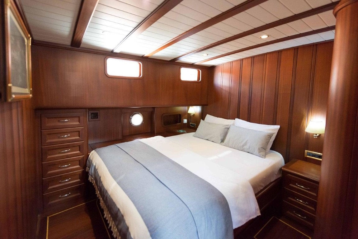 Salon kısmında bulunan tam donanımlı mutfağı ve geniş oturma alanları sayesinde misafirlerimize rahat bir tatil atmosferi sunmaktadır. Hava ve deniz şartlarının uygun olduğu zamanlarda yelken seyri de yapabileceğiniz bu özel gulet, size doğayla iç içe bir deneyim yaşatacaktır.