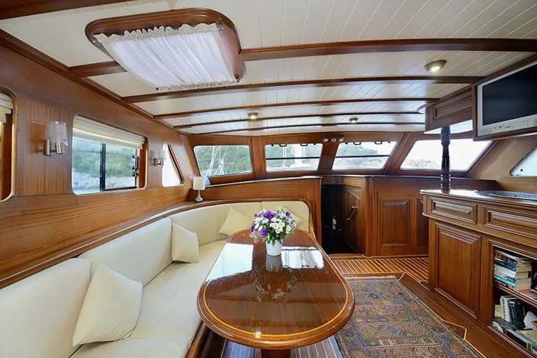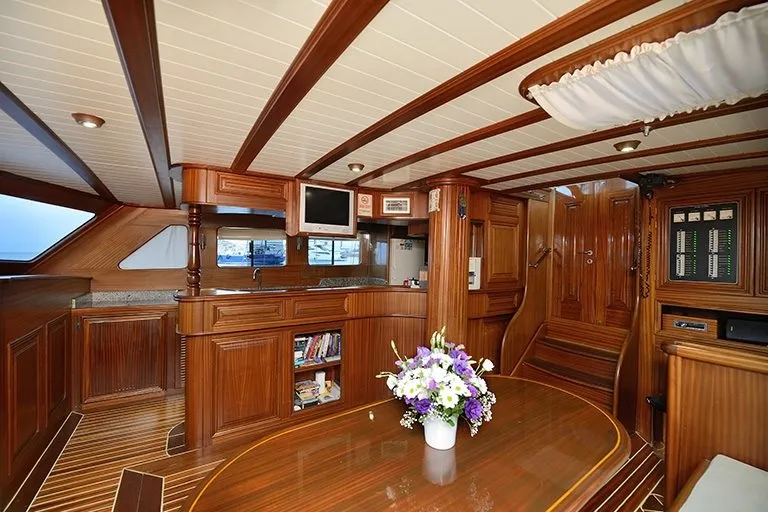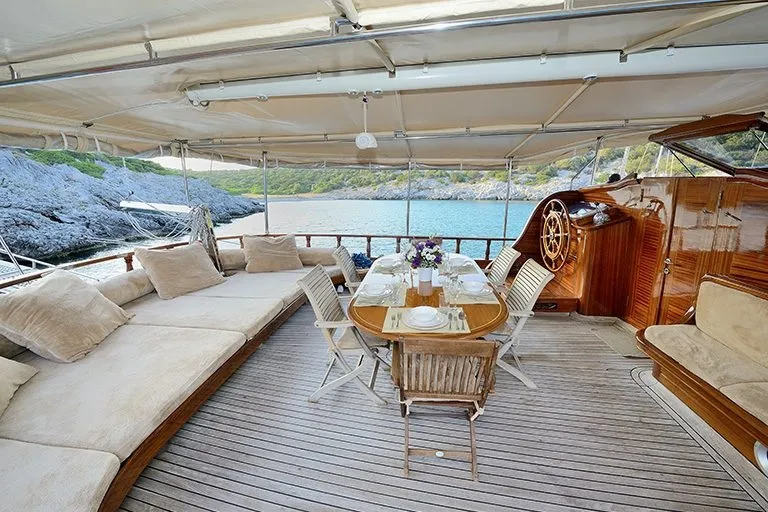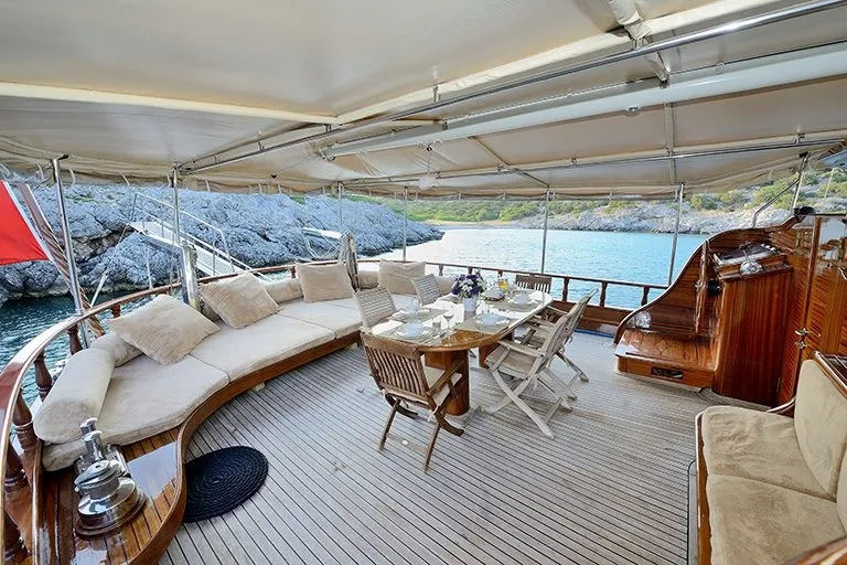 Teknemizin ön kısmında, deniz manzarası eşliğinde keyifle dinlenebileceğiniz oturma alanı, masa ve her misafire yetecek sayıda güneşlenme minderleri bulunmaktadır. Arka güvertede ise geniş ve rahat oturma grubu, büyük yemek masası ve sandalyeler ile tüm grup birlikte unutulmaz akşam yemekleri tadabilir.