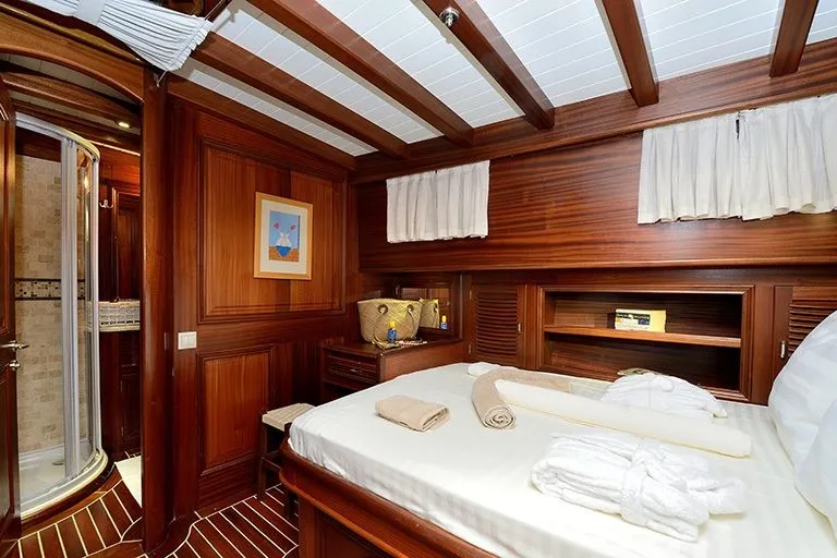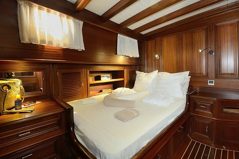 Toplamda 2 double ve 2 twin kabini bulunan teknemiz, 8 kişilik küçük aile ve arkadaş gruplarının rahatlıkla konaklayabileceği şekilde dizayn edilmiştir. Kiralık Bodrum guletleri arasında geniş yaşam alanları ve kullanım kolaylığı ile ön plana çıkan Samarkand, konforu ve huzuru bir arada yaşamanız için tasarlanmıştır.