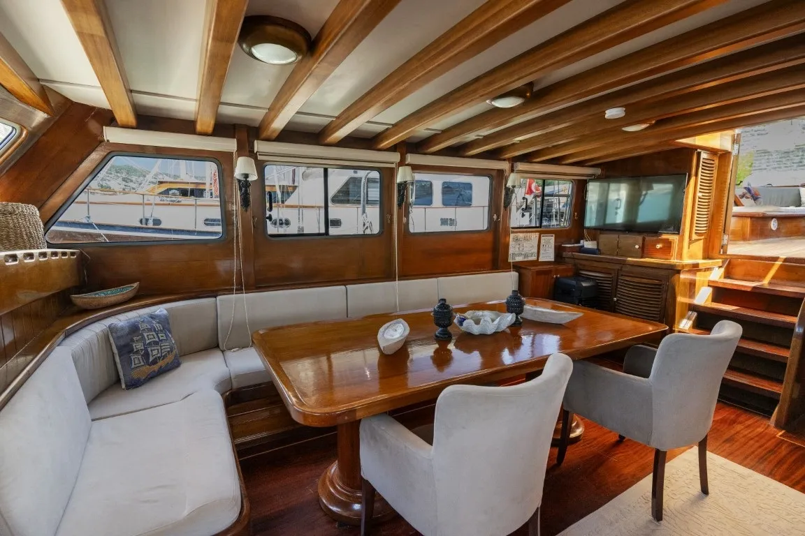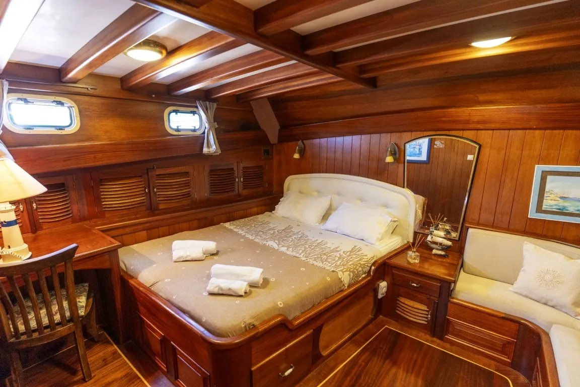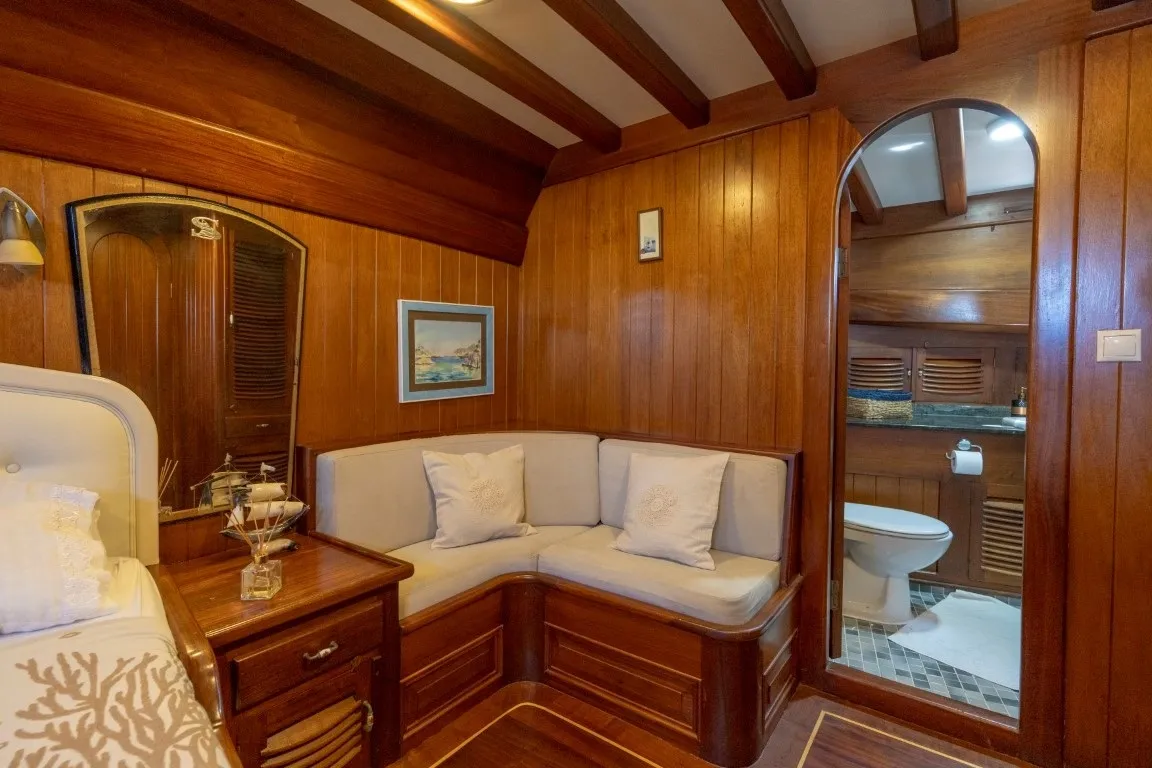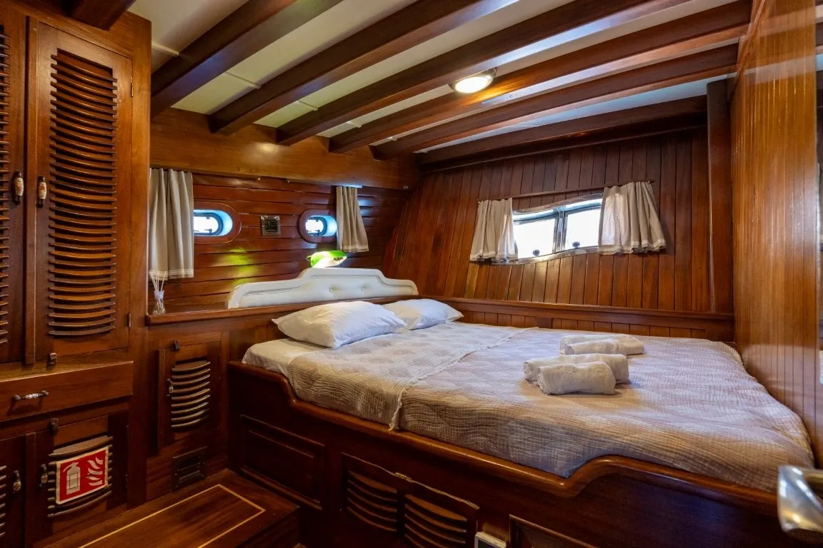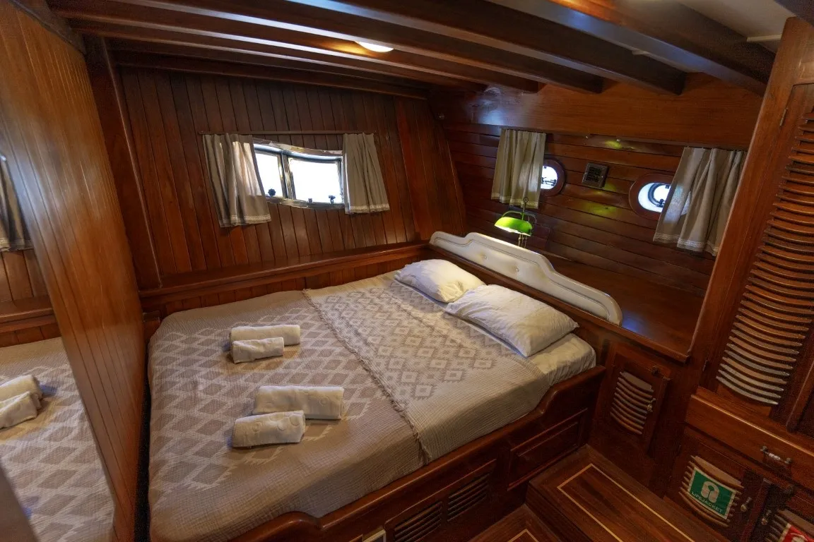 Bodrum Limanı çıkışlı lüks plus gulet kiralama kategorisinde yer alan Serenad teknesi 29 metre uzunluğu ve 7.3 metre genişliği ile benzersiz bir mavi yolculuk deneyimi sunmaktadır. 2003 yılında yapımı tamamlanıp denize indirilen bu klasik ahşap gulet, şık dokunuşlarla dekore edilmiştir ve 12 kişilik nezih misafir gruplarını ağırlayabilmektedir. 1 master, 2 double, 3 twin olmak üzere toplam 6 kabin bulunmaktadır. Tekne, konforlu ve lüks bir tatil için tüm ihtiyaçları karşılayacak şekilde tasarlanmıştır. Mavitur servisi konusunda profesyonel 1 kaptan, 1 aşçı ve 2 gemici ile hizmet veren bu gulet, misafirlerine en yüksek hizmet kalitesini sunmaktadır. Serenad teknesi hakkında detaylı bilgi almak için gulet kiralama departmanımızla iletişime geçebilirsiniz.