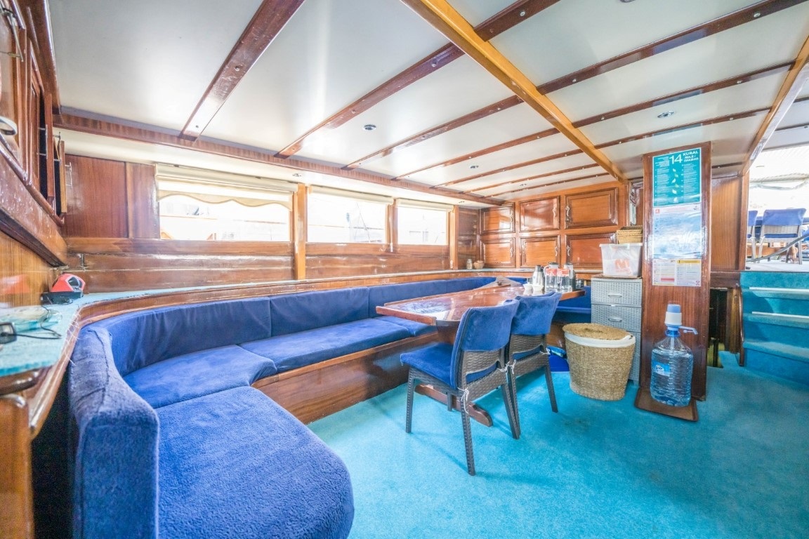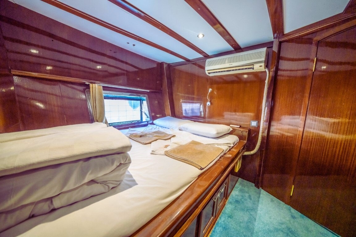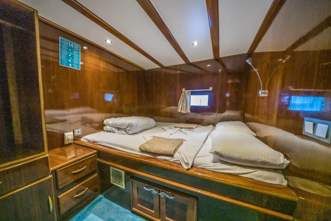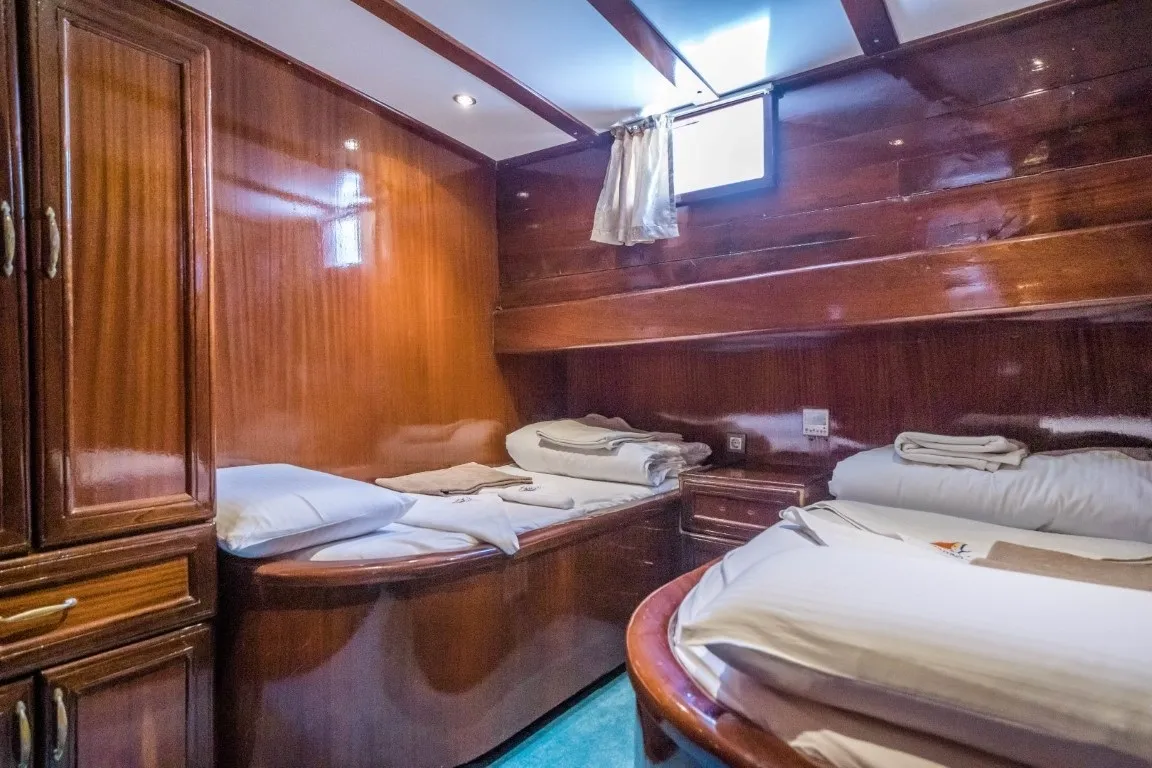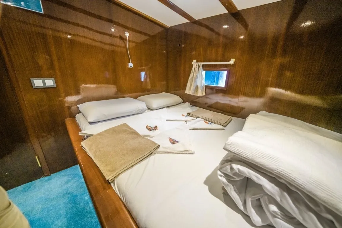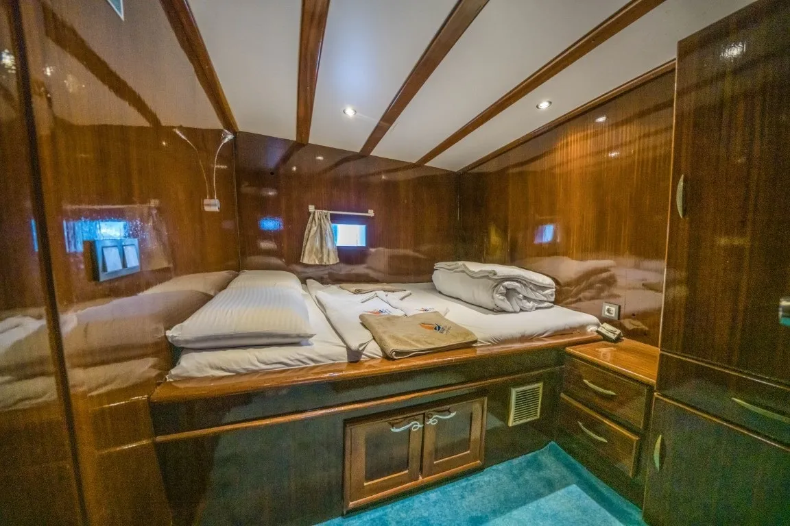 1997 yılında Bodrum Tersanesi’nde inşa edilen ve takip eden yıllarda düzenli olarak yenilenen Turquoise Seas guletimiz, lüks bir mavi yolculuk deneyimi sunmak üzere tasarlanmış olup 4 kişilik profesyonel mürettebatıyla hizmet vermektedir. Geniş yaşam alanlarına sahip teknemizde, 6 double ve 2 twin kabin olmak üzere toplam 8 kabin bulunmakta ve 16 kişilik misafir kapasitesi sunulmaktadır. Tüm kabinlerde duş ve wc yer almakta, böylece misafirlerimize konforlu ve keyifli bir tatil imkânı sağlanmaktadır.