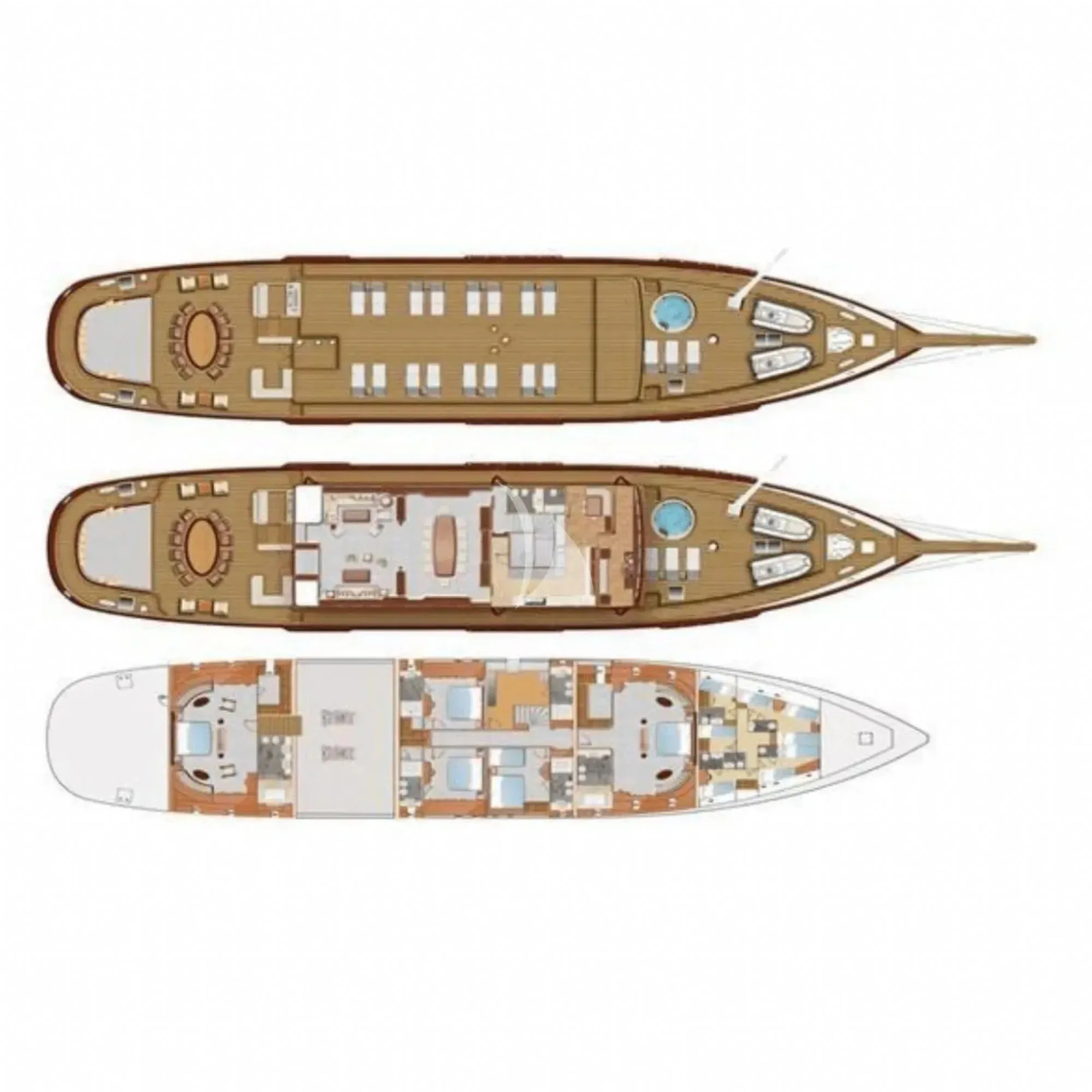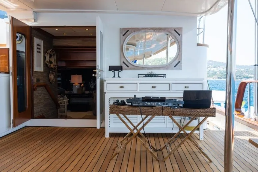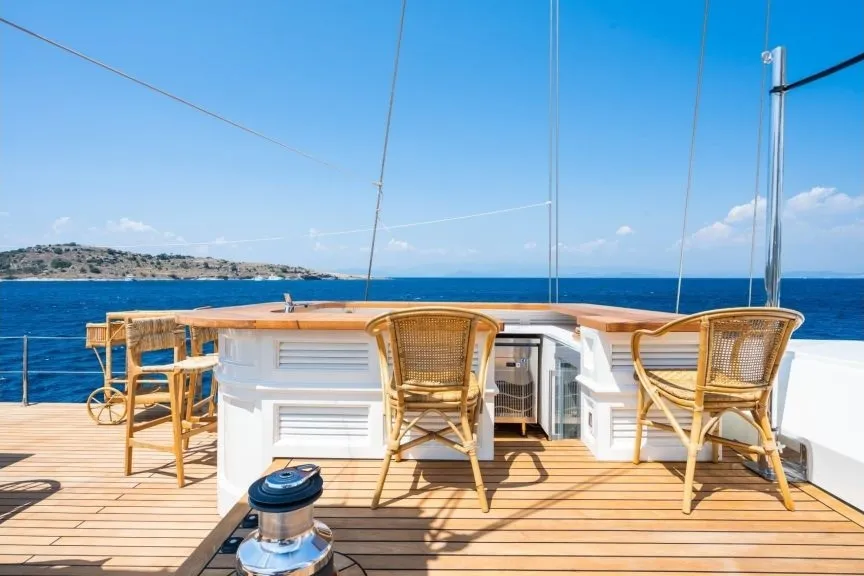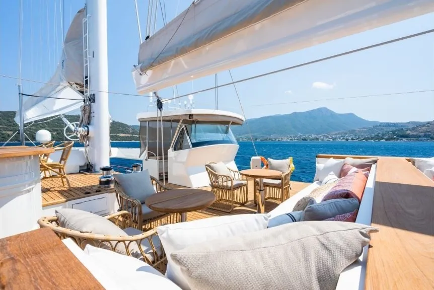 Her detayı özenle tasarlanmış geniş güverteleri, seyir halindeyken bile konforlu vakit geçirmenizi sağlıyor. Arka güvertede oturma grubu, yemek masası ve bar, ön güvertede güneşlenme minderleri, jakuzi ve keyifli bir yemek alanı, üst güvertede ise oturma alanları, bar ve ikinci bir jakuzi bulunuyor. Tüm alanlar, misafirlerin rahatlığı için en iyi şekilde düşünülerek tasarlandı.