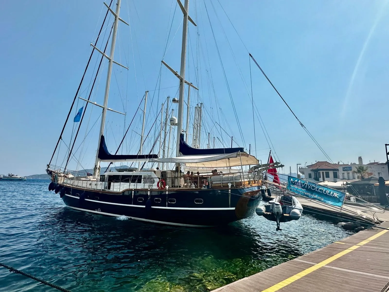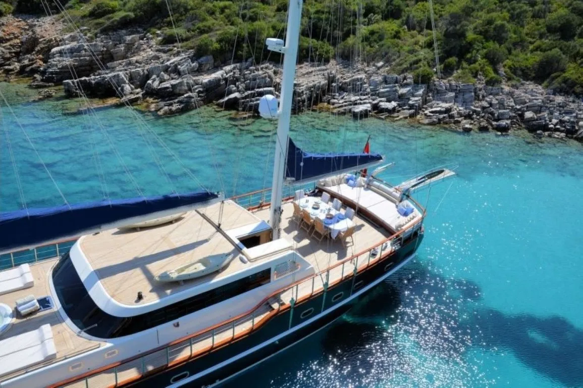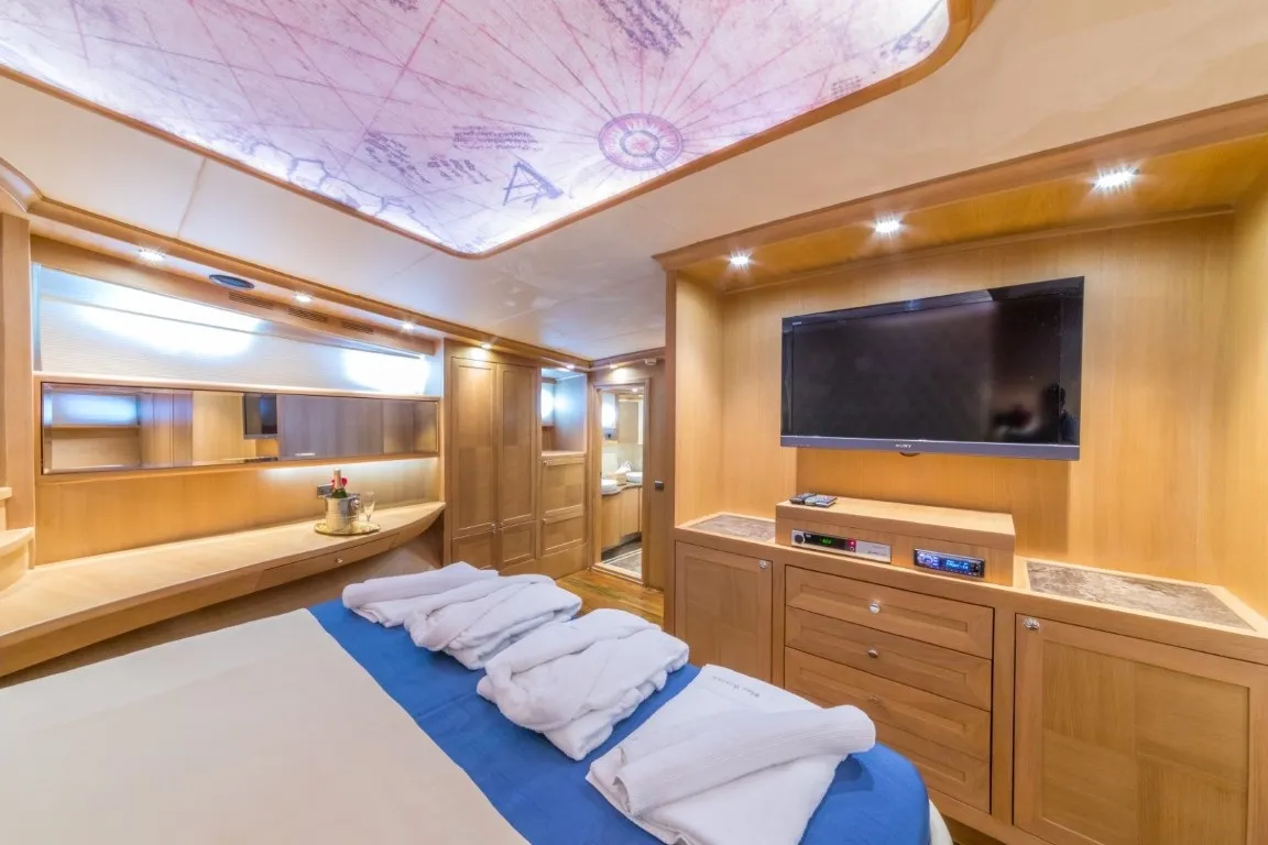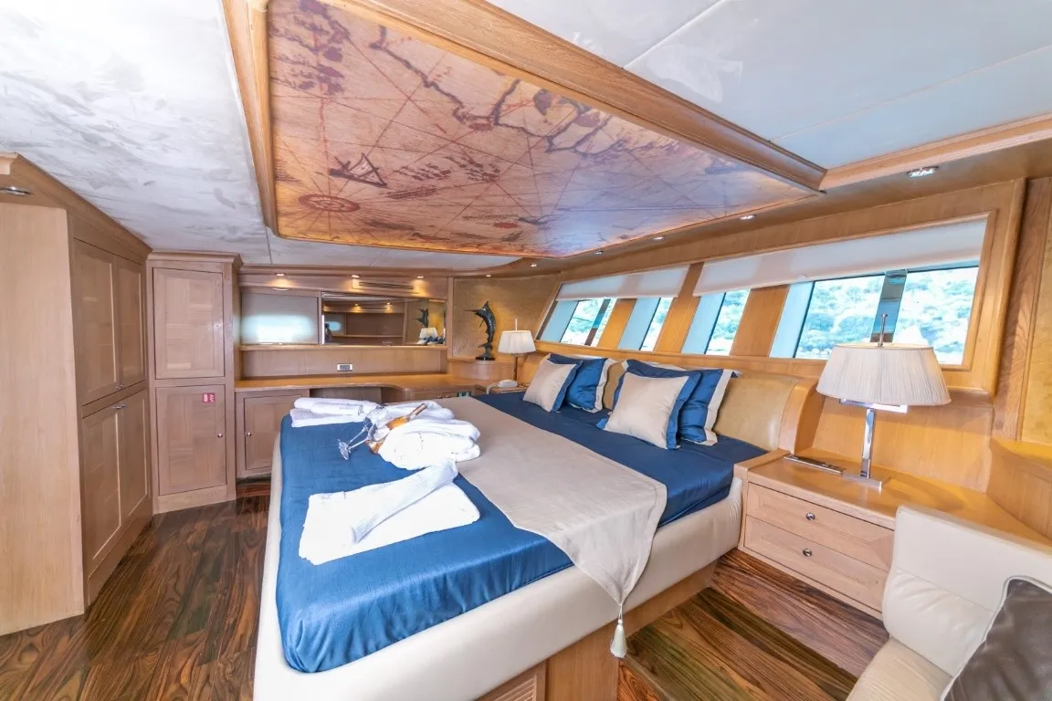 Bodrum Limanı'na bağlı olan ve 5 kabine sahip teknemizde, tüm detaylar klasik ve modern bakış açısı harmanlanarak yüksek kalitede dizayn edilmiştir. 2 master, 2 twin ve 1 single kabini ile 9 misafiri ağırlayabilen teknemizin, tüm kabinlerinde TV, 24 saat hizmet verebilen klima ve ebeveyn banyosu bulunmaktadır. Ayrıca master kabinlerinde jakuzi ve buhar banyosu olan teknemizin, ön güvertesinde de ikinci bir jakuzi mevcuttur.