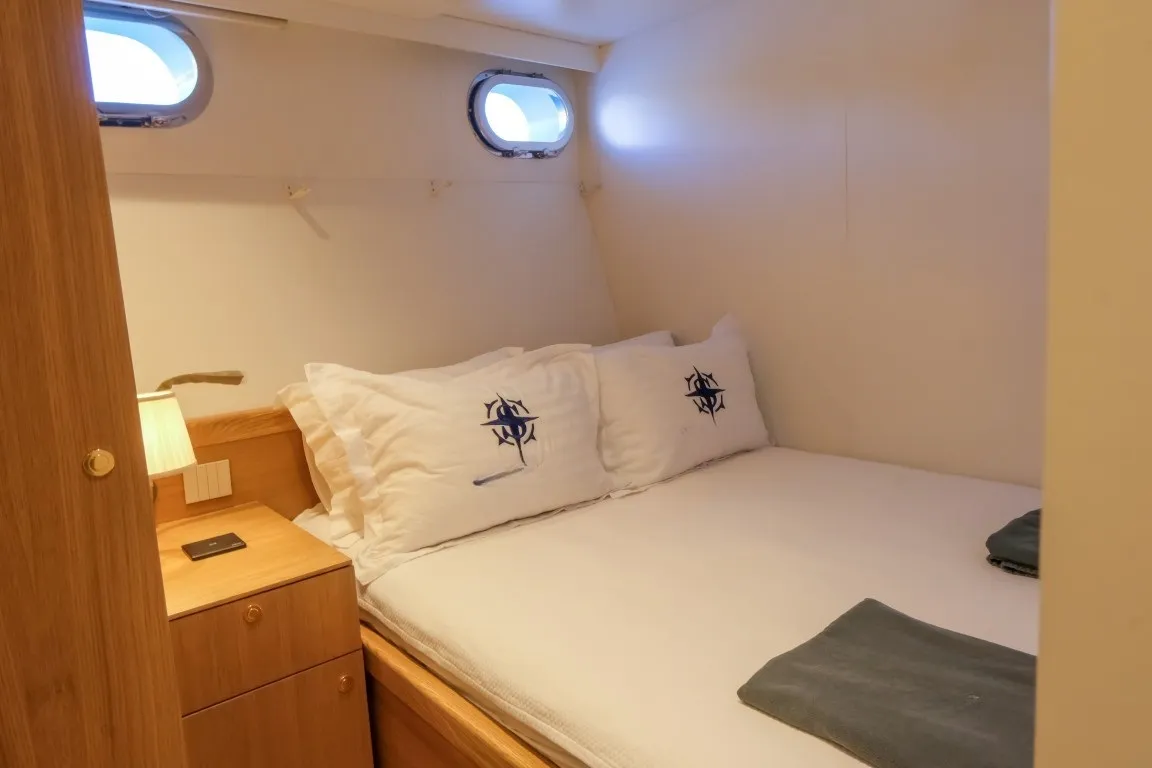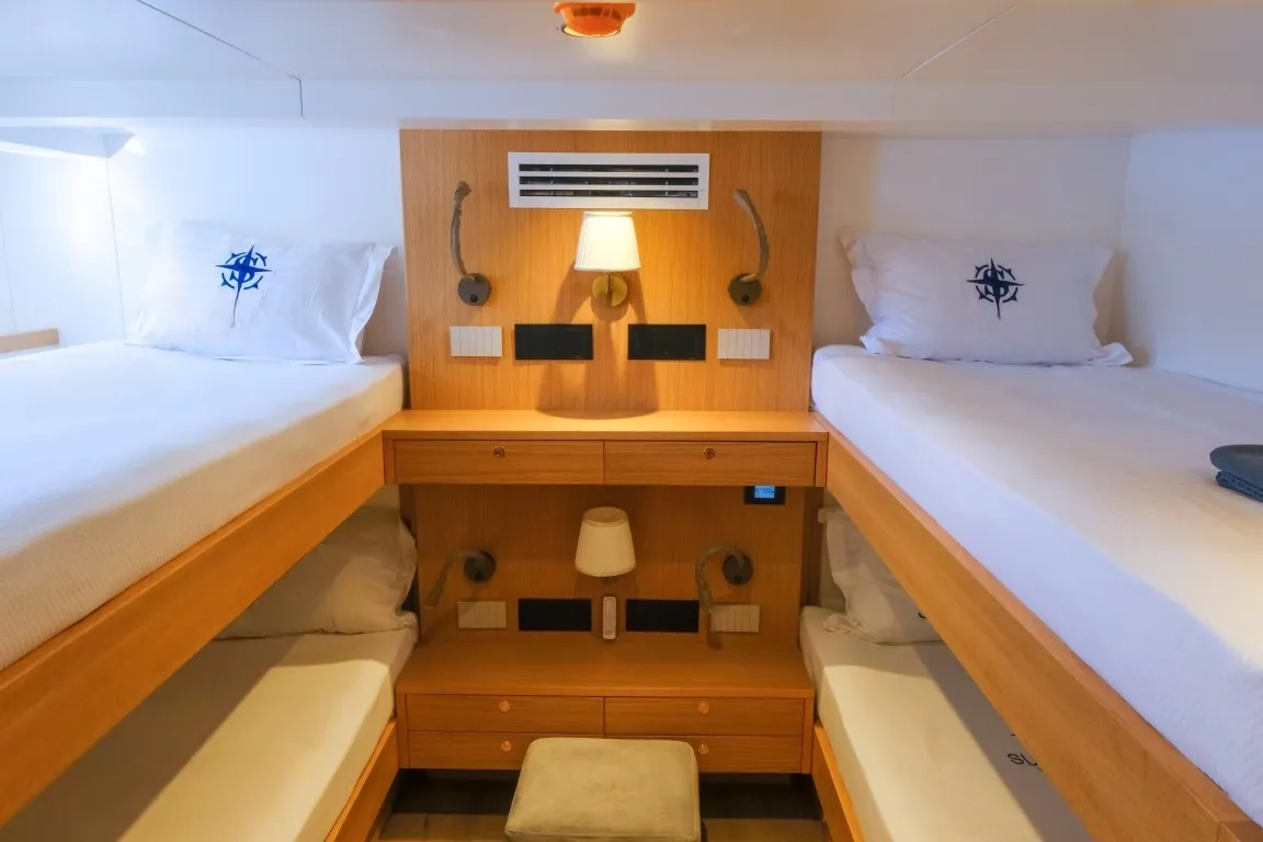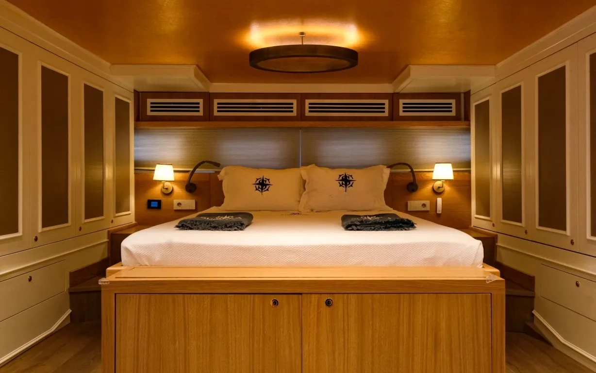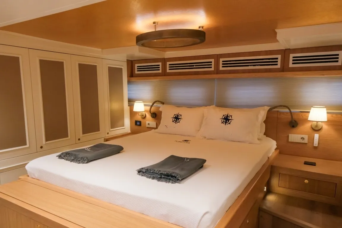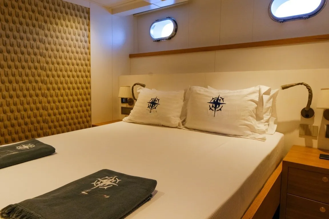 Teknede 5 geniş kabin yer almakta olup, bu kabinlerin dağılımı 1 master, 3 double ve 1 dört kişilik (quad) kabin şeklindedir. Her kabin, özel duş kabini, ev tipi tuvalet, klima, televizyon ve müzik sistemi gibi detaylarla donatılmıştır. Salonda modern mobilyalarla döşenmiş geniş bir oturma alanı, bar ve yemek masası yer alır. Ayrıca ayrı personel kabini sayesinde misafir mahremiyeti maksimum seviyede korunur.