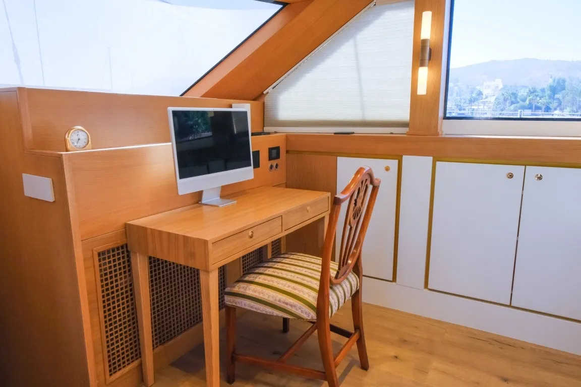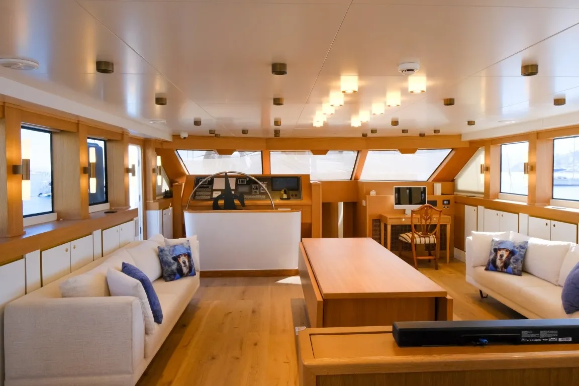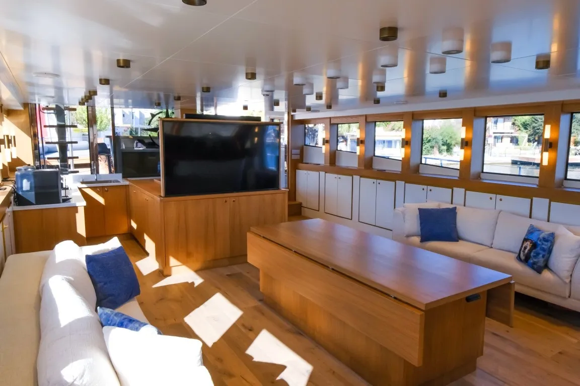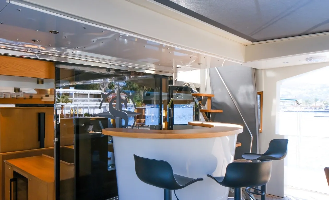 Teknede 5 geniş kabin yer almakta olup, bu kabinlerin dağılımı 1 master, 3 double ve 1 dört kişilik (quad) kabin şeklindedir. Her kabin, özel duş kabini, ev tipi tuvalet, klima, televizyon ve müzik sistemi gibi detaylarla donatılmıştır. Salonda modern mobilyalarla döşenmiş geniş bir oturma alanı, bar ve yemek masası yer alır. Ayrıca ayrı personel kabini sayesinde misafir mahremiyeti maksimum seviyede korunur.