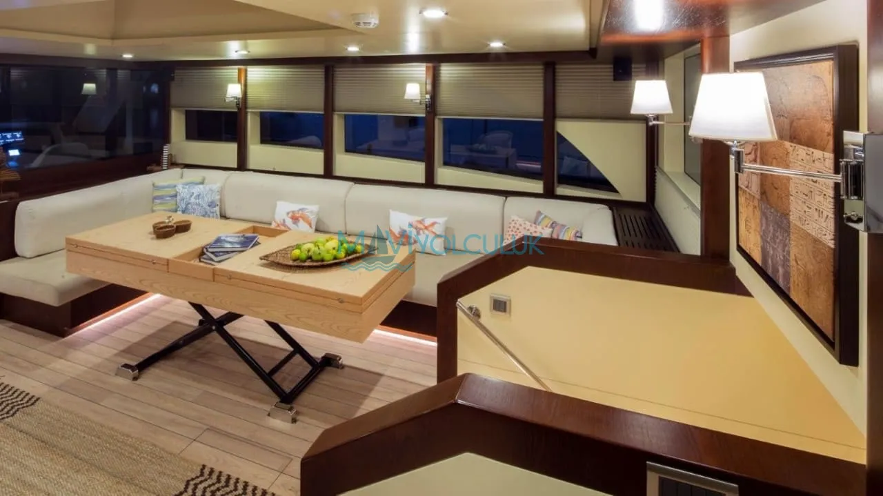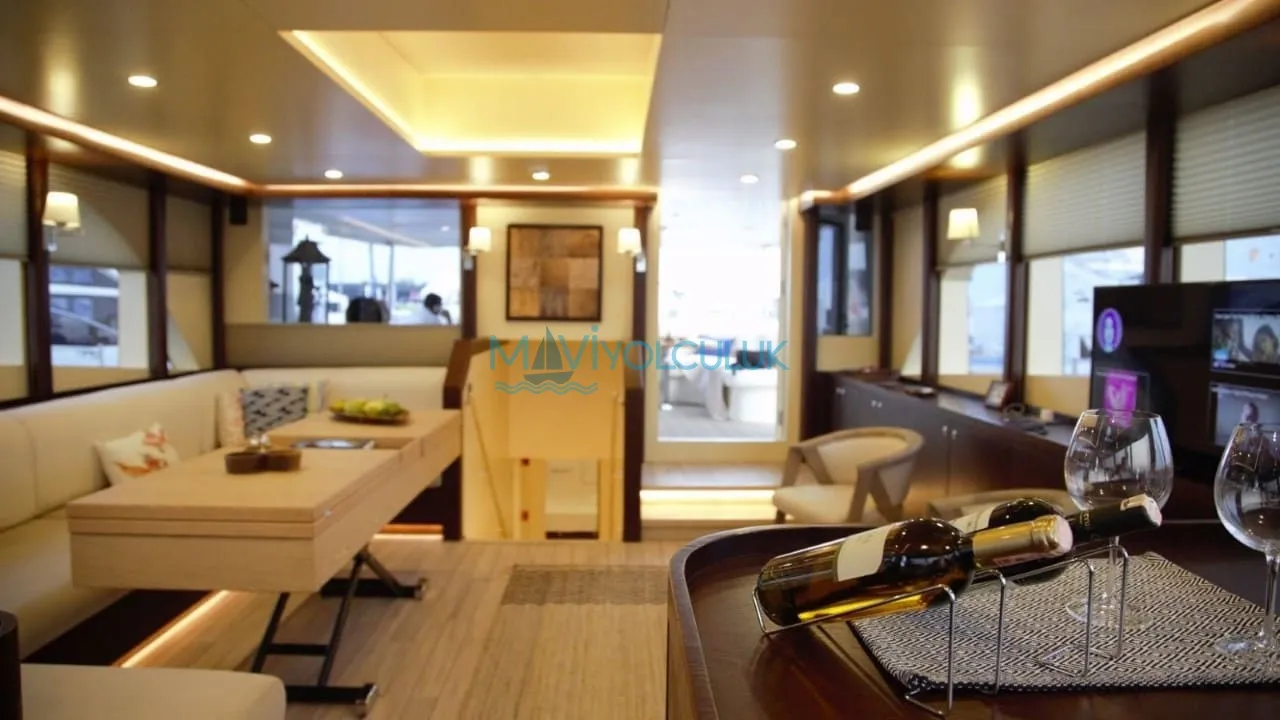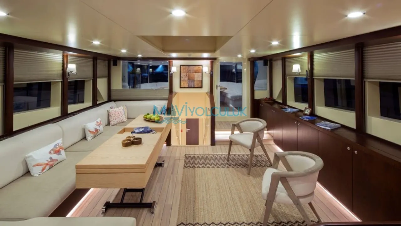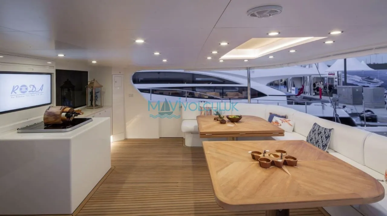 Yatımızın arka güvertesinde ‘’U’’ şeklinde bir oturma grubu ve büyük bir yemek masası ve küçük bir açılır kapanır platform bulunmaktadır. Ön kısmında bütün misafirlerimize yetecek güneşlenme minderleri ve güneşlenme alanı bulunmaktadır. Kiralık teknemizin arkasında bulunan ve denize doğru inen, 2 sandalye ve bir sehpanın sığabileceği özel bir platform bulunmaktadır.