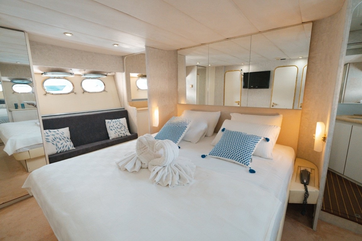 İki adet 1050 HP motor gücü ve iki adet 30 KVA jeneratöre sahip olan yatımız, 24 saat kesintisiz klima imkanı ile denizde konforu garanti eder. Performansı ve konforu bir arada sunan bu lüks motoryat, bölgede en uygun motoryat seçeneklerinden biri olarak öne çıkmaktadır.