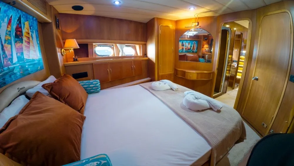 20.5 metre uzunluğundaki Sirocco motoryatımız, şıklığı ve konforu bir araya getiren tasarımıyla unutulmaz bir mavi yolculuk deneyimi sunuyor. 2002 yılında inşa edilen ve 2022’da kapsamlı bir yenileme sürecinden geçirilen Sirocco, modernize edilmiş iç ve dış mefruşatı, yenilenen kabinleri, güvertesi ve banyolarıyla misafirlerine lüks bir tatil vaat ediyor.