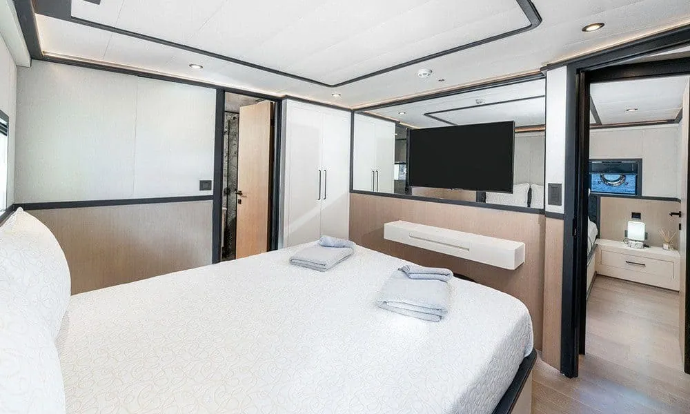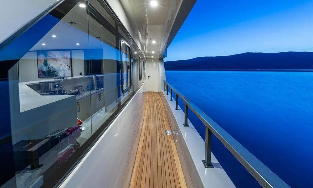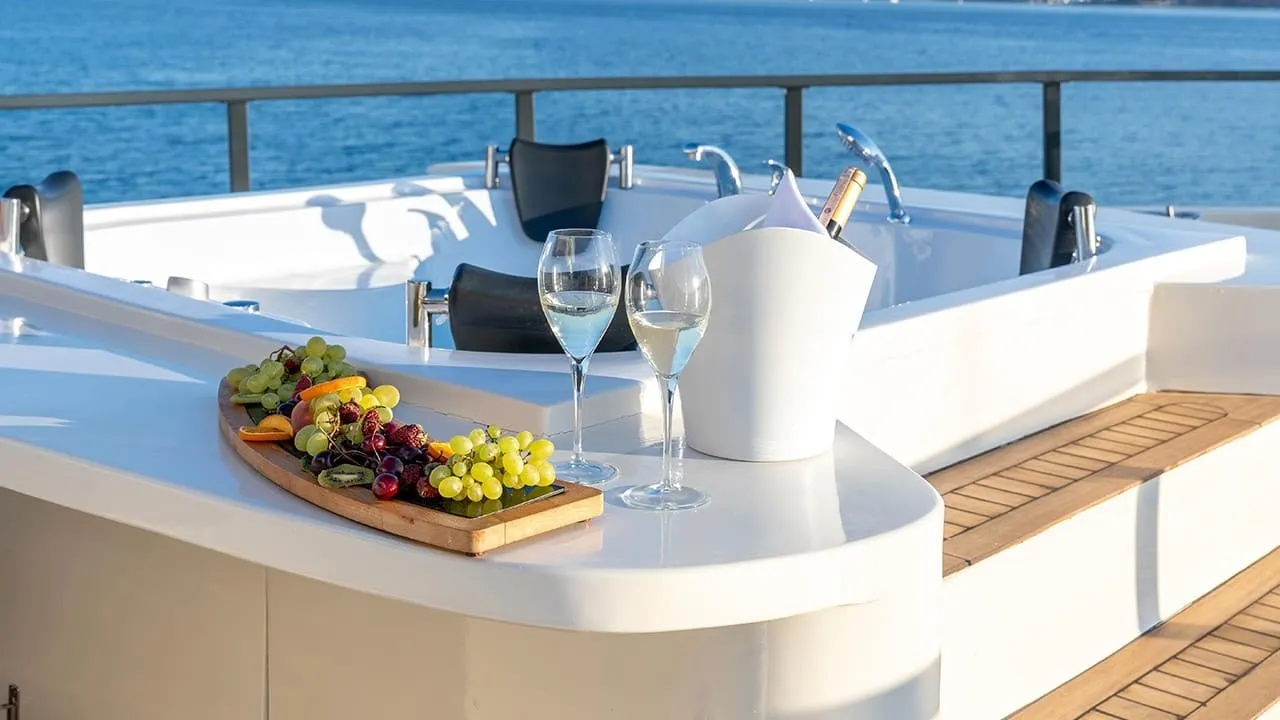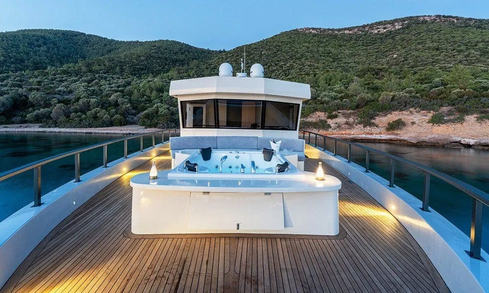 30 metre uzunluğunda olan lüks yatımız, 6 kabiniyle toplamda 12 kişilik misafir gruplarına hizmet verebilmektedir. Bodrum, Marmaris, Fethiye, Göcek ve Yunan Adaları rotalarında mavi yolculuk yapmak isteyen misafirlerimiz için eşsiz bir tercih olan teknemizin ön güvertesinde şık bir oturma grubu ve jakuzi bulunmaktadır. Arka güvertede konforlu oturma alanı ve büyük yemek masası, flybridge bölümünde ise Amerikan bar, oturma grupları, masa ve güneşlenme minderleri yer almaktadır.