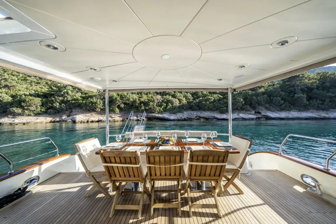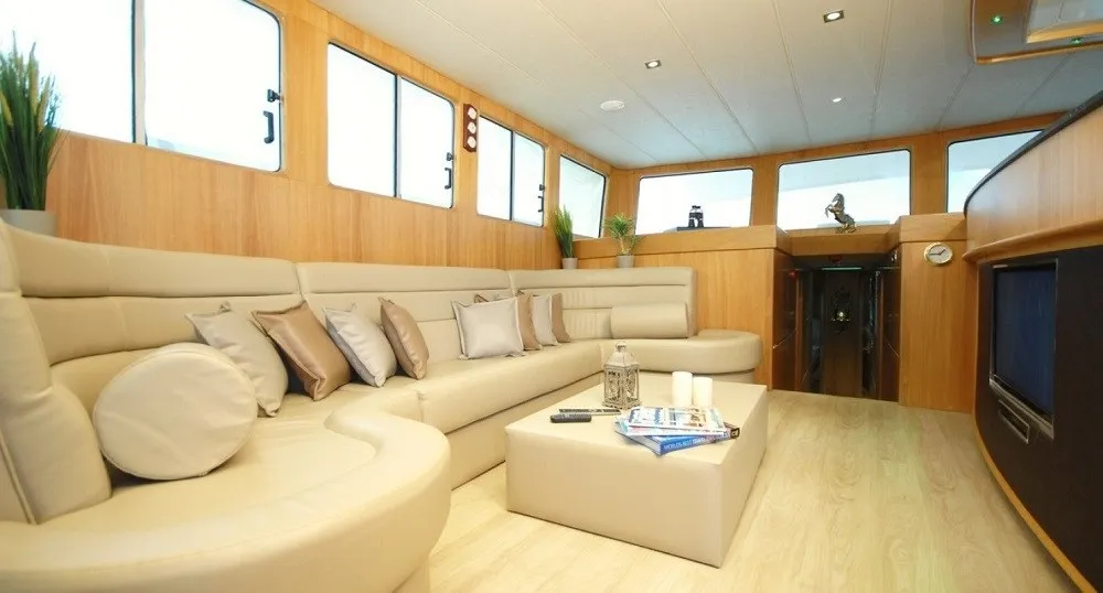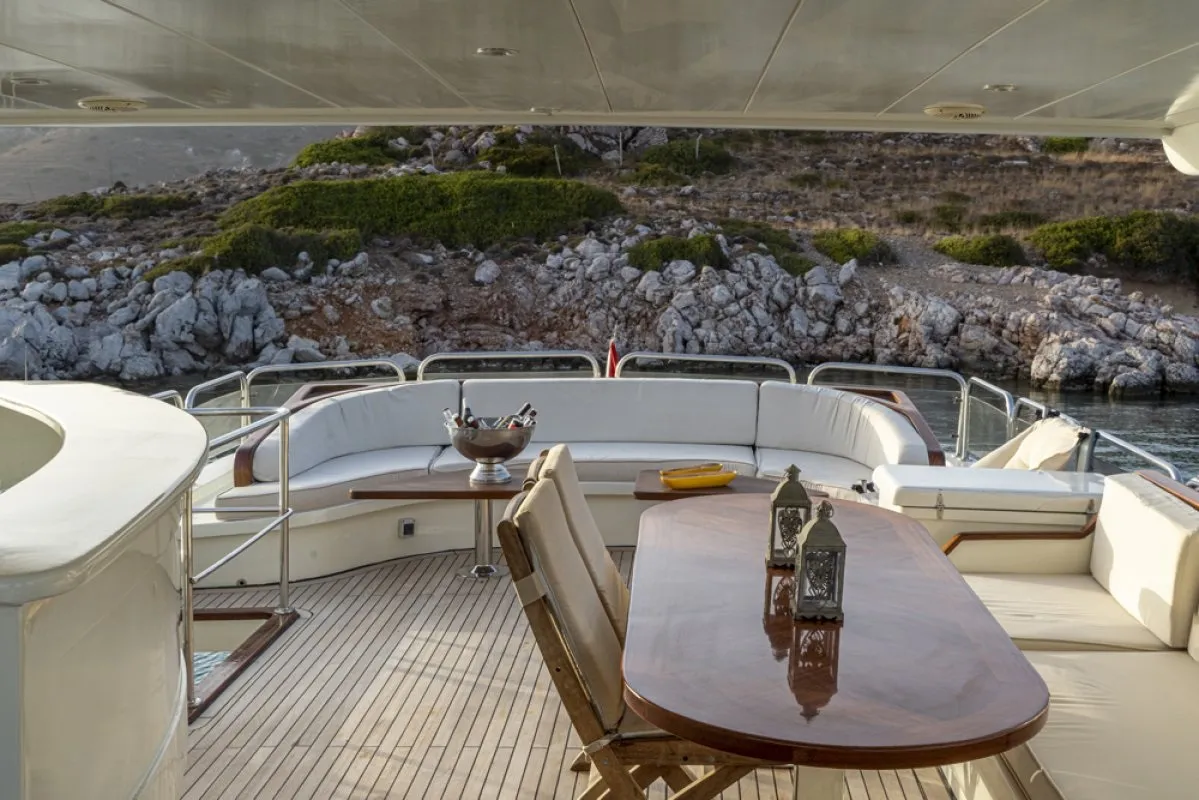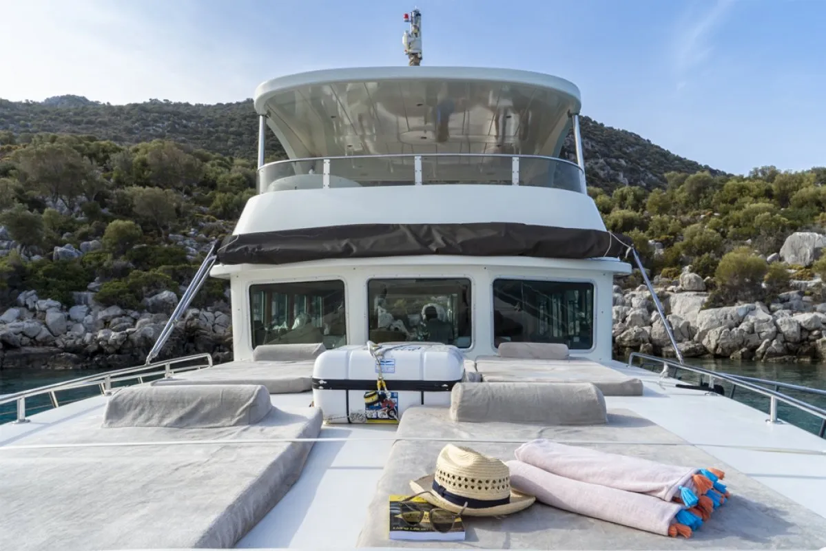Ana güvertede geniş bir salon ve denize karşı yemek keyfi yapabileceğiniz şık bir masa bulunurken, flybridge bölümünde güneşlenme minderleri ve rahat oturma alanları yer alır. Bu alan, sevdiklerinizle gün batımını izlemek ya da yıldızların altında dinlenmek için idealdir. Denize kolay erişim sağlayan özel platform ise yüzme molalarınızı çok daha rahat ve güvenli hale getirir.