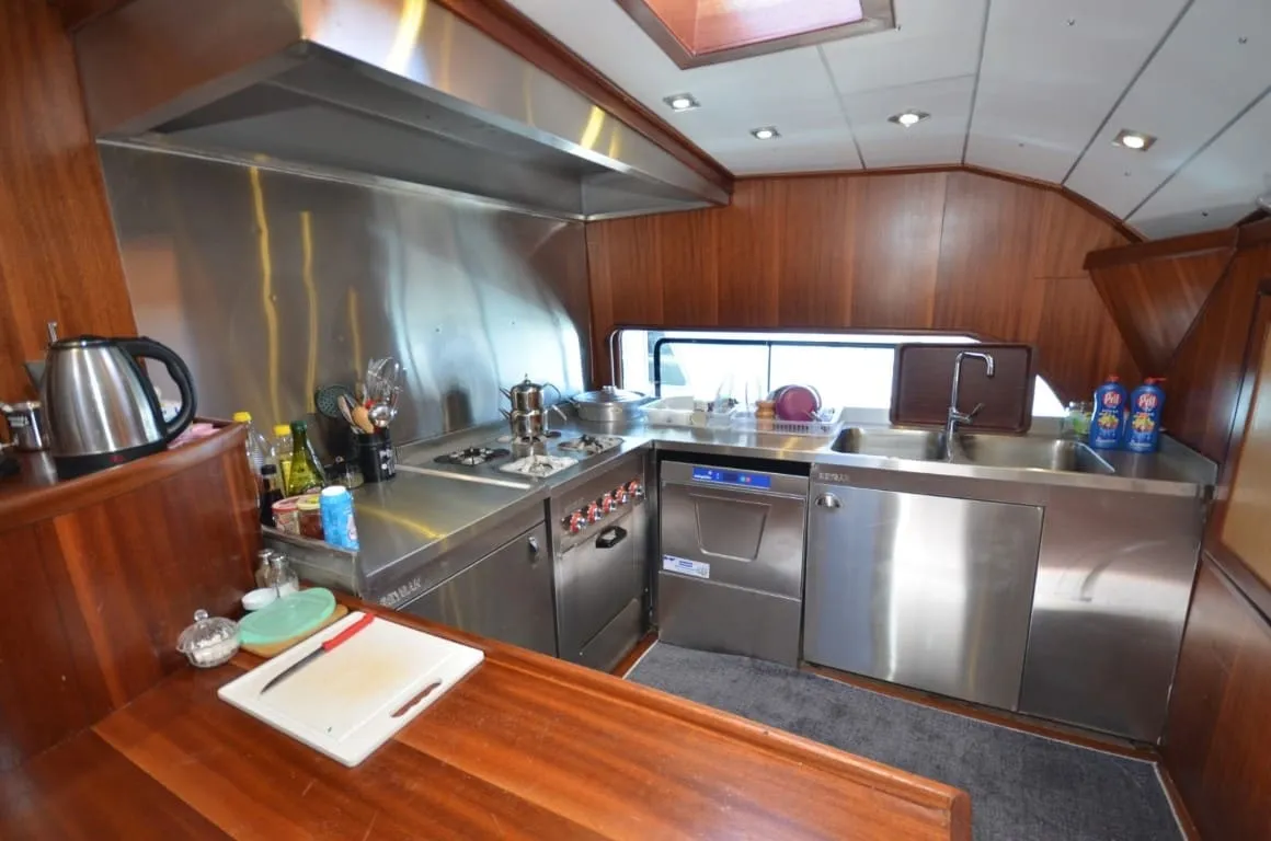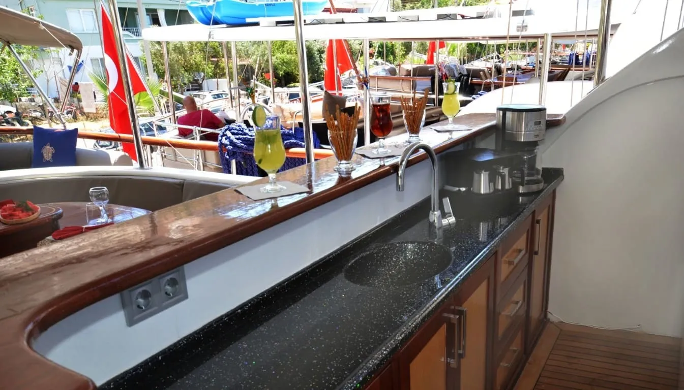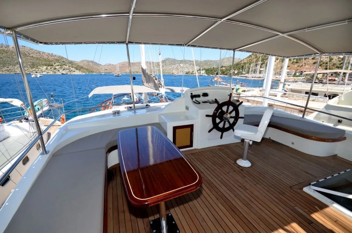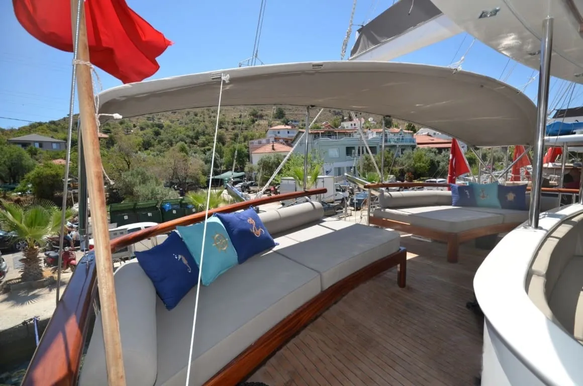 Arka güvertede, gün boyu keyifli vakit geçirebileceğiniz geniş bir yemek ve oturma alanı, ön güvertede ise deniz manzarasına karşı huzur içinde dinlenebileceğiniz güneşlenme minderleri bulunmaktadır. Mavi yolculuk keyfini zirveye taşıyan deneyimli 4 kişilik mürettebatı, misafirlerine kusursuz hizmet sunarken, şefimizin hazırladığı lezzetli yemekler ile tatilinizin her anı unutulmaz hale gelir.