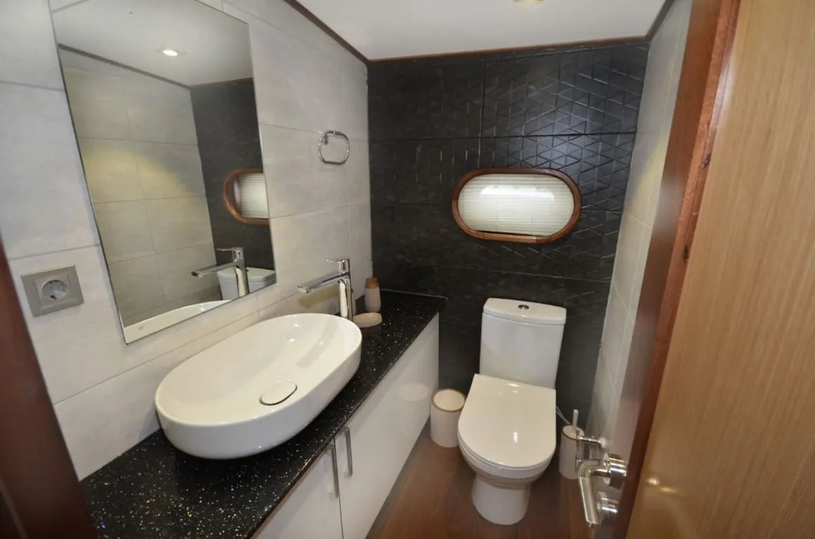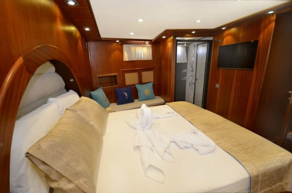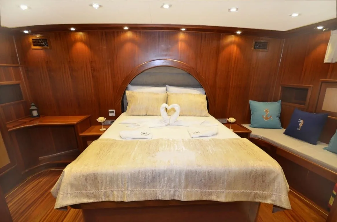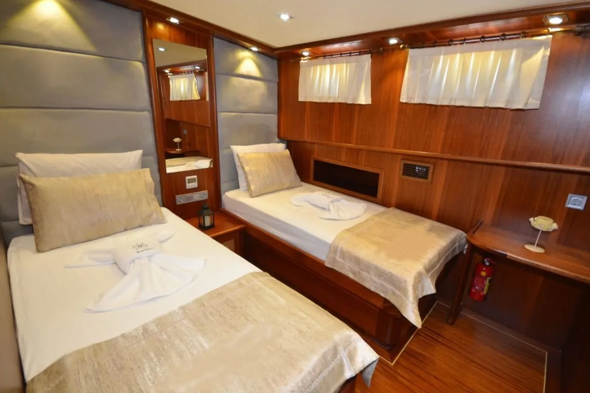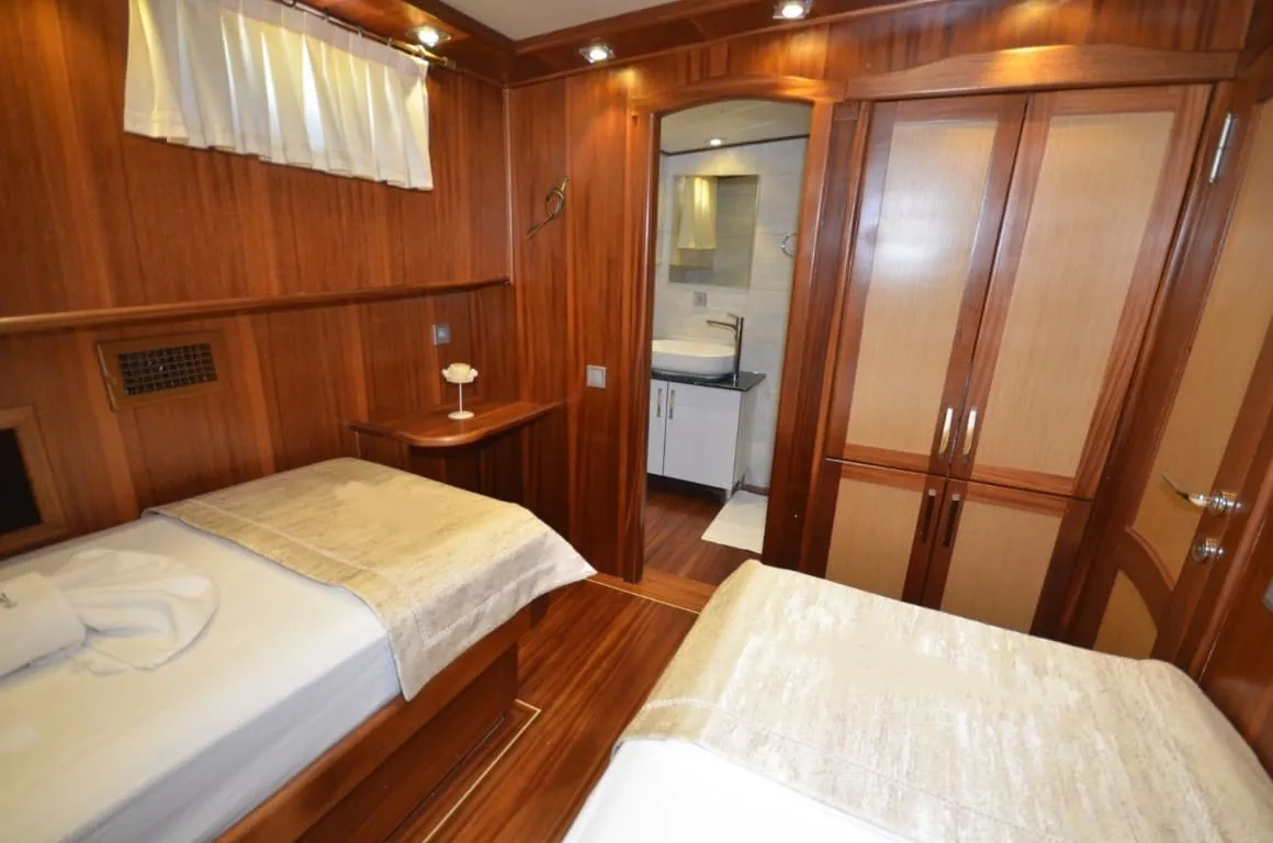 12 kişiye kadar misafir ağırlayabilen Arın Deniz gulet, 2 master, 2 double ve 2 twin kabin düzenine sahiptir. Her kabin, özel duş ve wc ile donatılmış olup, modern tasarımıyla ev konforunda bir konaklama deneyimi sunar. Yaz sıcaklarında konforunuzdan ödün vermemeniz için teknemizde klima hizmeti 2 - 4 saat sağlanmaktadır.