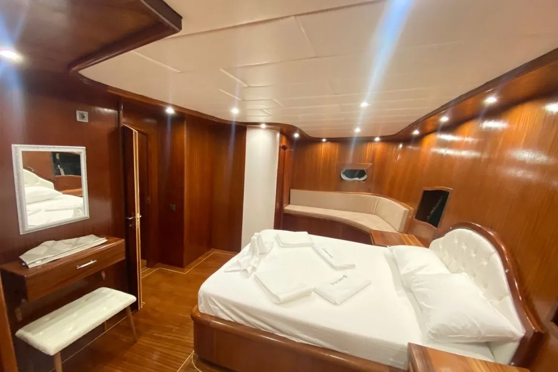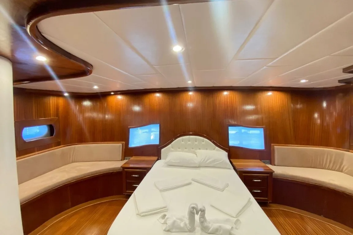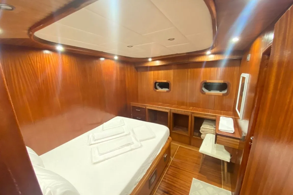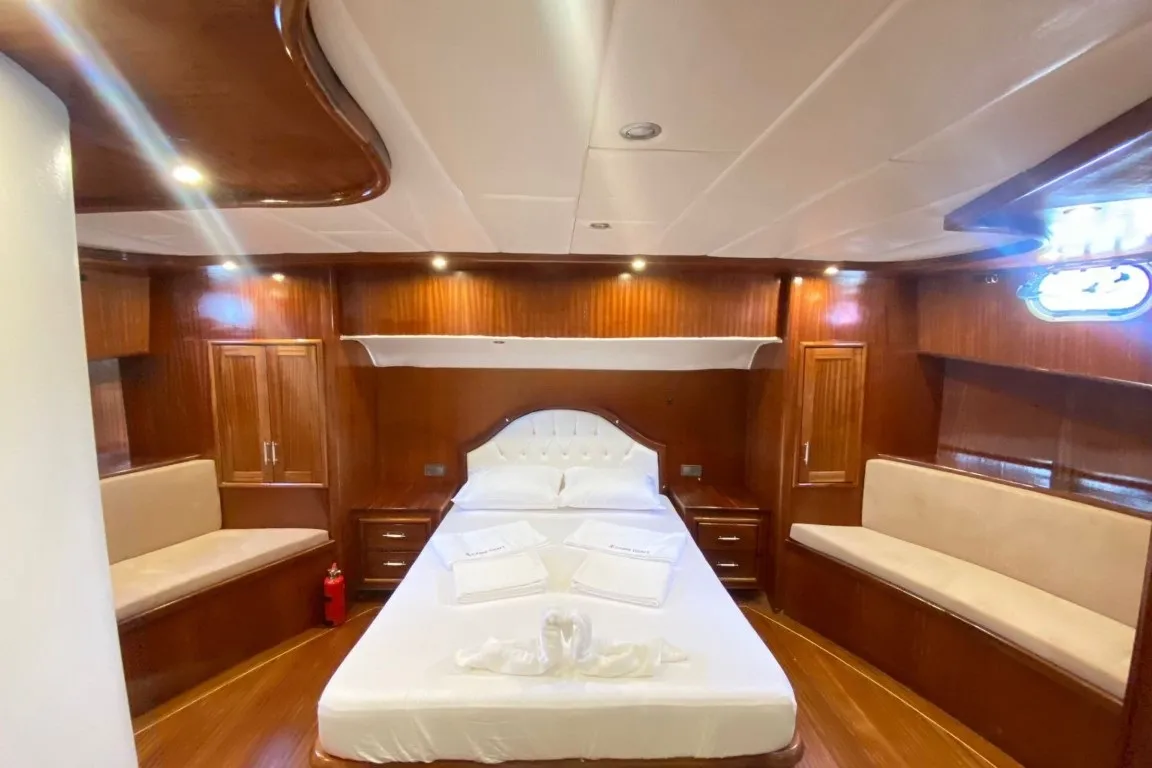 Marmaris Limanı çıkışlı tekne kiralama seçenekleri arasında öne çıkan Carpe Diem 1, 6 kabininde misafirlerini ağırlamaktadır. 2 master, 2 double ve 2 triple kabininde wc, duşakabinli banyo ve gün içinde 4-6 saat arasında klima hizmeti bulunmaktadır. Ferah iç mekanları ve geniş güvertesiyle tam not alan guletimiz, hem iç hem de dış alanlarda misafirlerimizin konforunu düşünerek tasarlanmıştır.