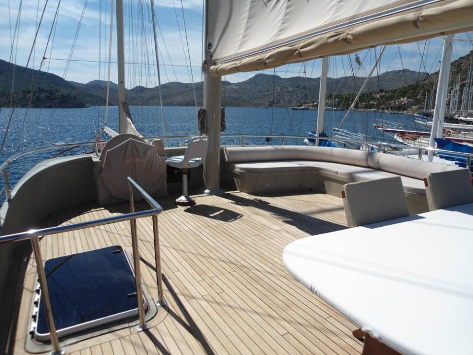 Teknemizin arka güvertesinde oturma grubu, yemek masası, bar, üst tente ve yan tente bulunmaktadır. Ön güvertede rahat bir oturma grubu, güneşlenme minderleri ve açılır kapanır tente yer alırken, üst güvertede ise dümen, yemek masası, oturma grubu ve açılır kapanır tente mevcuttur.