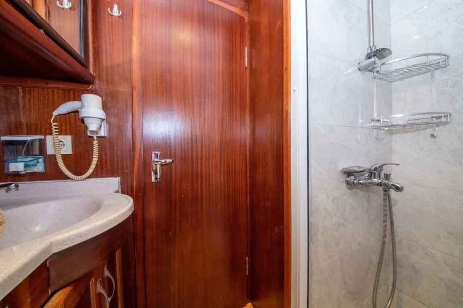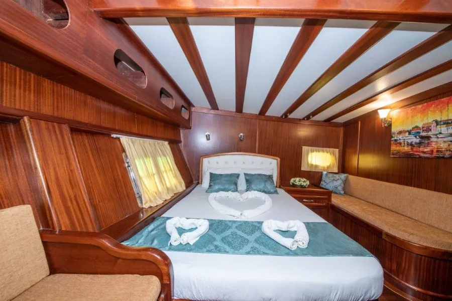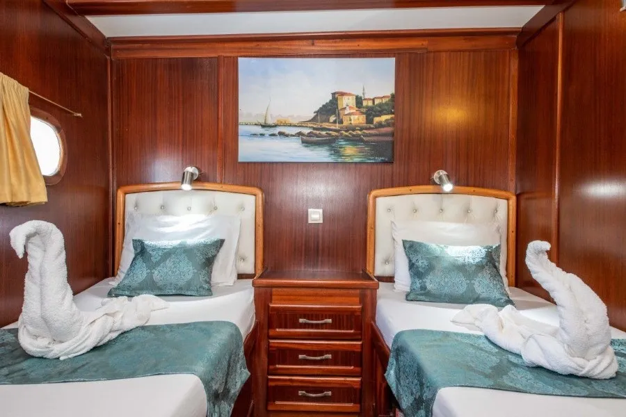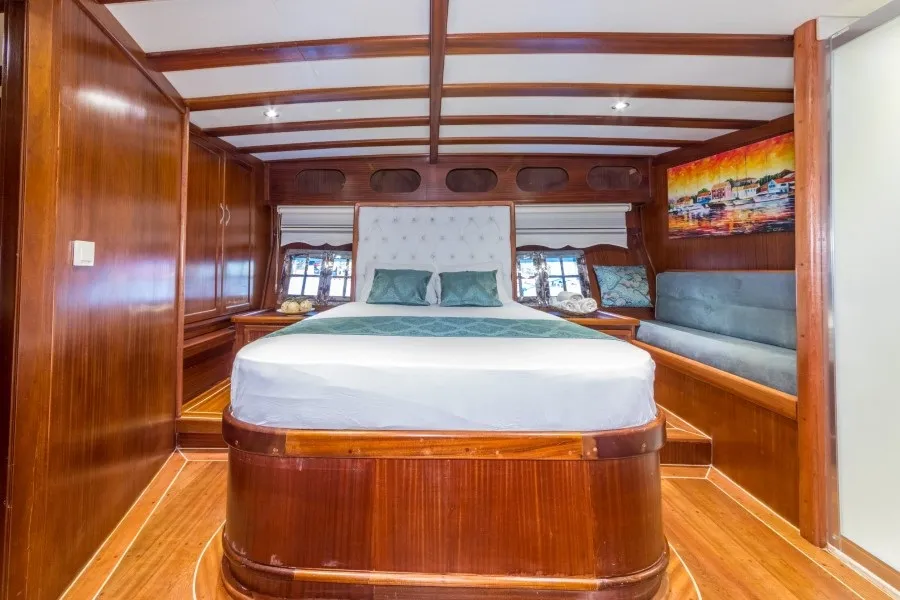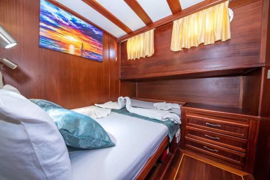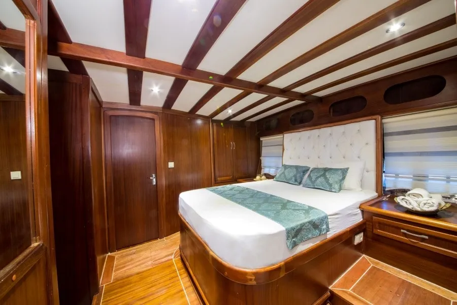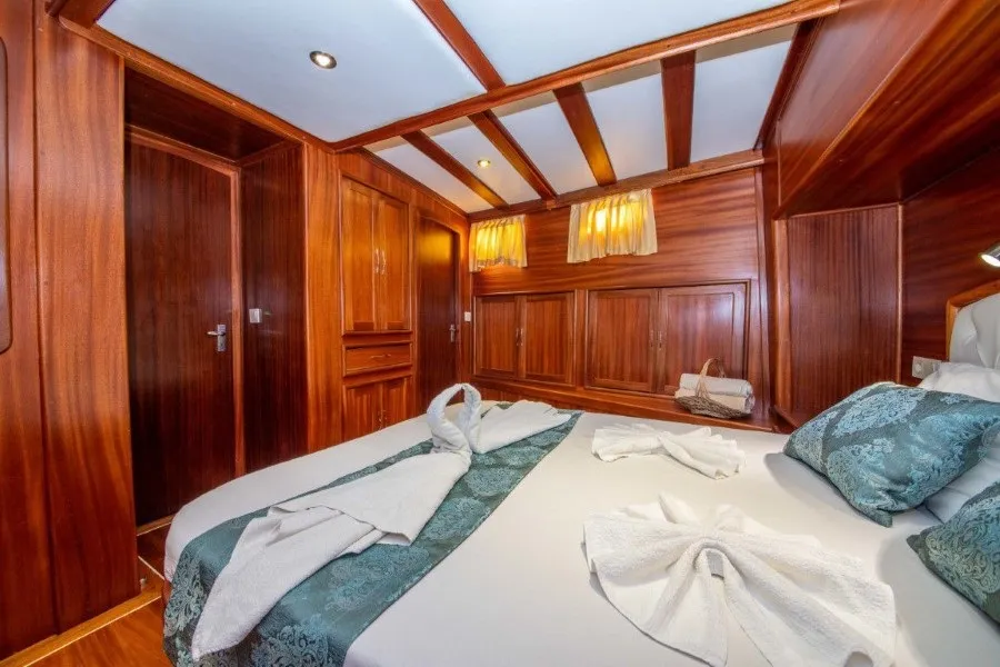 5 kabinli tekne kiralama seçenekleri arasında öne çıkan Gökçe’de; 2 adet ebeveyn banyolu master, 2 adet double ve 1 adet twin kabin yer almaktadır. 10 kişilik misafir kapasitesine sahip teknemizin tüm kabinlerinde gün içinde 4 ila 6 saat arasında klima hizmeti sunulmaktadır.
