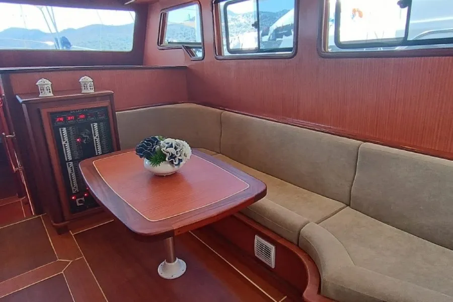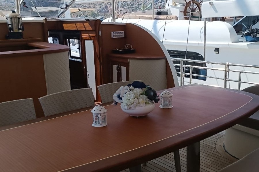 Tam donanımlı mutfağımızda deneyimli şefimiz tarafından hazırlanan lezzetli yemekler, arka güvertede yer alan geniş yemek masasında misafirlerimize sunulmaktadır. Ayrıca arka güvertede konforlu bir oturma grubu, bar ve dümen alanı bulunmaktadır. Ön güvertede ise her misafir için yeterli sayıda güneşlenme minderi ve oturma alanı mevcuttur.