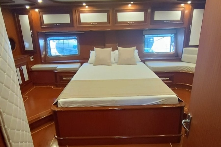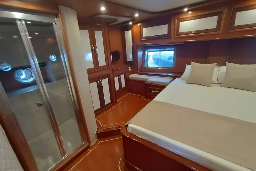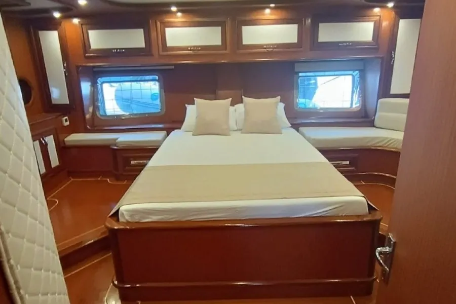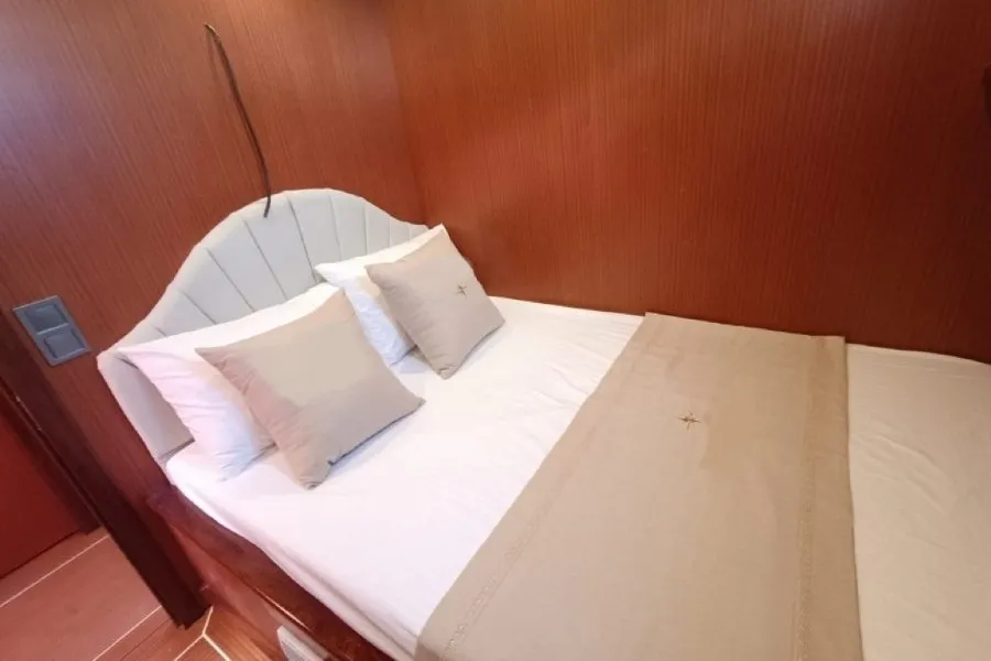Gülenay Gulet, 2 master ve 2 double kabinden oluşan toplam 4 kabiniyle, 8 kişilik aile veya arkadaş gruplarını rahatlıkla ağırlayabilmektedir. Tüm kabinlerde duşakabinli banyo, wc, banyo ve el havlusu ile günlük 4-6 saat hizmet verebilen klima sistemi bulunmaktadır. Misafirlerimizin konforu için tüm detaylar özenle düşünülmüştür.